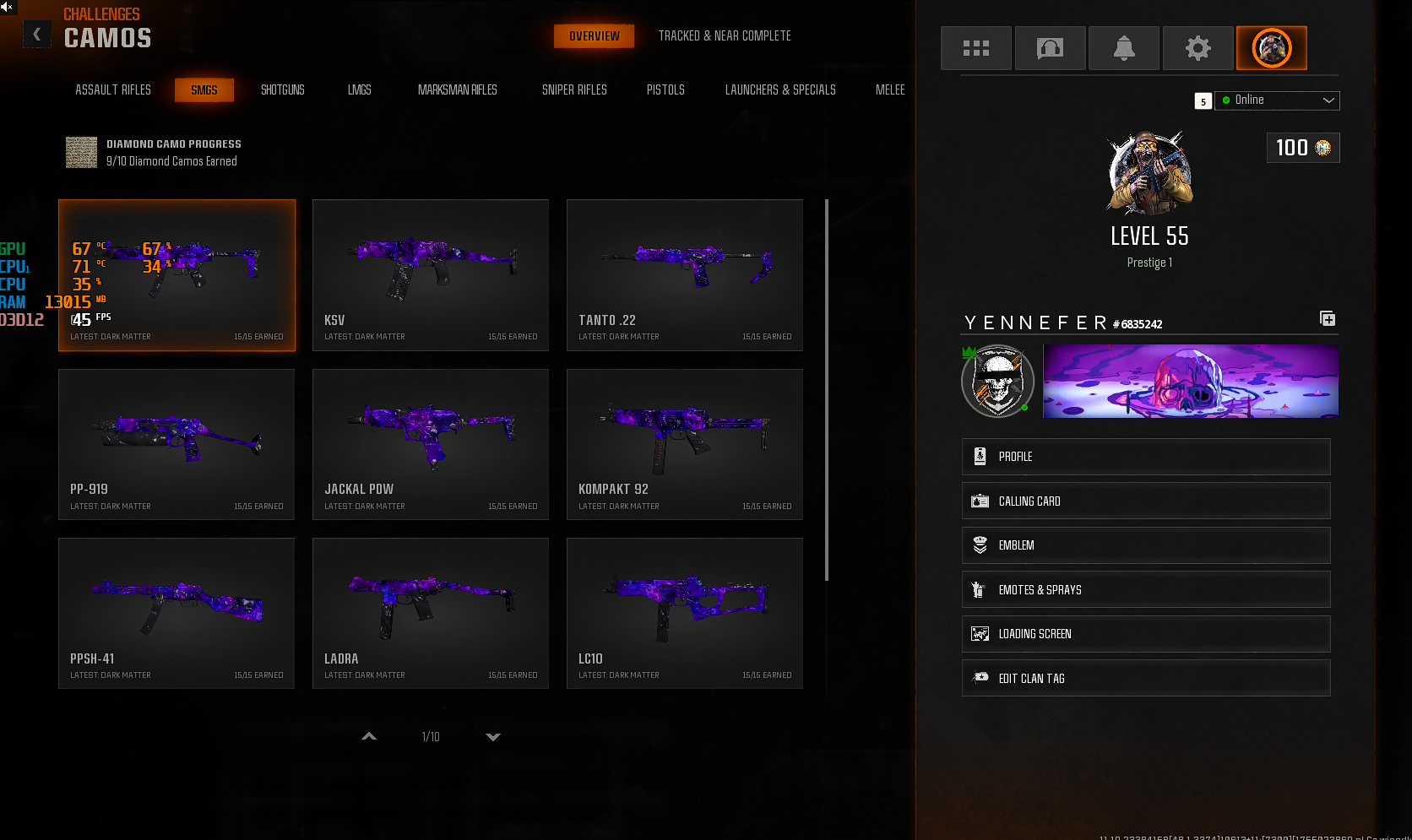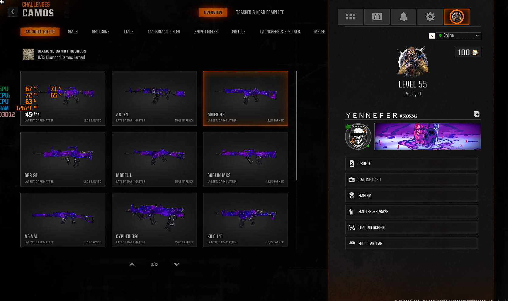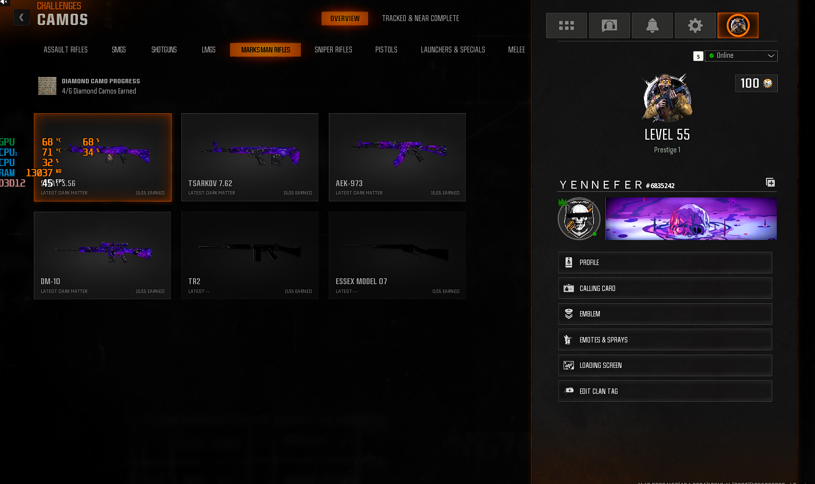 γ Dark Matter Hard Unlocked + Prestige 1 γ β All Multiplayer Camos Unlocked β¨ Prestige 1 Ready β‘ Dark Matter Legit Unlocked on all 33 Black Ops 6 Guns β‘ Linkable to STEAM / BNET / XBOX / PSN