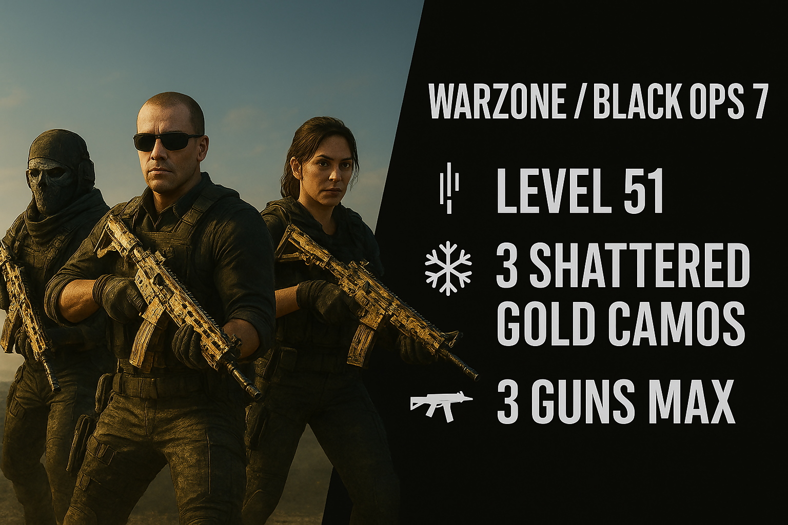 ✅ Black Ops 7 / WarZone ✅ Level 51 ❄️ 3 Shattered Gold Camos 🔫3 Guns Max 🎖️ 18 Operators