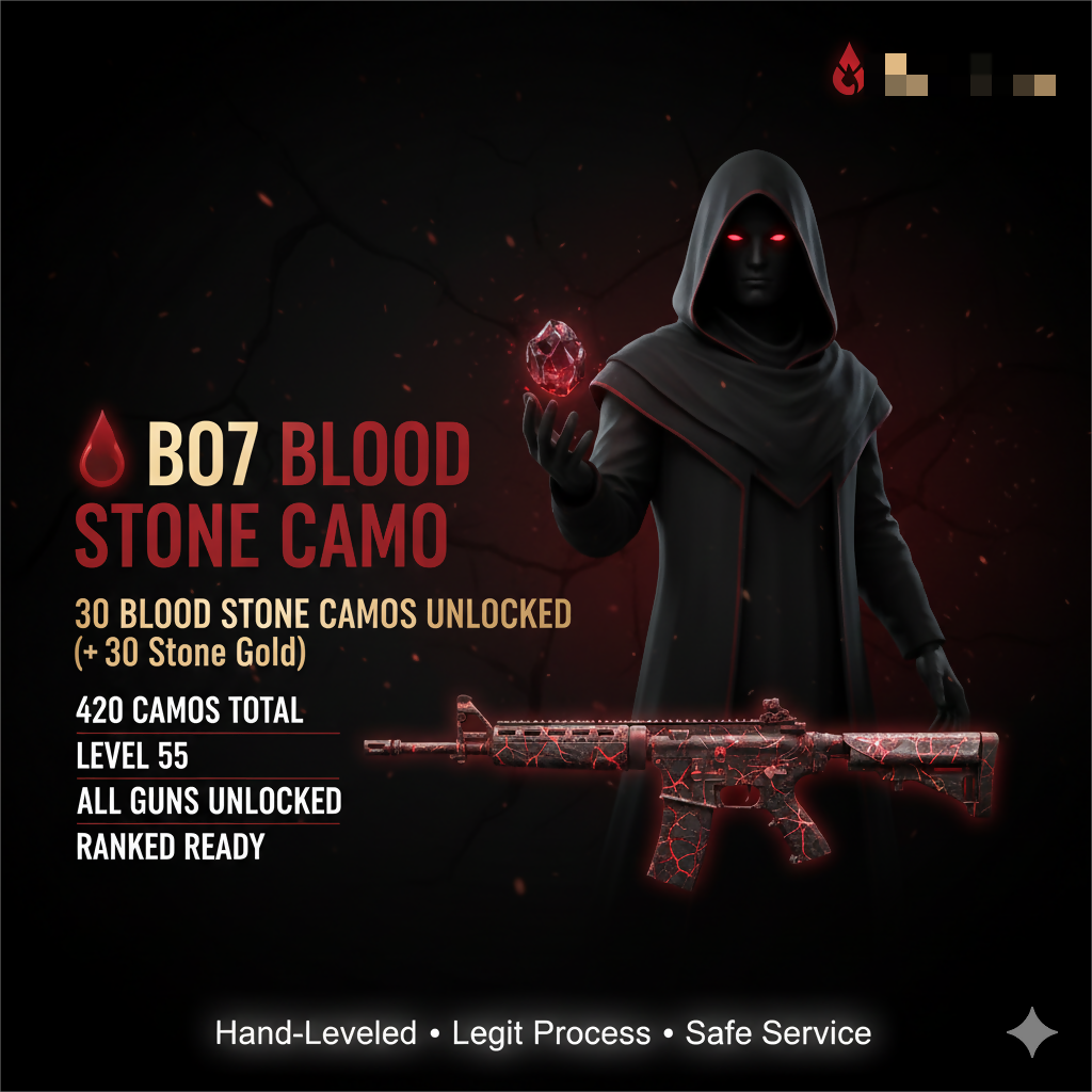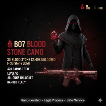 🩸 BO7 🩸 30 Bloodstone Camo Unlocked ( + 30 Stone Gold )🩸 420 Camos 🩸 Level 55 🩸 All Guns Unlocked 🩸 Ranked Ready 🩸 Hand leveled 🩸 Linkable: Steam / Battle.net / PSN / Xbox 🩸 | All Military Camo + 30 Stone Gold #9wr6qV