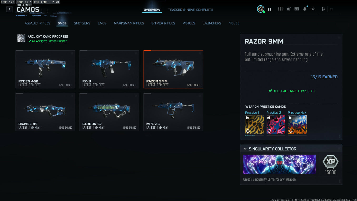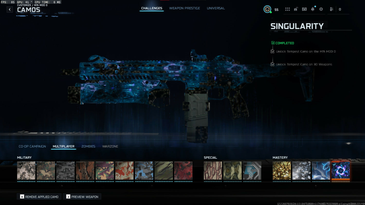 Singularity on all BO7 weapons 🐨 Level 55 Prestige 1 🌟 Arclight camo active 🎯 Tempest done 💎 Shattered Gold camo set 🔗 Linkable to Steam/PSN/Xbox/Bnet 🔑 Completely Legit 🚀 Instant Delivery