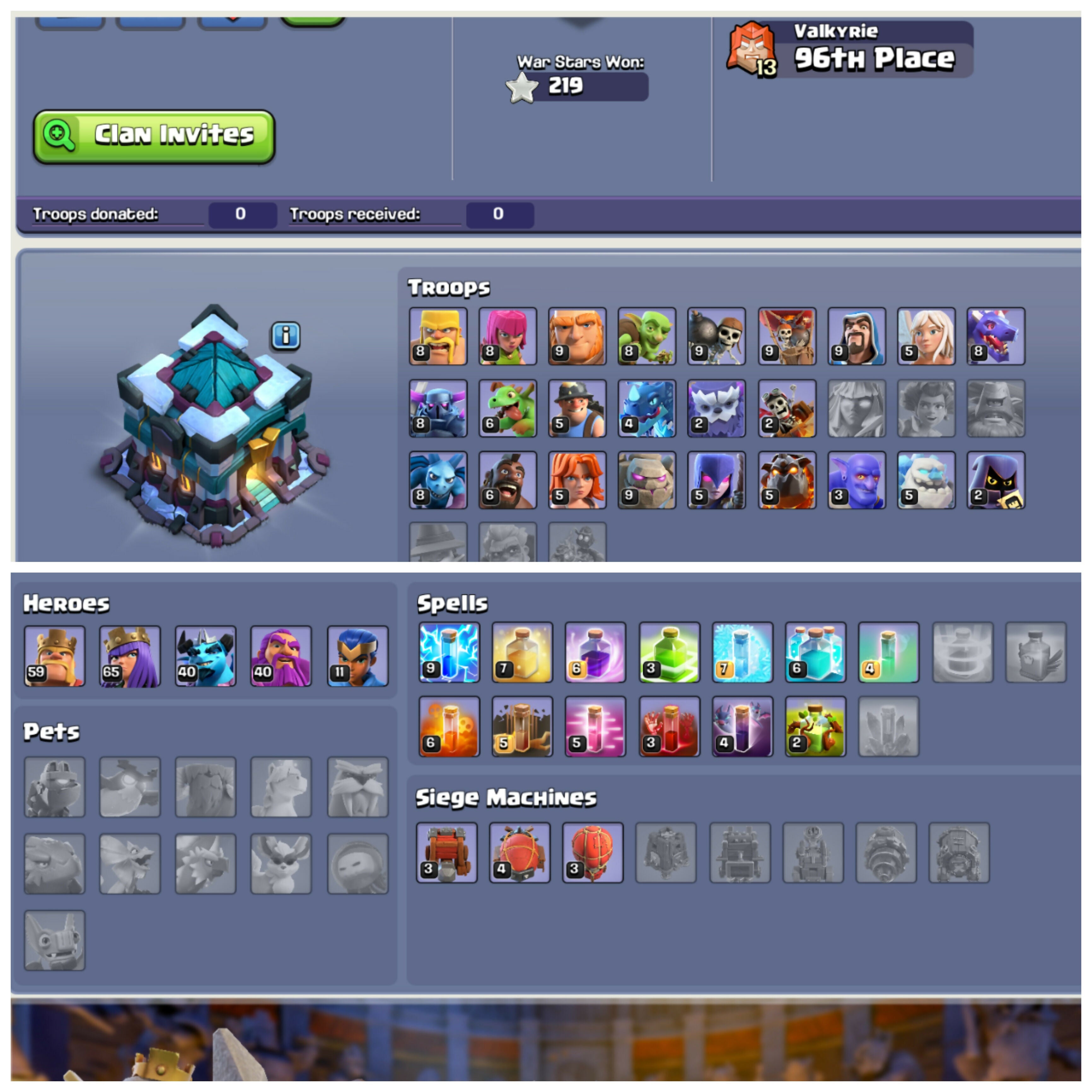 TH13 Max Type : Walls Fully Maxed Out | XP 143 | Heroes: BK59 : AQ65 : MP40 : GW40 : RC11 | Name Changeable , 5 Skins & Stacked Magic Items | Android/iOS