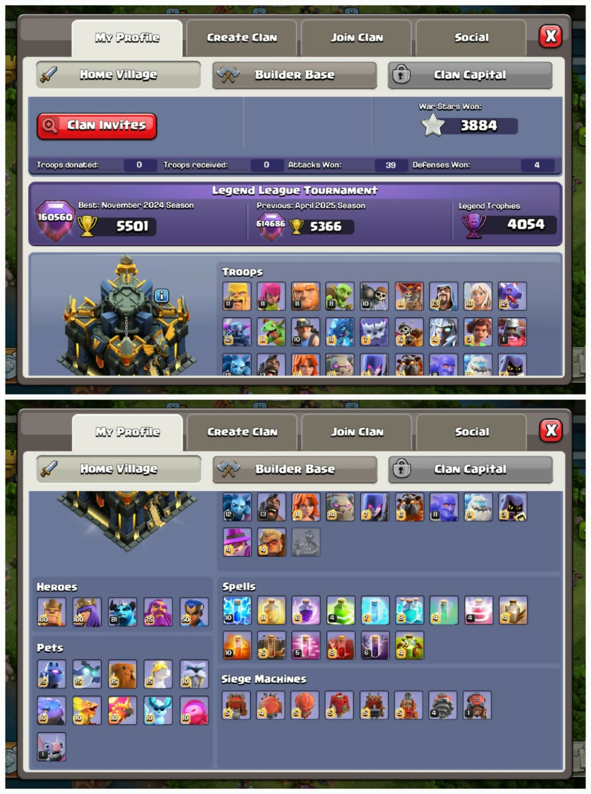 STRONG TH17 HEROES [100-100-81-75-50] 6 EPIC EQUIPMENTS [3 MAX] 400+ MEDALS 3K GEMS MAX PETS NAME CHANGABLE ✨INSTANT DELIVERY