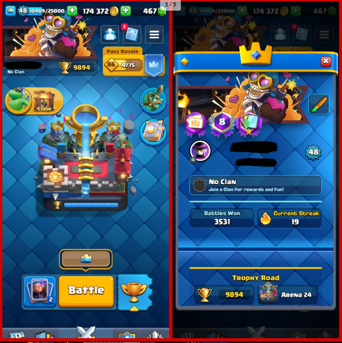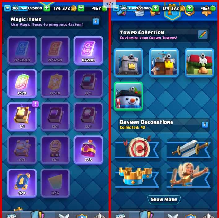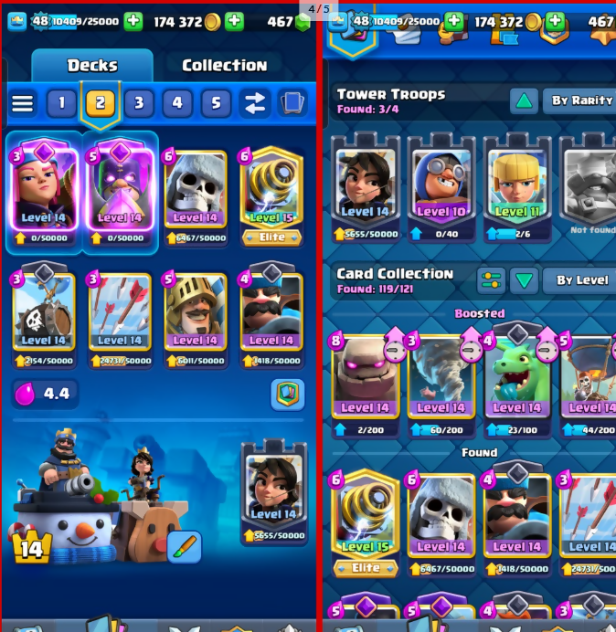 ☘️KT (14) ☘️ [10 MAX] ☘️48 XP?3 EVO ✨9 LVL 14 CARDS - 1 ELITE ✨9900 TROPHY ? ARENA 24 ? 119 CARDS✨ ? 8 YEARS BADGE ✨68 RARE EMOTES ✨[460+ GEMS