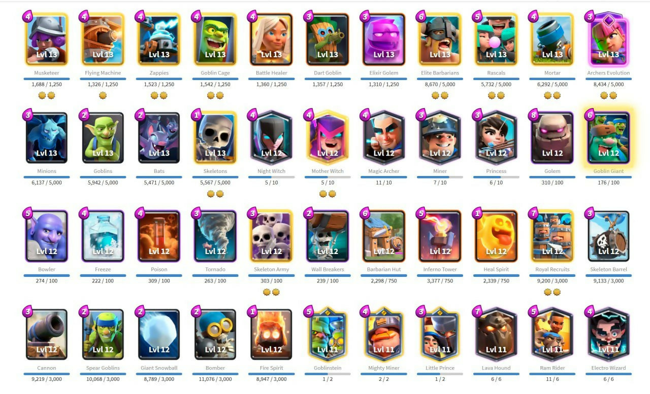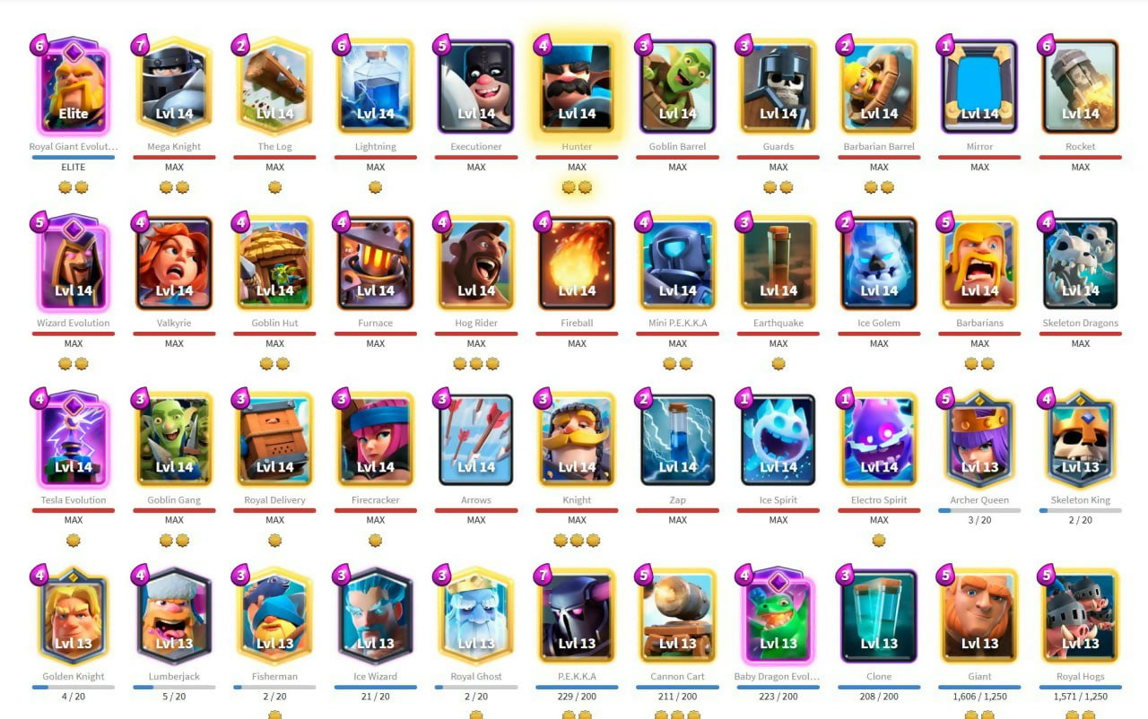 A bunch of cards, many of which are pumped to level 14 (and 13 with the ability to upgrade to 14)