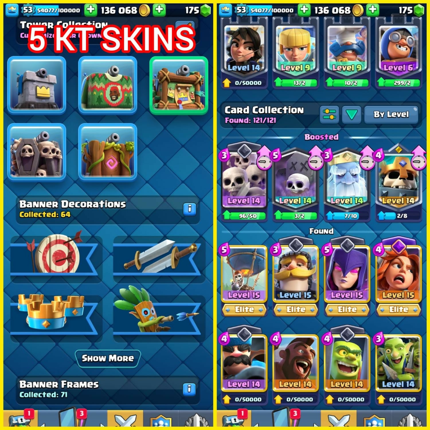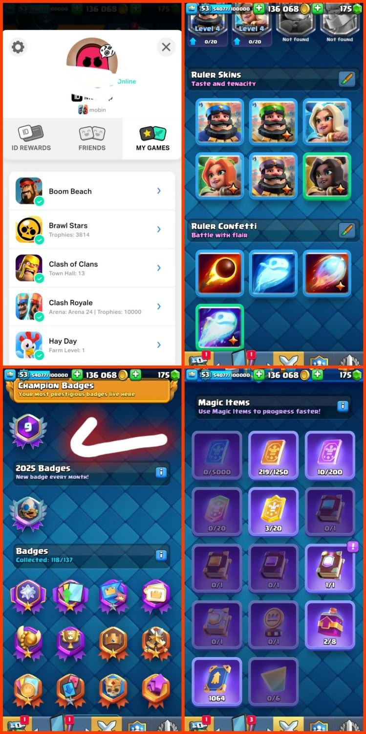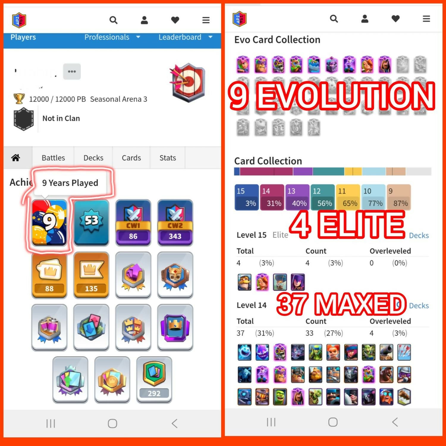 🎯 9 YEAR OLD ACCOUNT 🕰️🏆 12,000 TROPHIES 🥇 | 🎮 ARENA 24 (SA-3)⚡ 37 MAX CARDS | 🛡️ 4 ELITE CARDS🔥 9 EVOS | 🌟 XP 53 | 👑 KT14🎨 5 KING TOWER SKINS