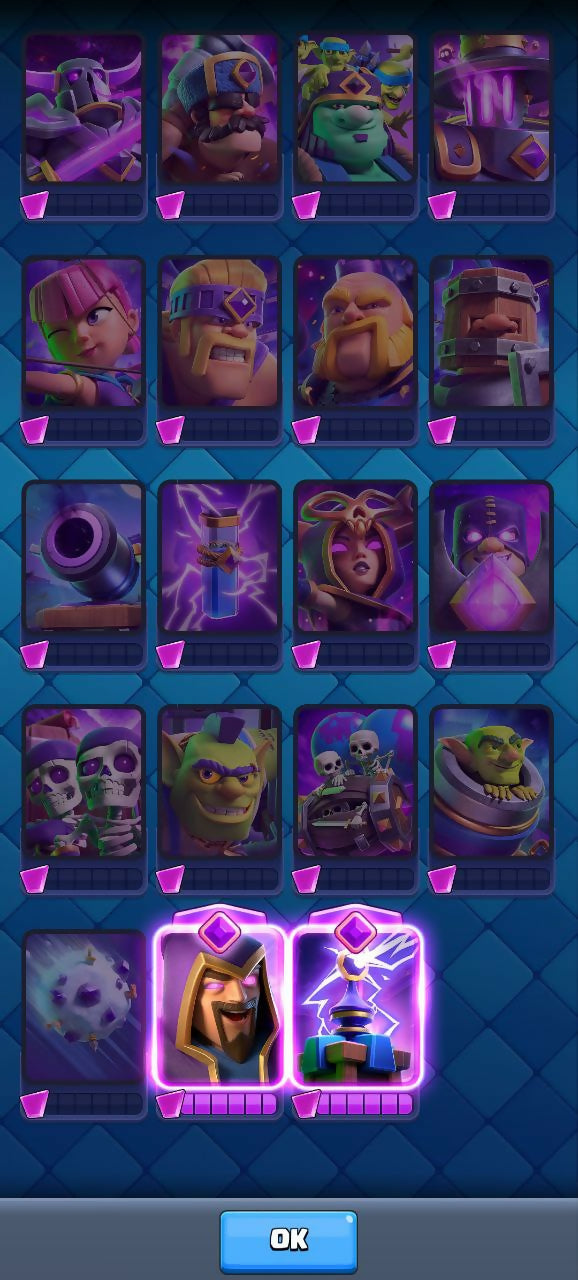 • 🃏 20 Legendary Cards (e.g. Mega Knight, Hell Hound, Sparky, Goblin Machine, Cemetery, Ram Rider, Witch Granny, Night Witch, Lumberjack, Magic Archer, Phoenix, Thunderer, Flame Dragon, Fisherman, Bandit, Royal Ghost, Ice Sorcerer, Miner, Princess, Log)