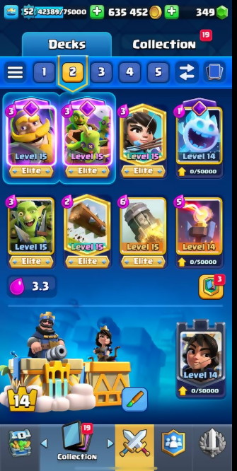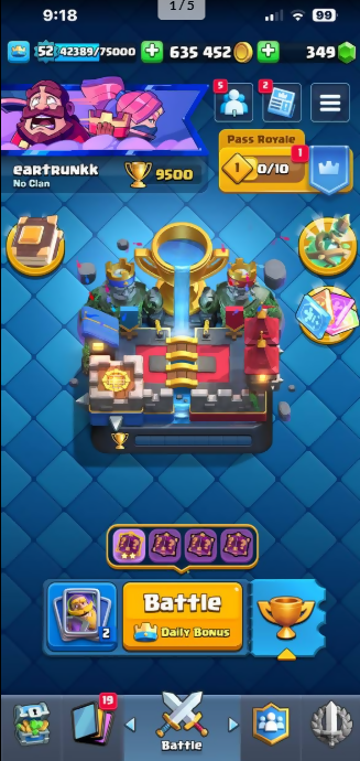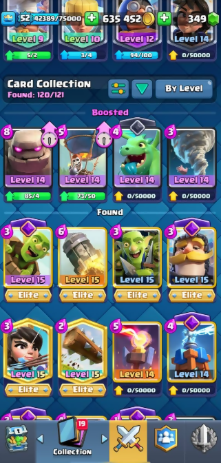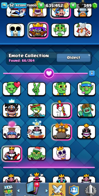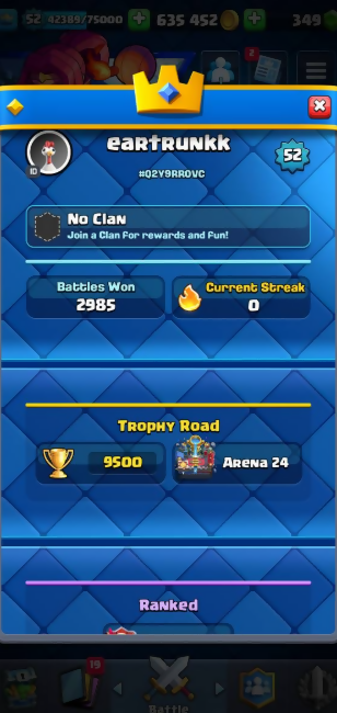 ?9.5k cups, KT 14, 52 lvl, 6 cards 15 lvl, 9 cards 14 lvl, 66 emoji, 7 evolutions, Description ?