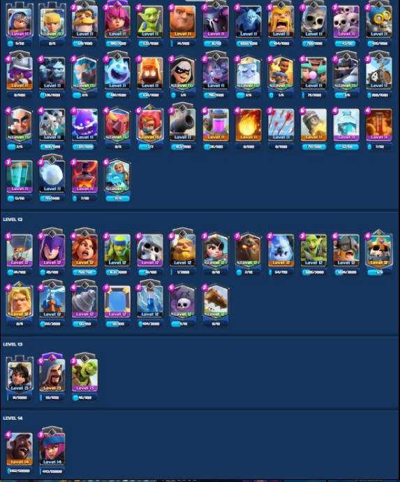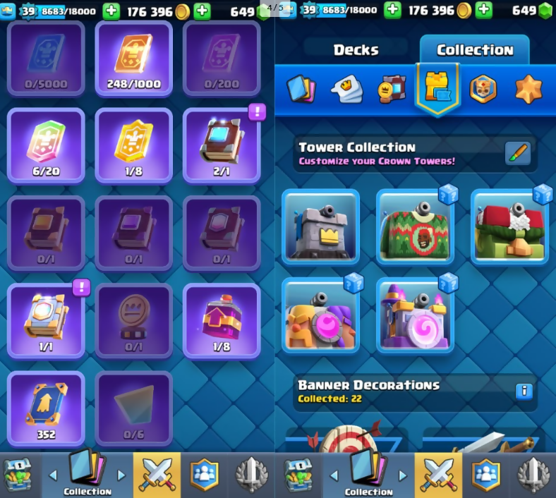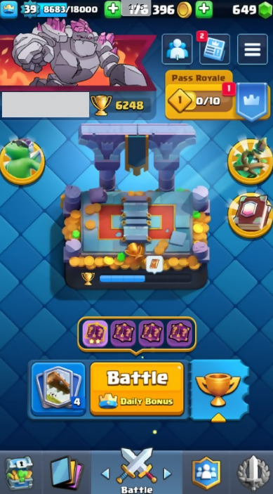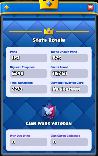 ? KT 13 ? 6248 Trophy ? 39 LVL ? 115 Cards ? 42 Emotes ? 649 Gems ? 176 k Gold ?