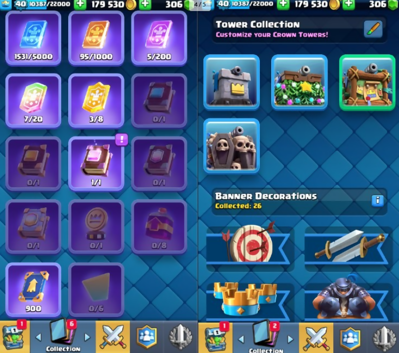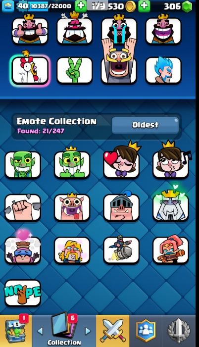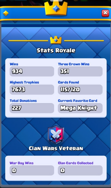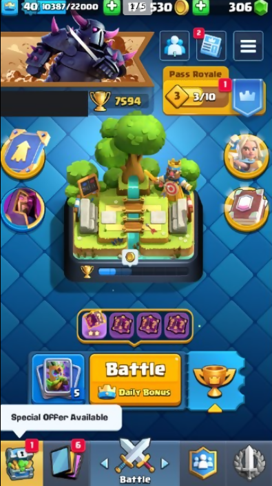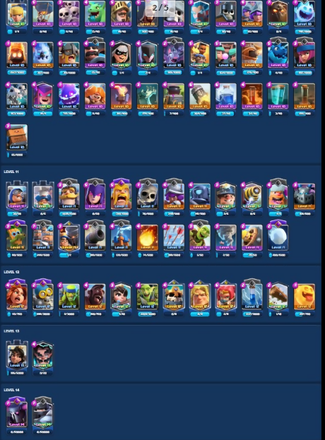 ? KT 13 ? 7594 Trophy ? 40 LVL ? 115 Cards ? 21 Emotes ? 306 Gems ? 179 k Gold ?