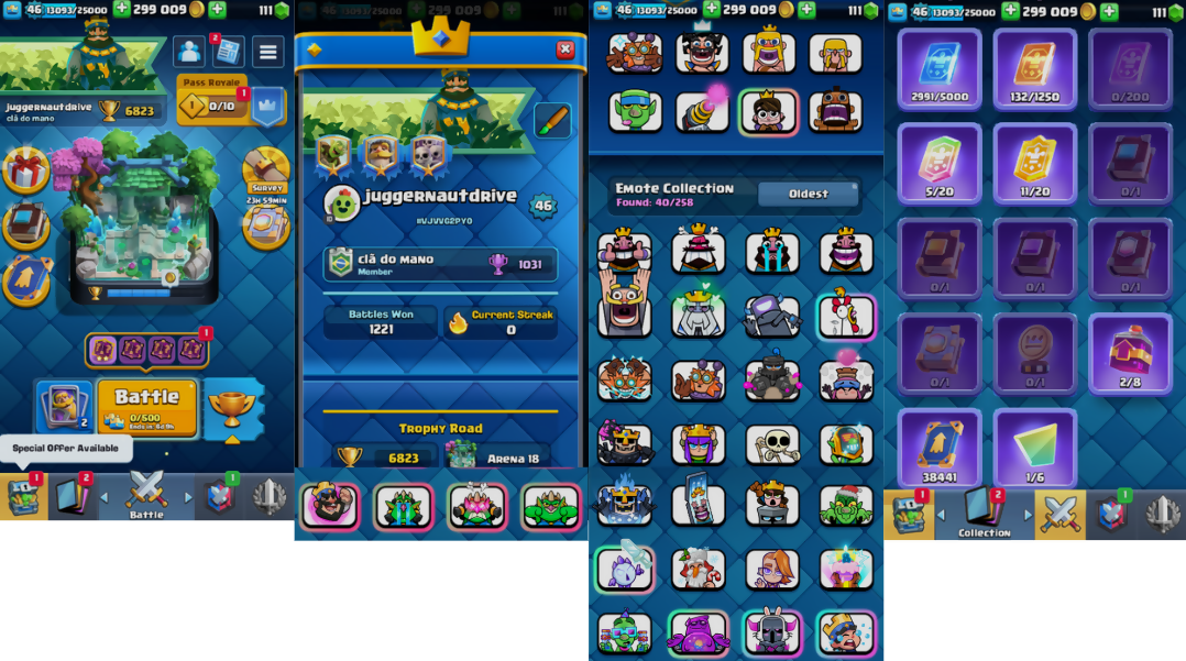 ? KT 14 ? 3 Elite Cards + 115 Cards ? 4 Evo ? Level 46 ⭐Emotes: 40 ? 6825 Max Trophies ⭐Gold: 299009 ? Instant Delivery ? Full Access