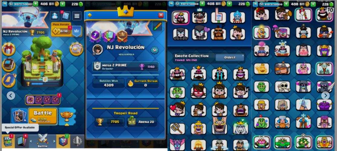 ? KT 14 ? 3 Elite Cards + 22 Cards Level 14 + 115 Cards ? 4 Evo ? Level 51 ⭐Emotes: 69 ? 7998 Max Trophies ⭐Gold: 408811 ? Instant Delivery ? Full Access