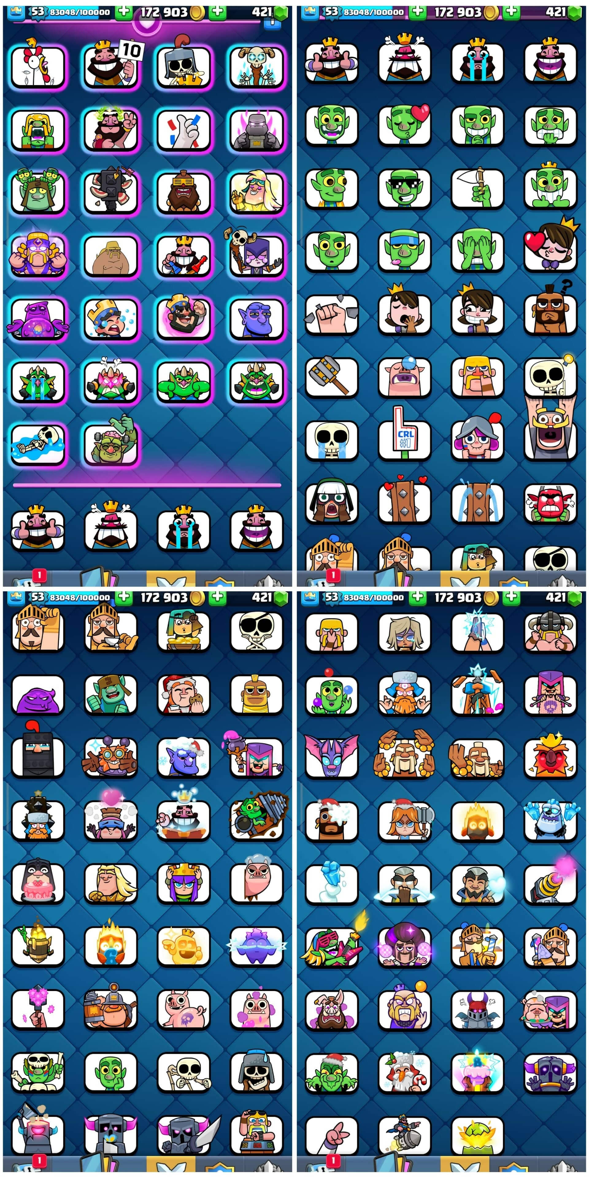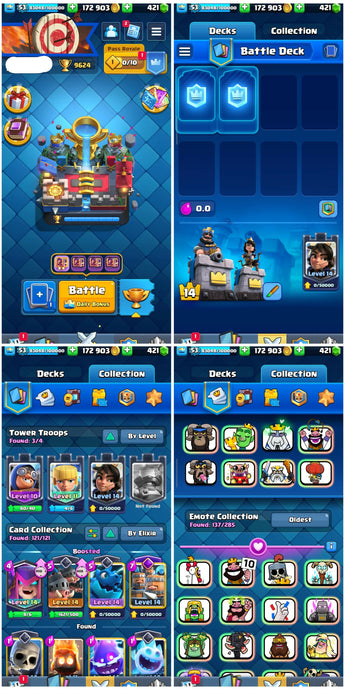 KT 14 | LVL 53 | RARE EMOTES | 9634 TROPHIES | 8 YEARS OLD | 43 MAX CARDS | 3 ELITE CARDS | 5 EVOLUTION CARDS | RAM CHEWING GRASS | GOBLIN KISSING TROPHY