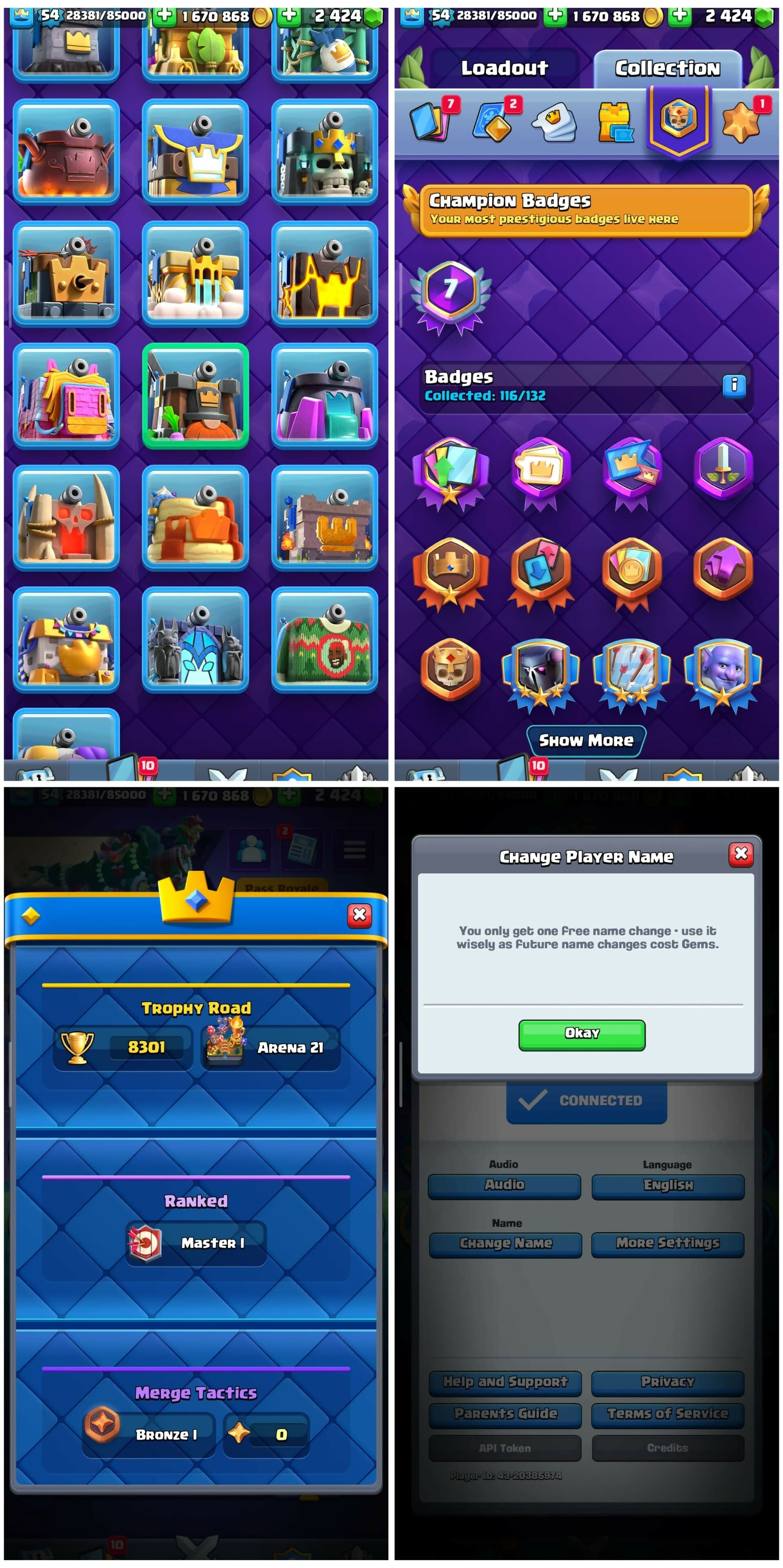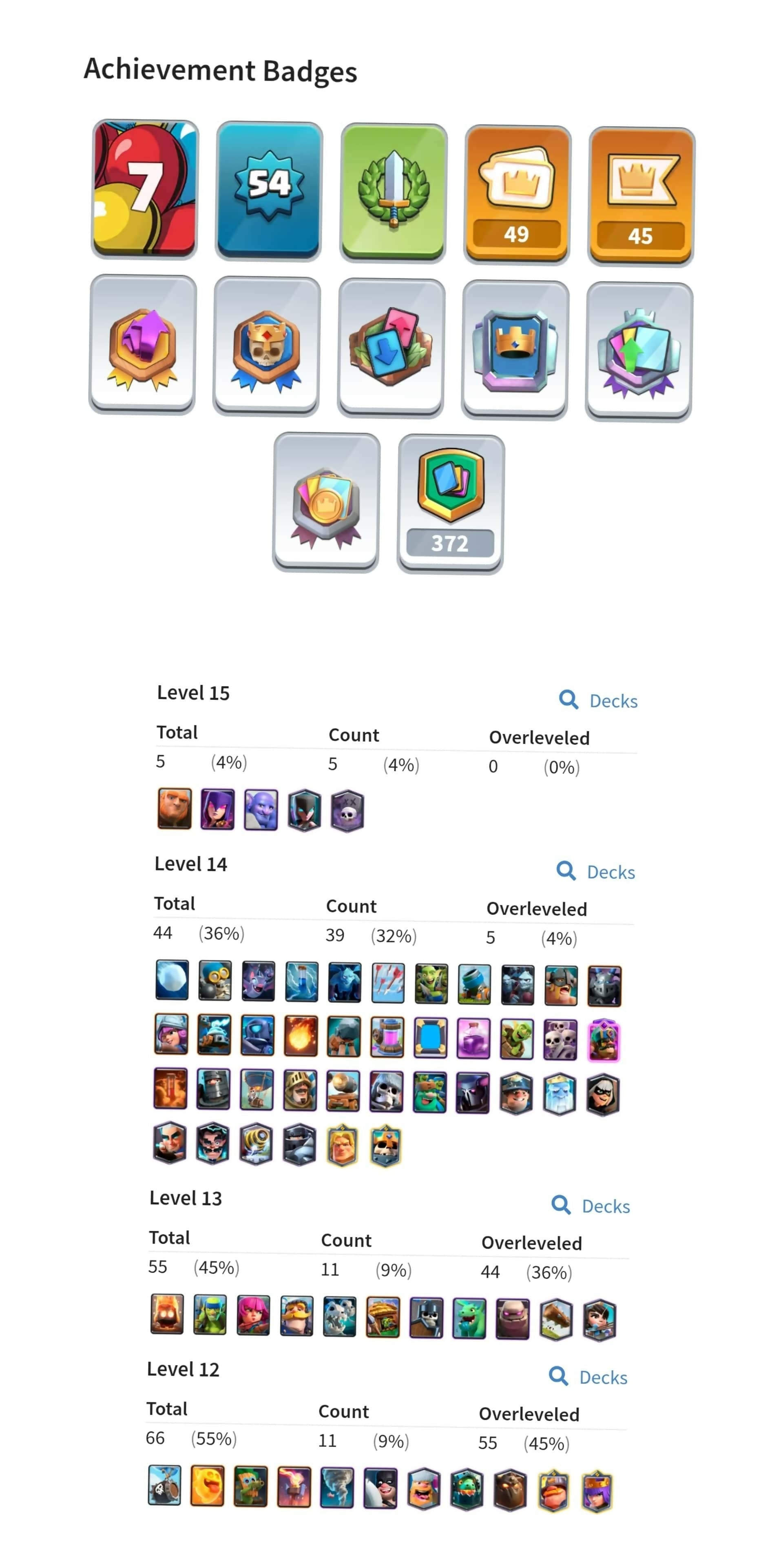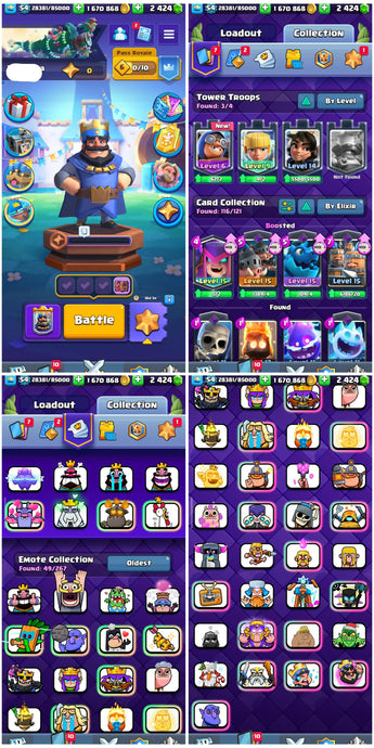 KT 15 | 8.301 Trophies | 116 Cards | 44 LVL 14 Cards | 5 LVL 15 Cards | 7 Years Old account | 19 Tower Skins | 49 Emotes | 1.6m Gold | 2400 Gems | lvl 54