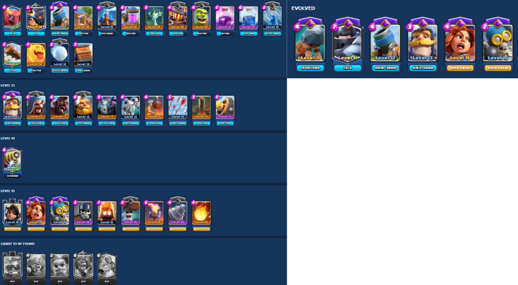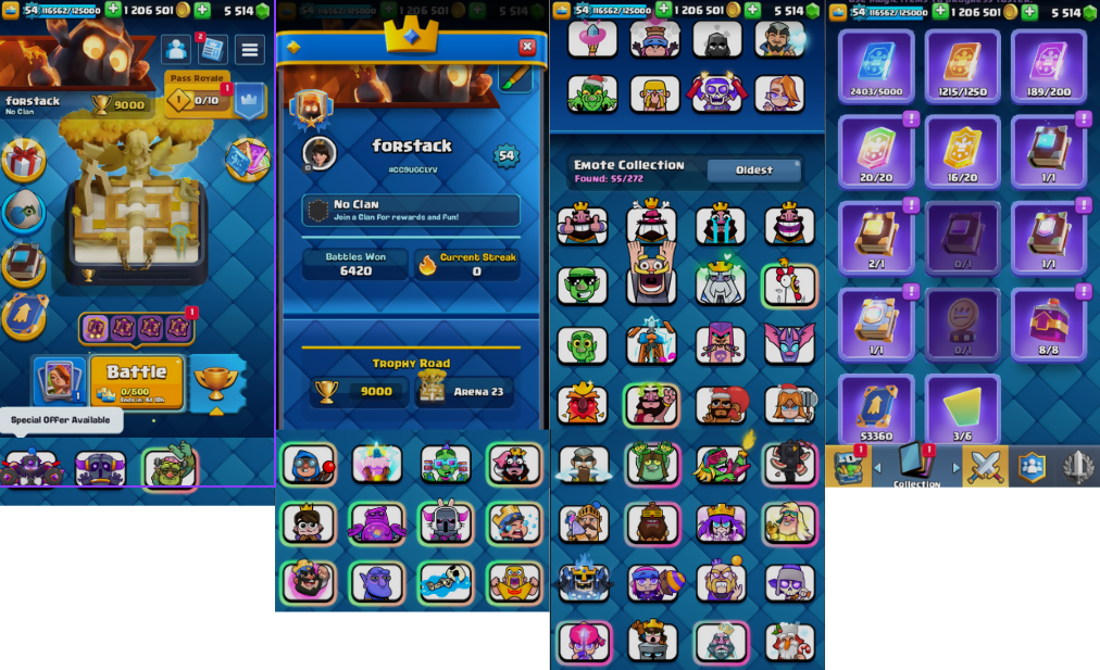 ⚡️KT 15 ⚡️ 8 Elite Cards + 116 Cards 6 Evo ⚡️ Level 54 ⭐Emotes: 55 ⚡️ 9000 Max Trophies ⭐Gold: 1206501 Gems: 5514 Changeable Name Full Access