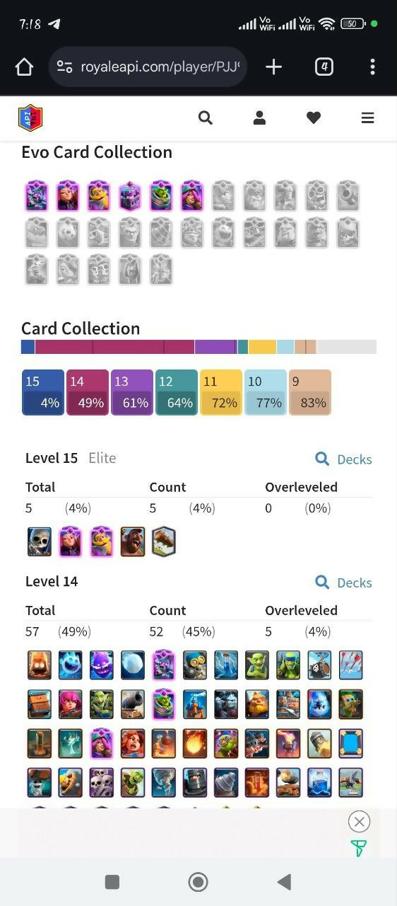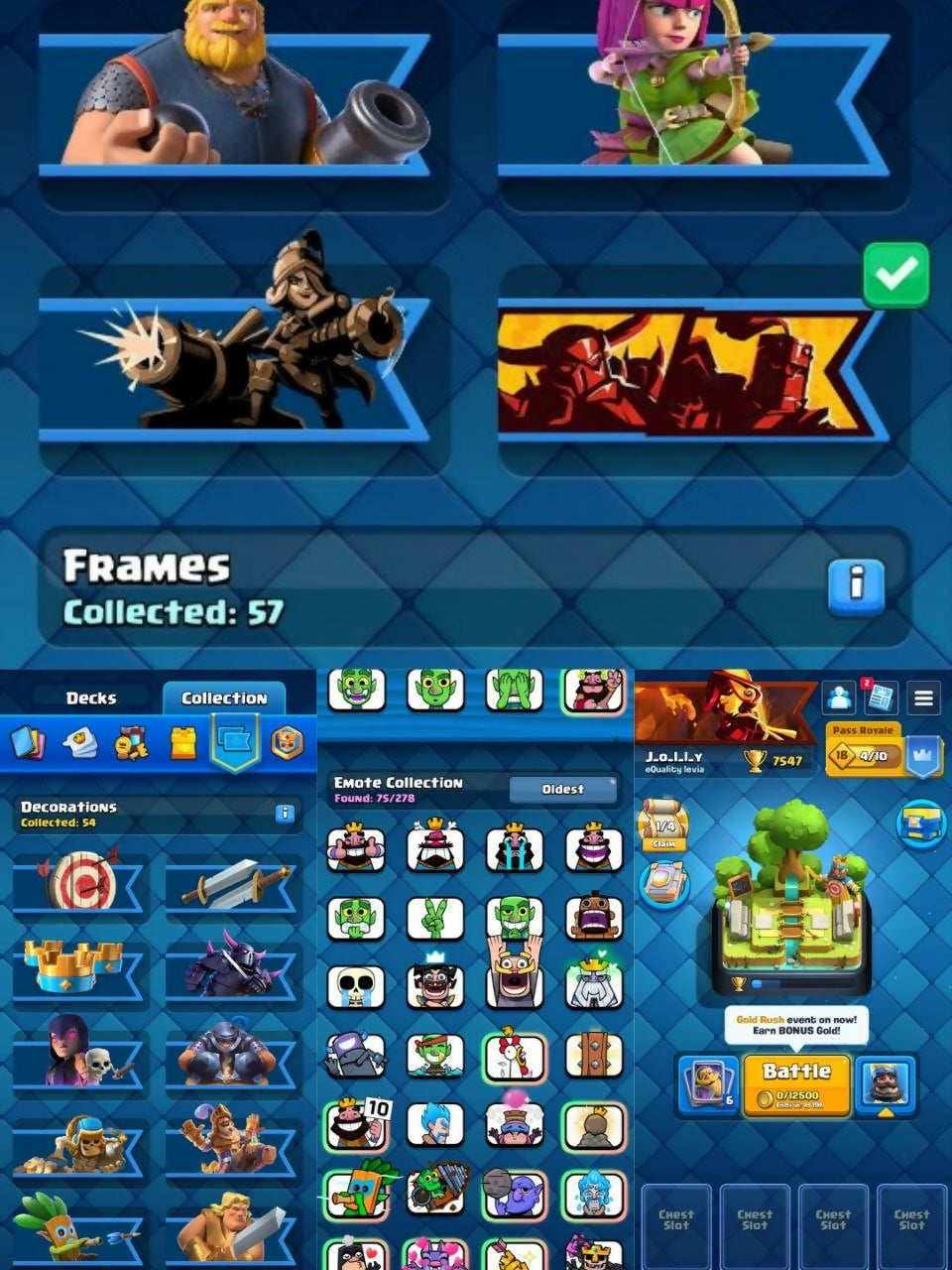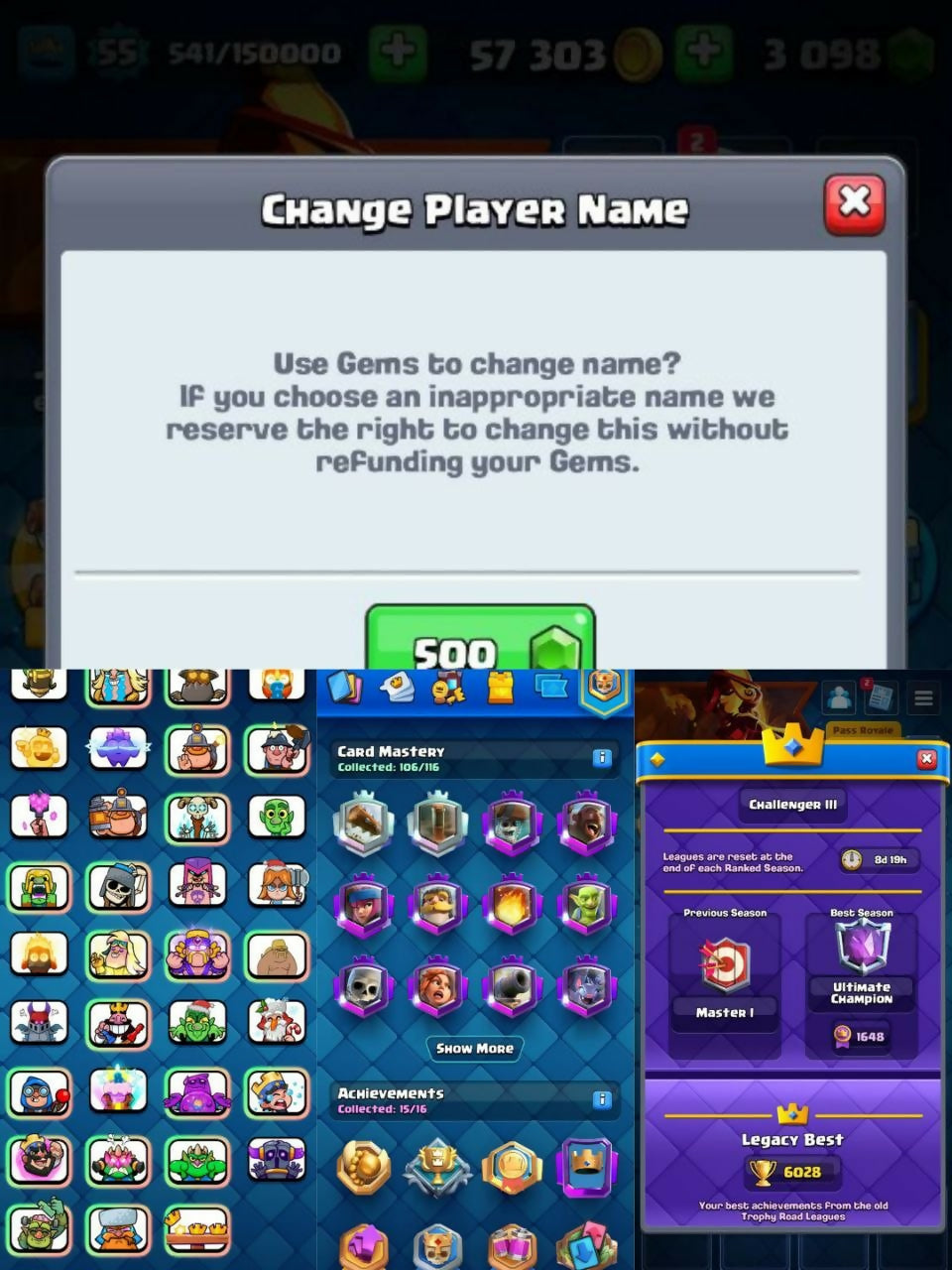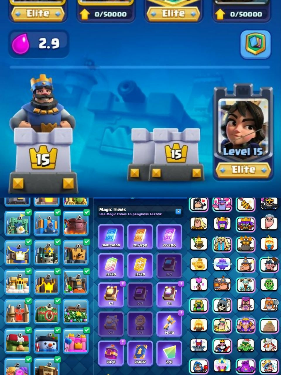 KT 15? ULTIMATE CHAMPION 1648?MAX CARDS 57?5 ELITES?6 EVOLUTION ?TROPHIES 7547?RENAME 500 ?RAREST EMPEROR KING EMOTE?GEMS 3098?TOWER SKINS 19?MANY MAG