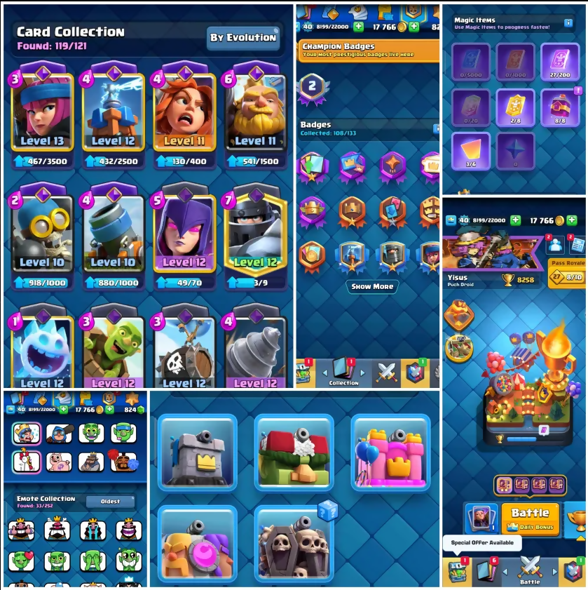 ✅ High-trophy account in Challenger II ✅ 8 Evolution cards unlocked ✅ Near-complete card collection (119/121) ✅ Includes tower skins and emotes ✅ Perfect for competitive players or resellers