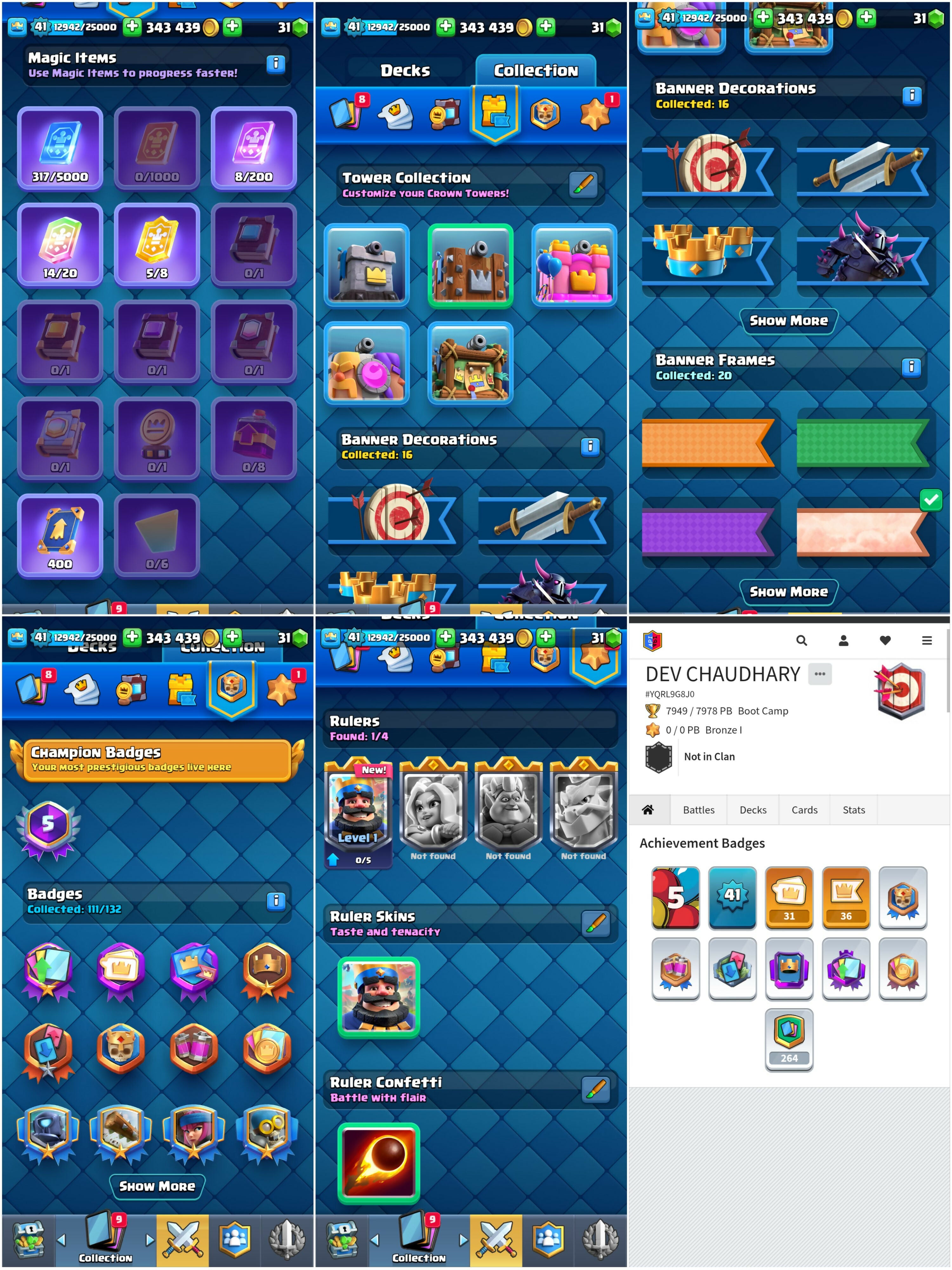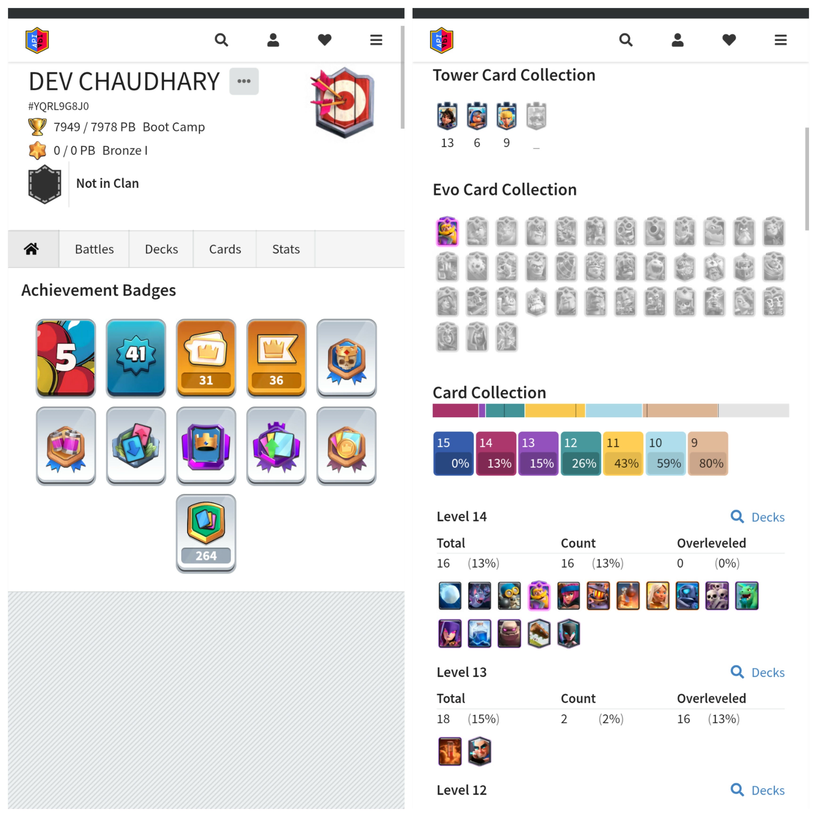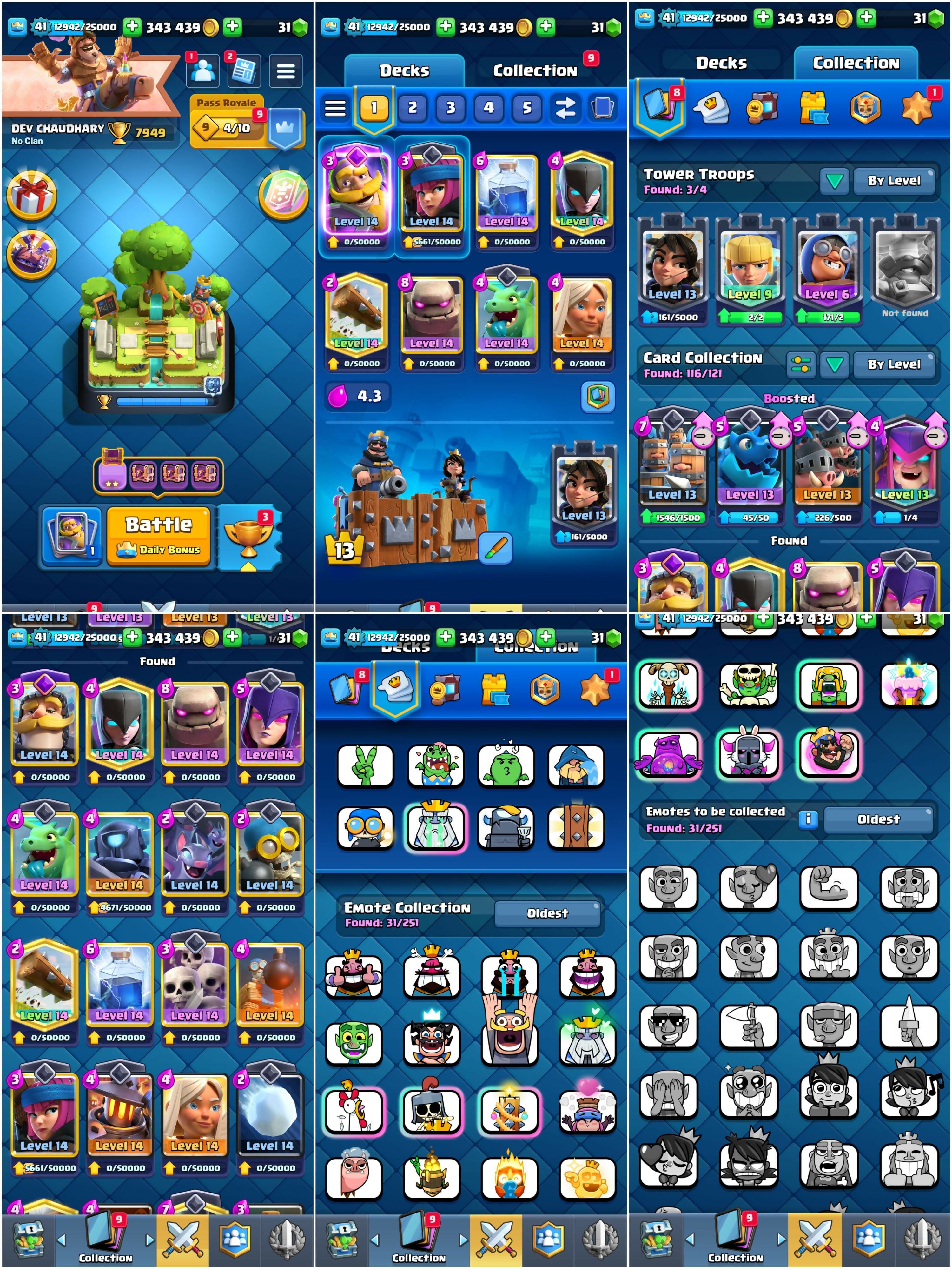 Level 41 + KT 13 | 5 Years Played Badge | 16 Max Cards , 1 Evo | 31 Emotes & 5 Tower Skins | Android/iOS