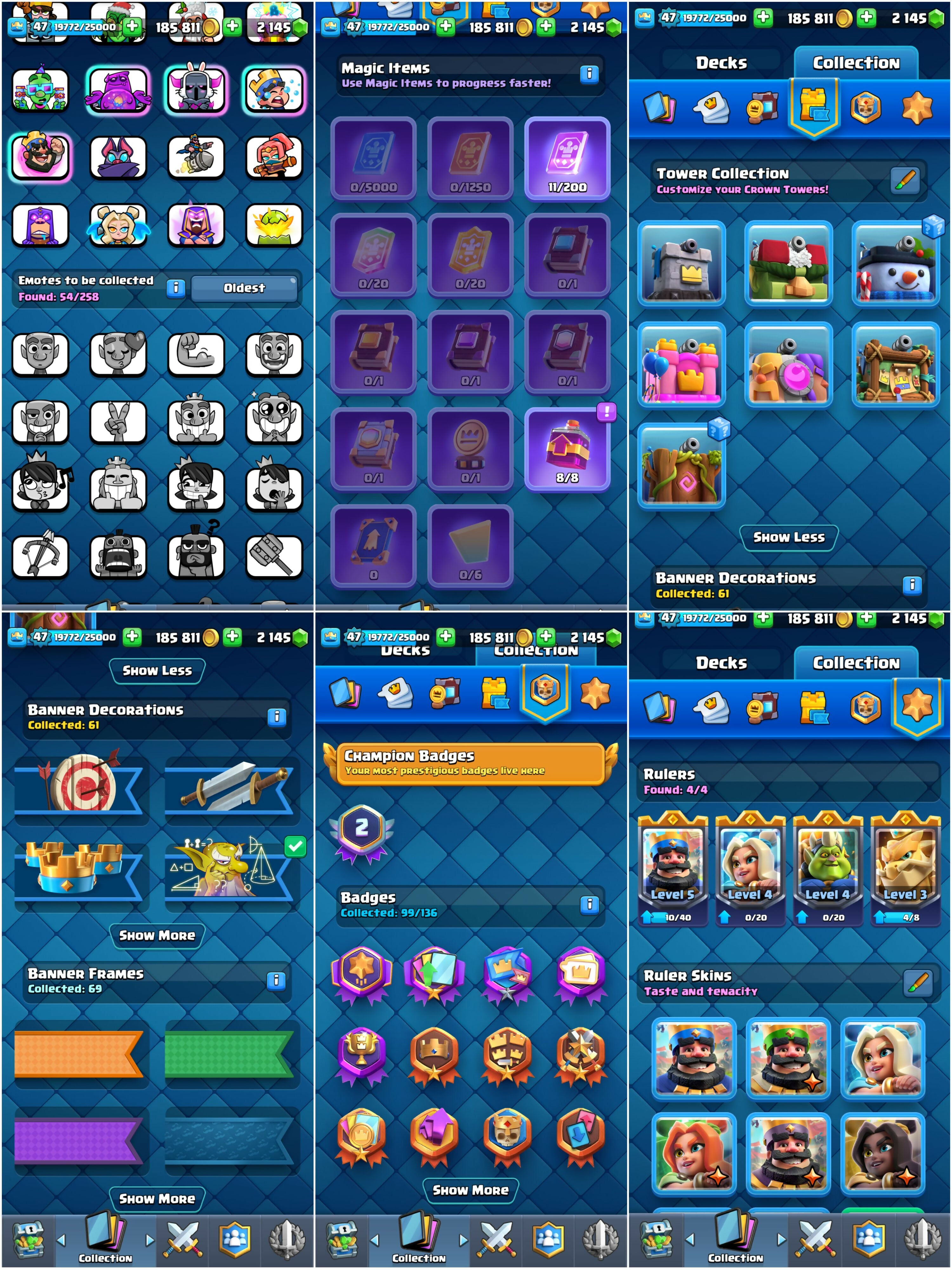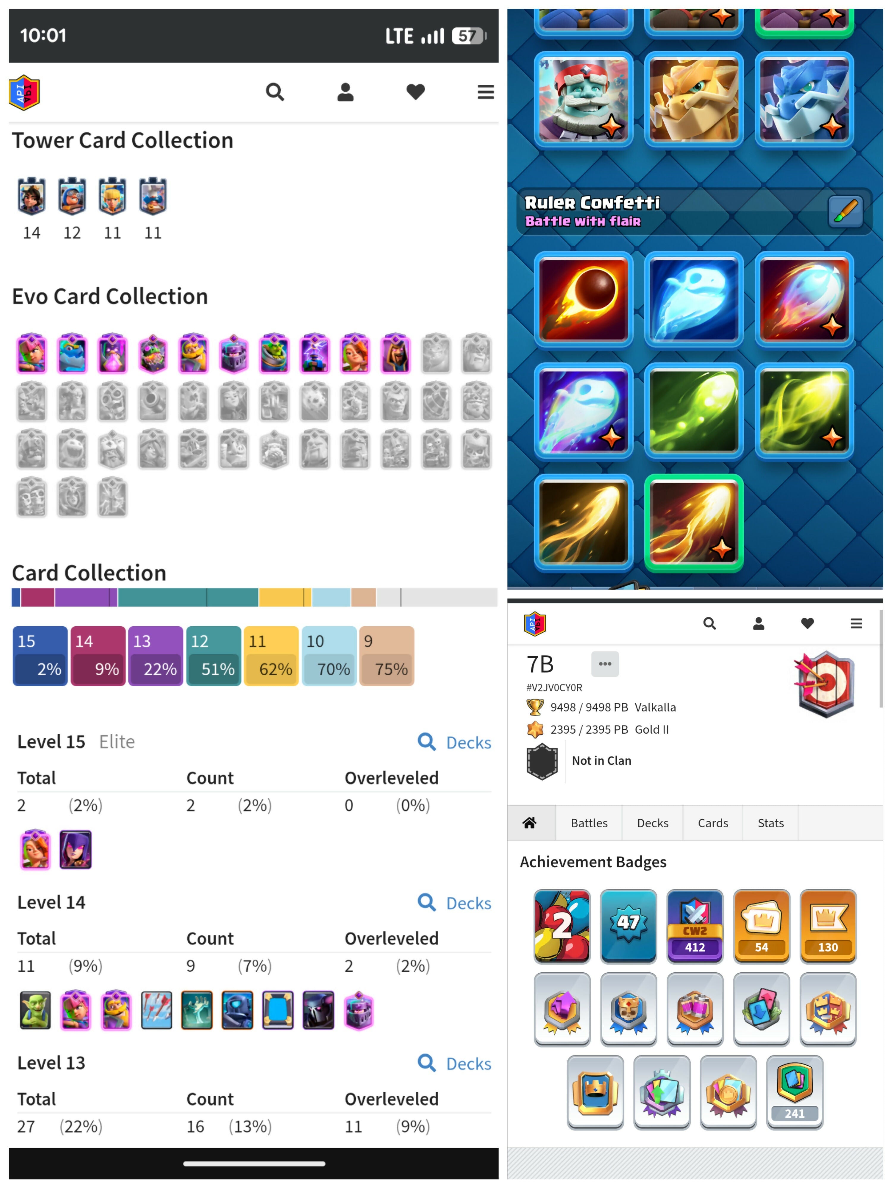 Level 47 + KT 14 | 9400 Trophies : 2100 Gems | 11 Max Cards , 2 Elites , 10 Evos | 54 Emotes & 7 Tower Skins | Android/iOS