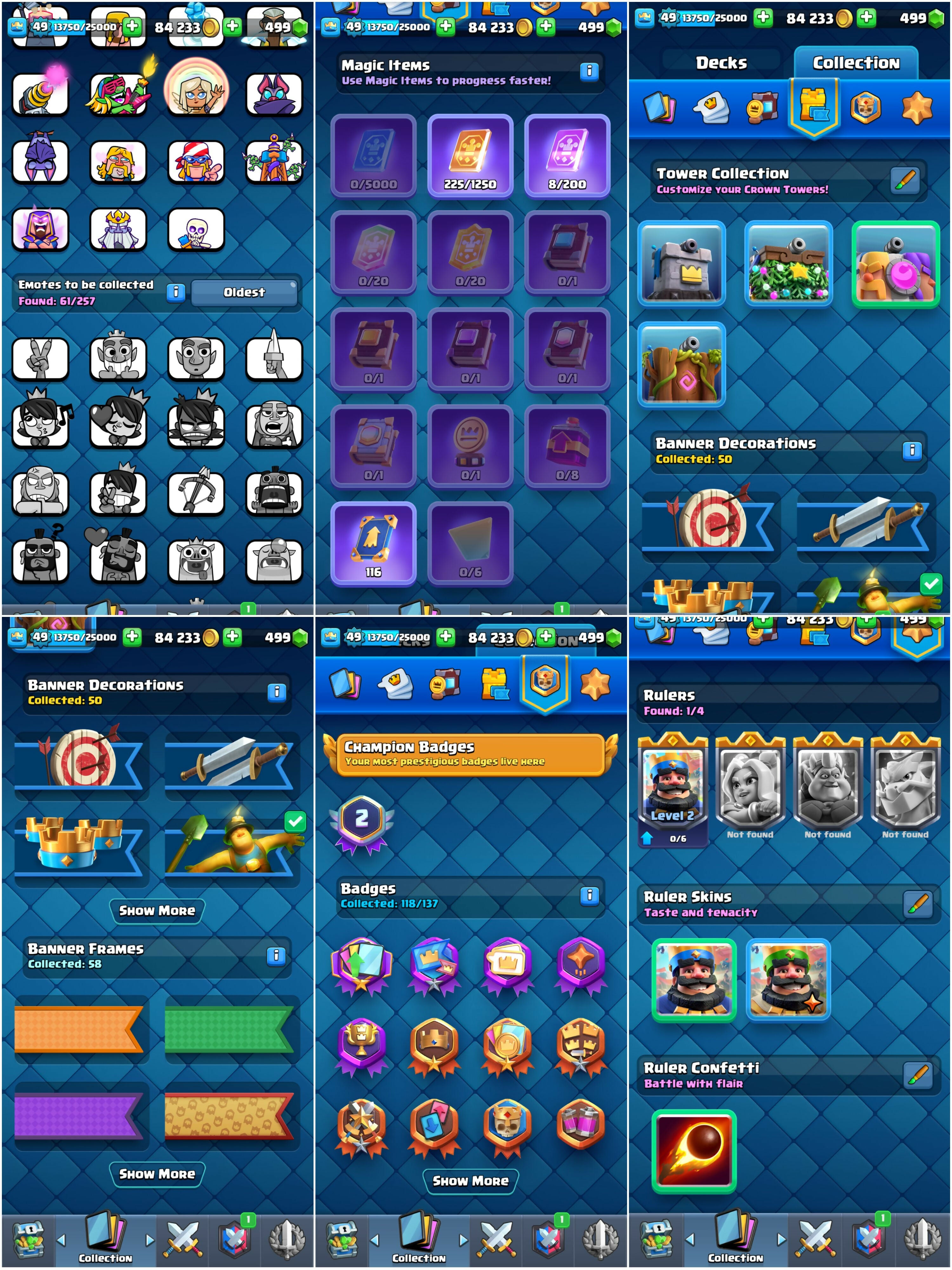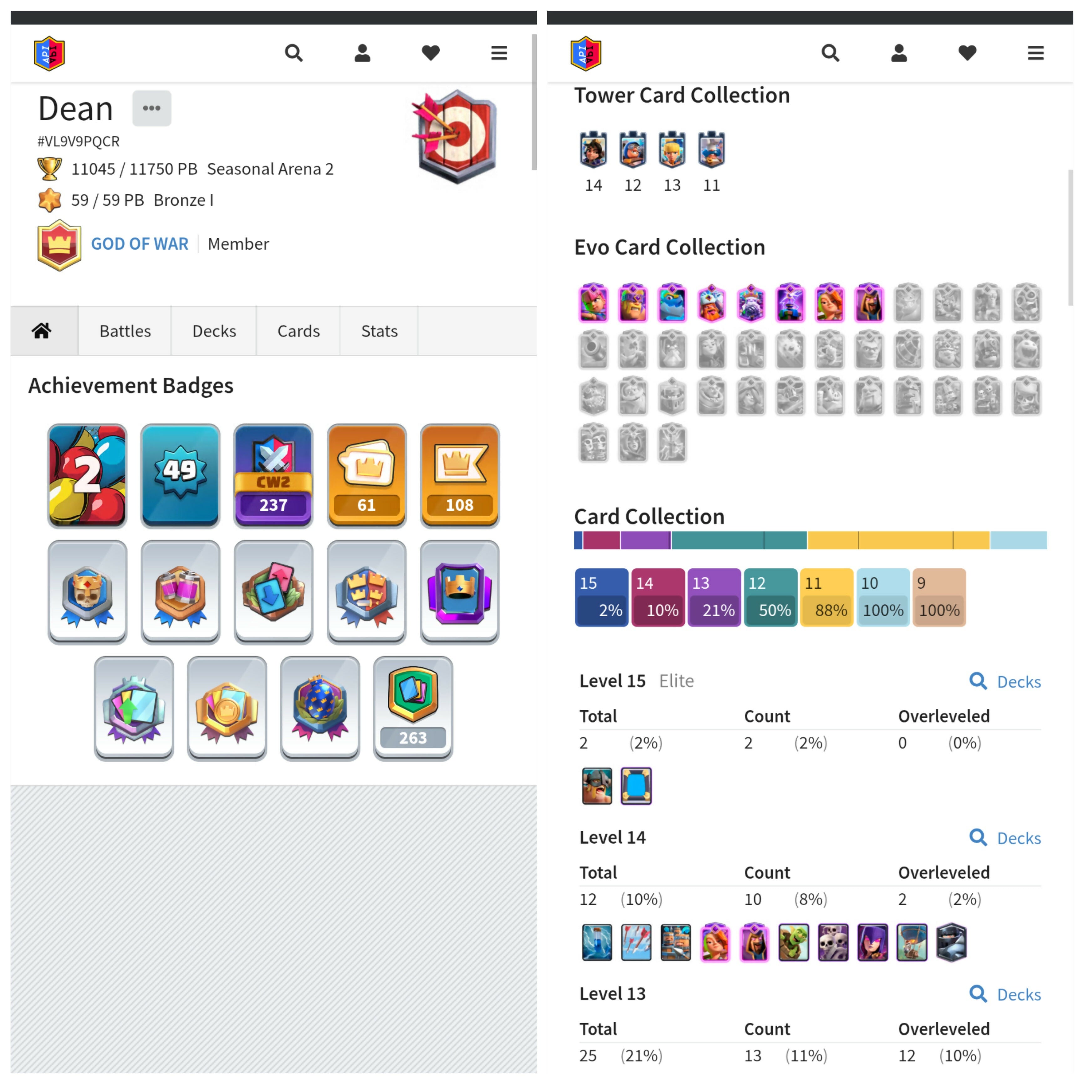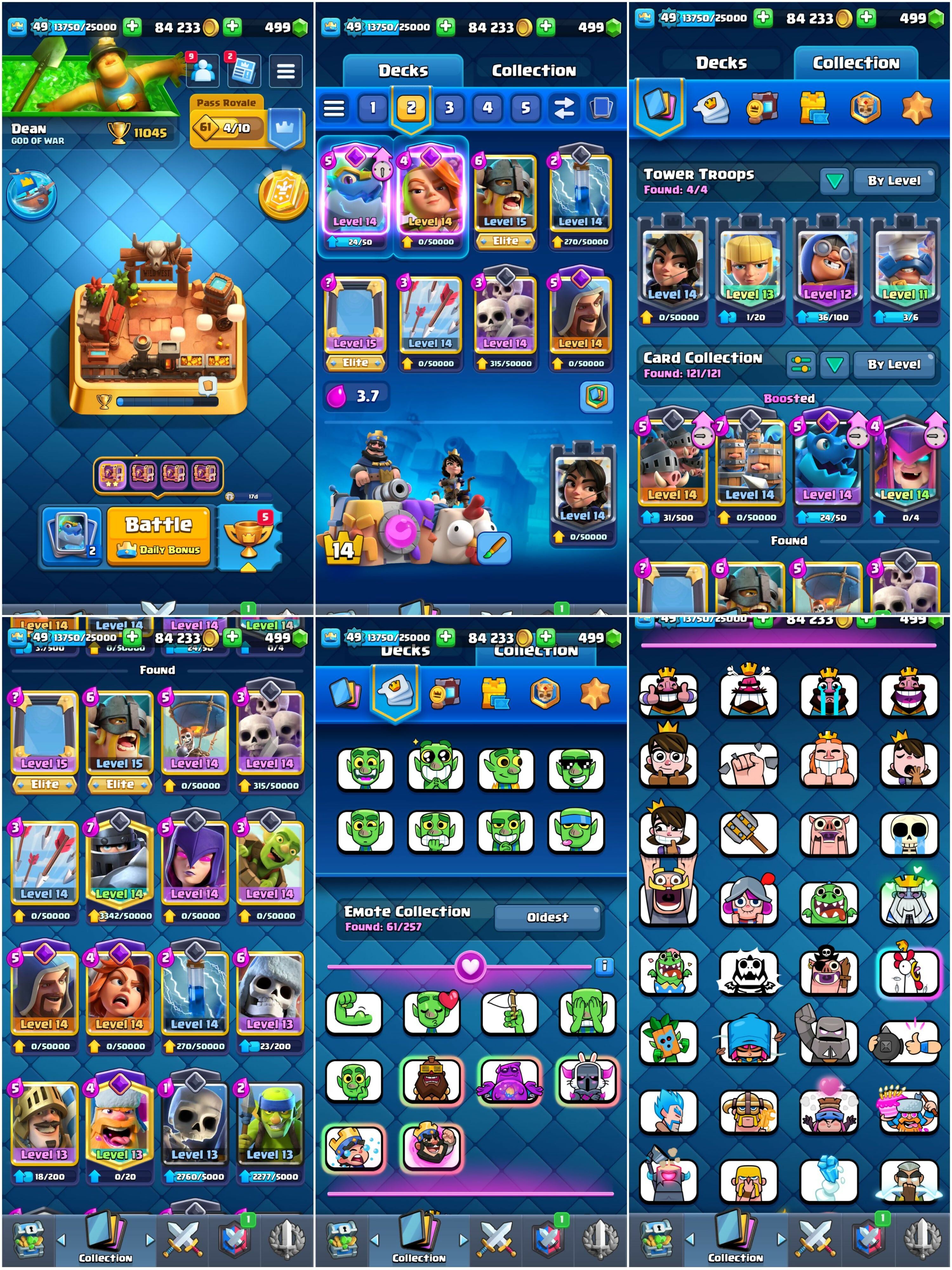 Level 49 + KT 14 | 11000 Trophies | 12 Max Cards {2 Elites} + 8 Evos | 61 Emotes & 4 Tower Skins | Android/iOS