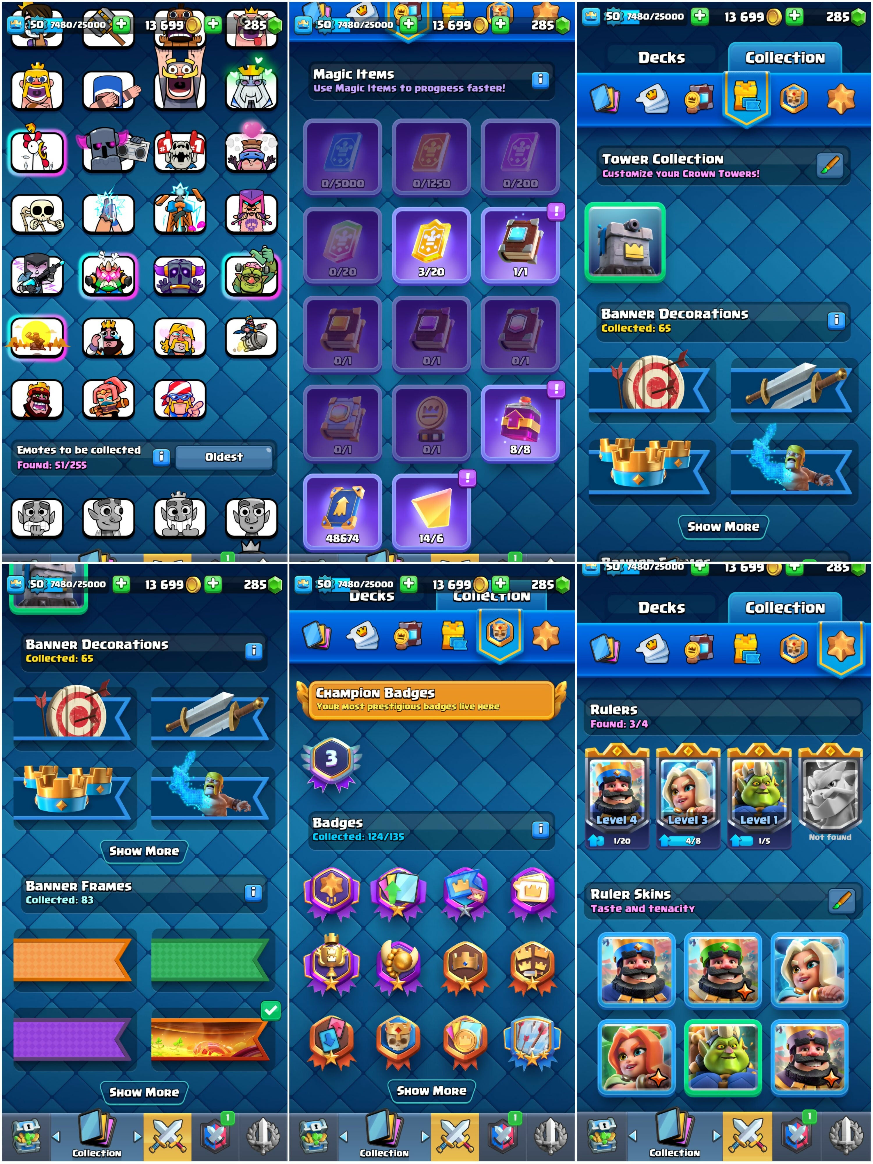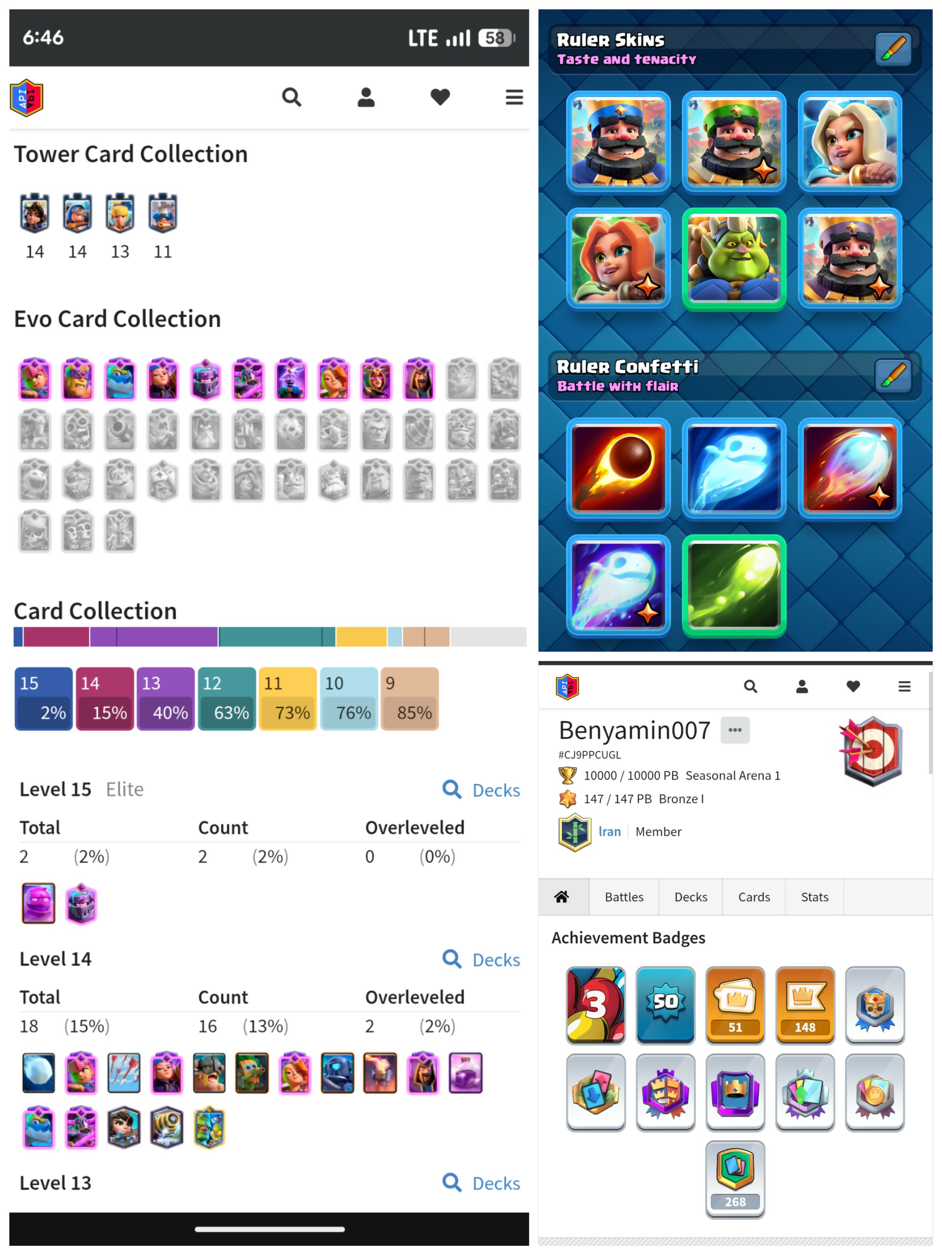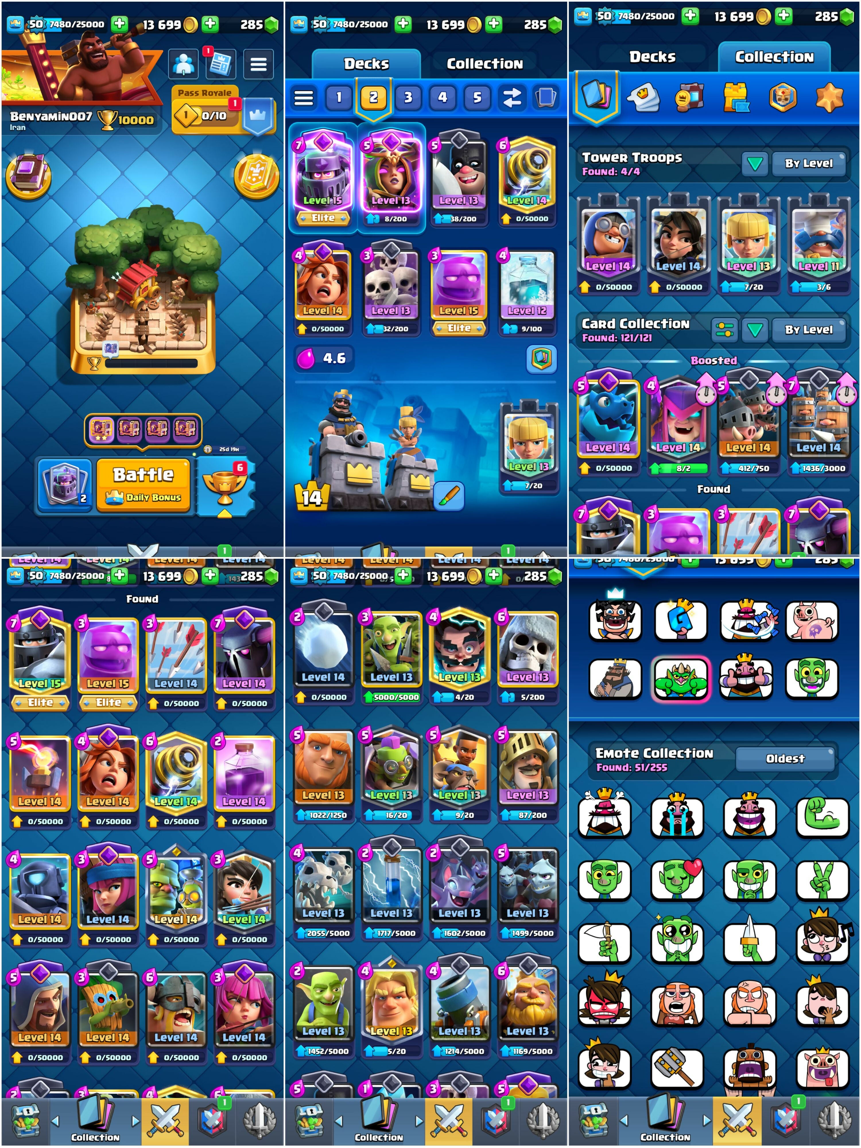 Level 50 + KT 14 | 10000 Trophies | 18 Max Cards {2 Elites} + 10 Evos | 51 Stacked Emotes + High Stacked Banners | Android/iOS