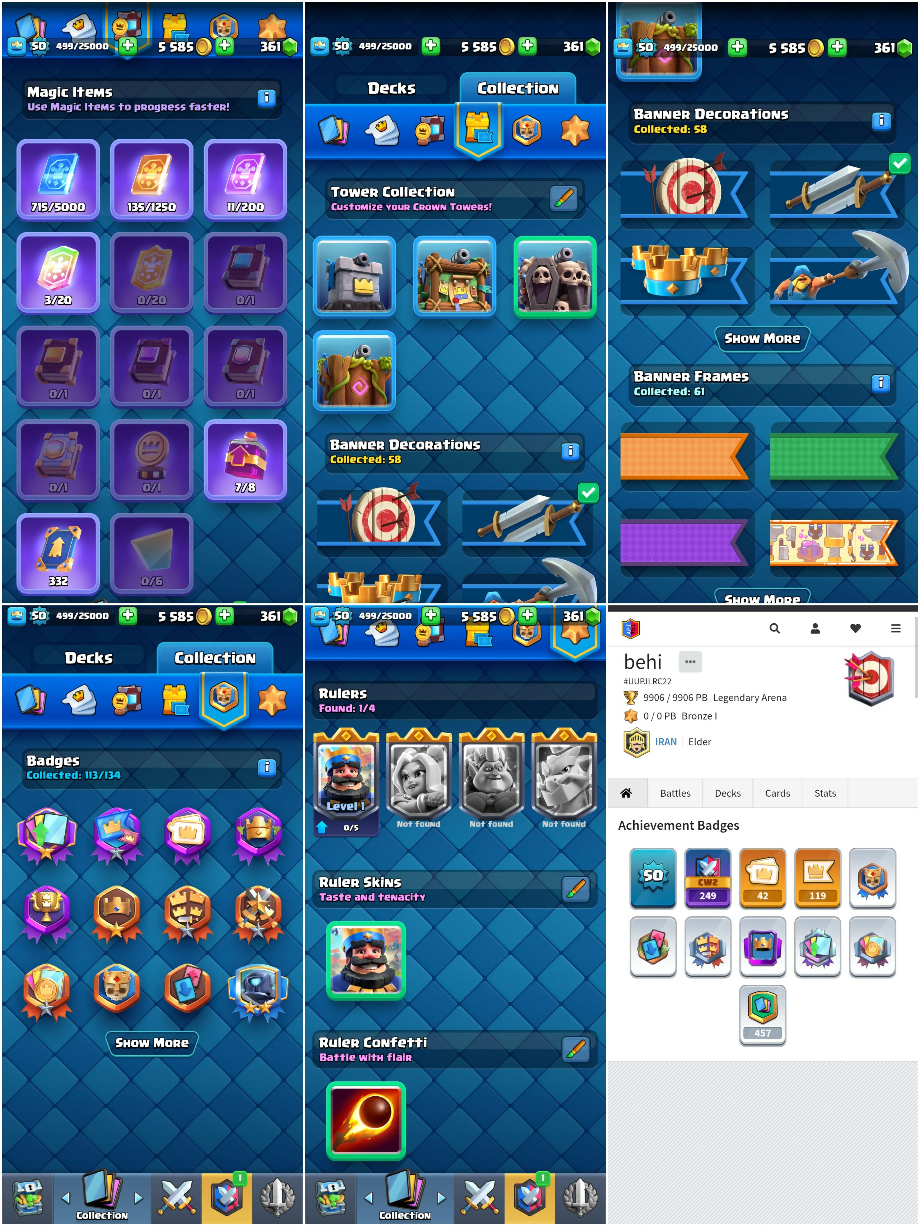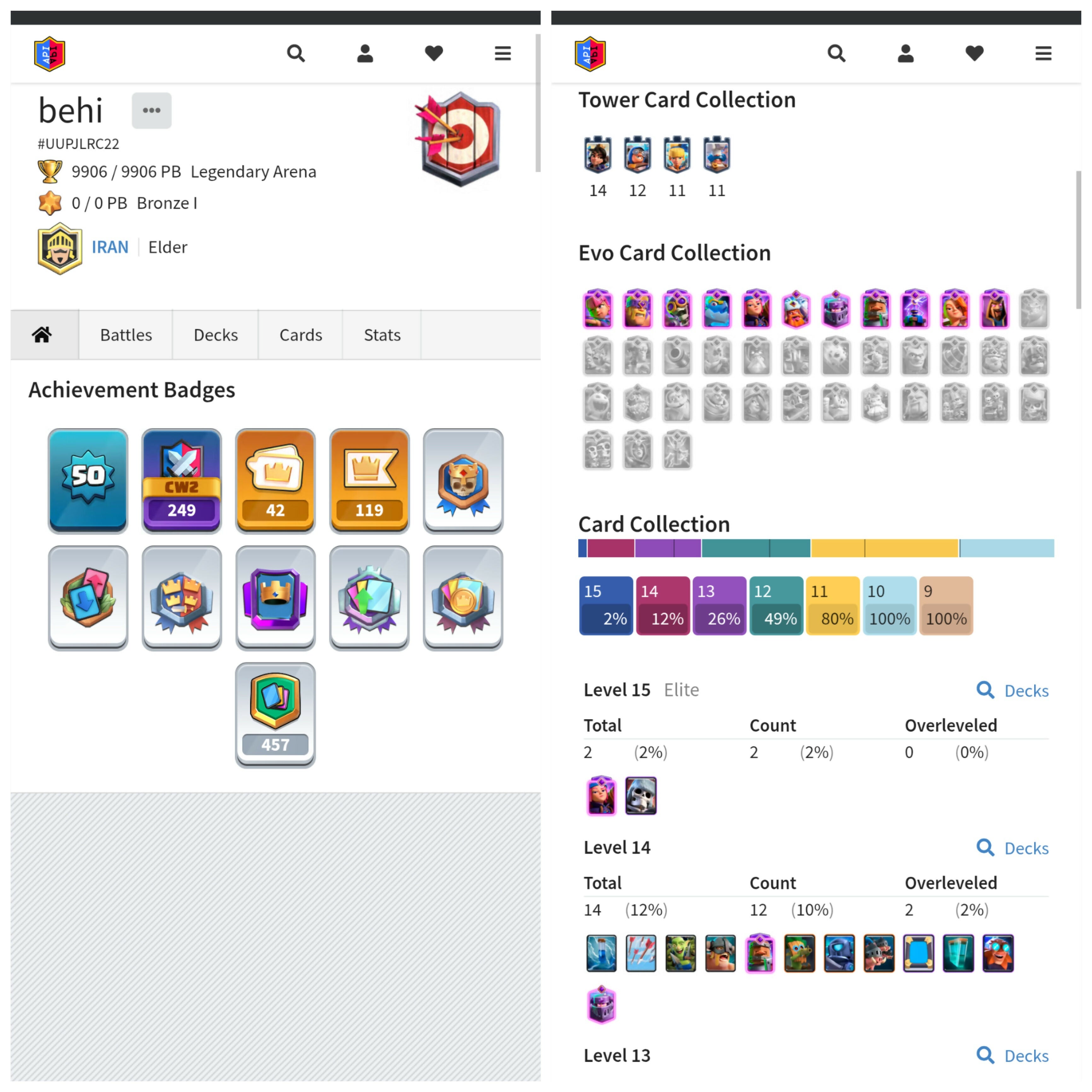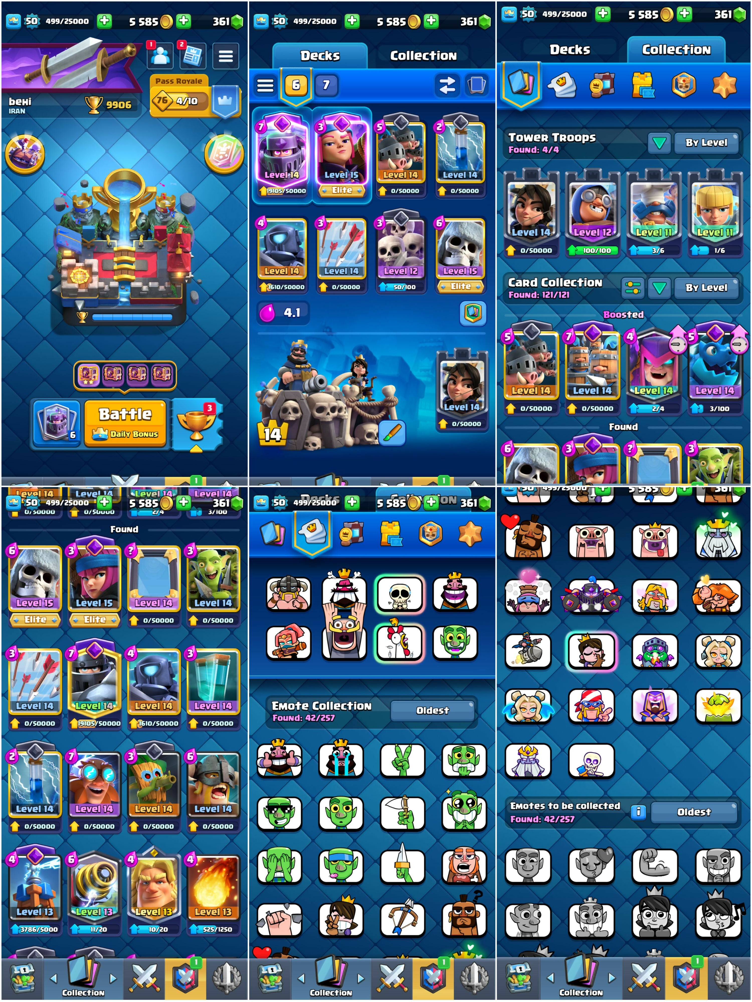 Level 50 + KT 14 | 9900 Trophies | 14 Max Cards {2 Elites} + 11 Evos | 42 Emotes + 4 Tower Skins | Android/iOS