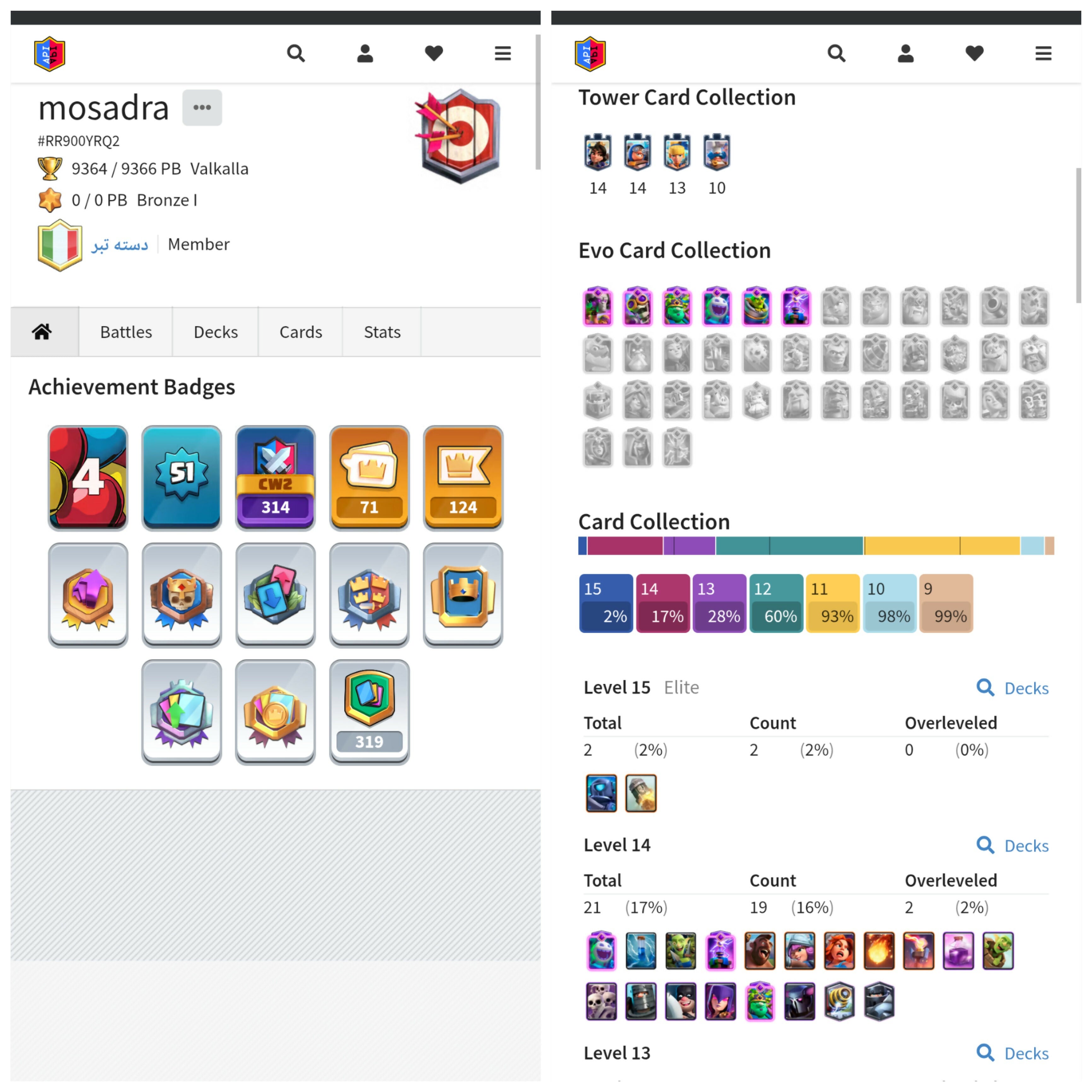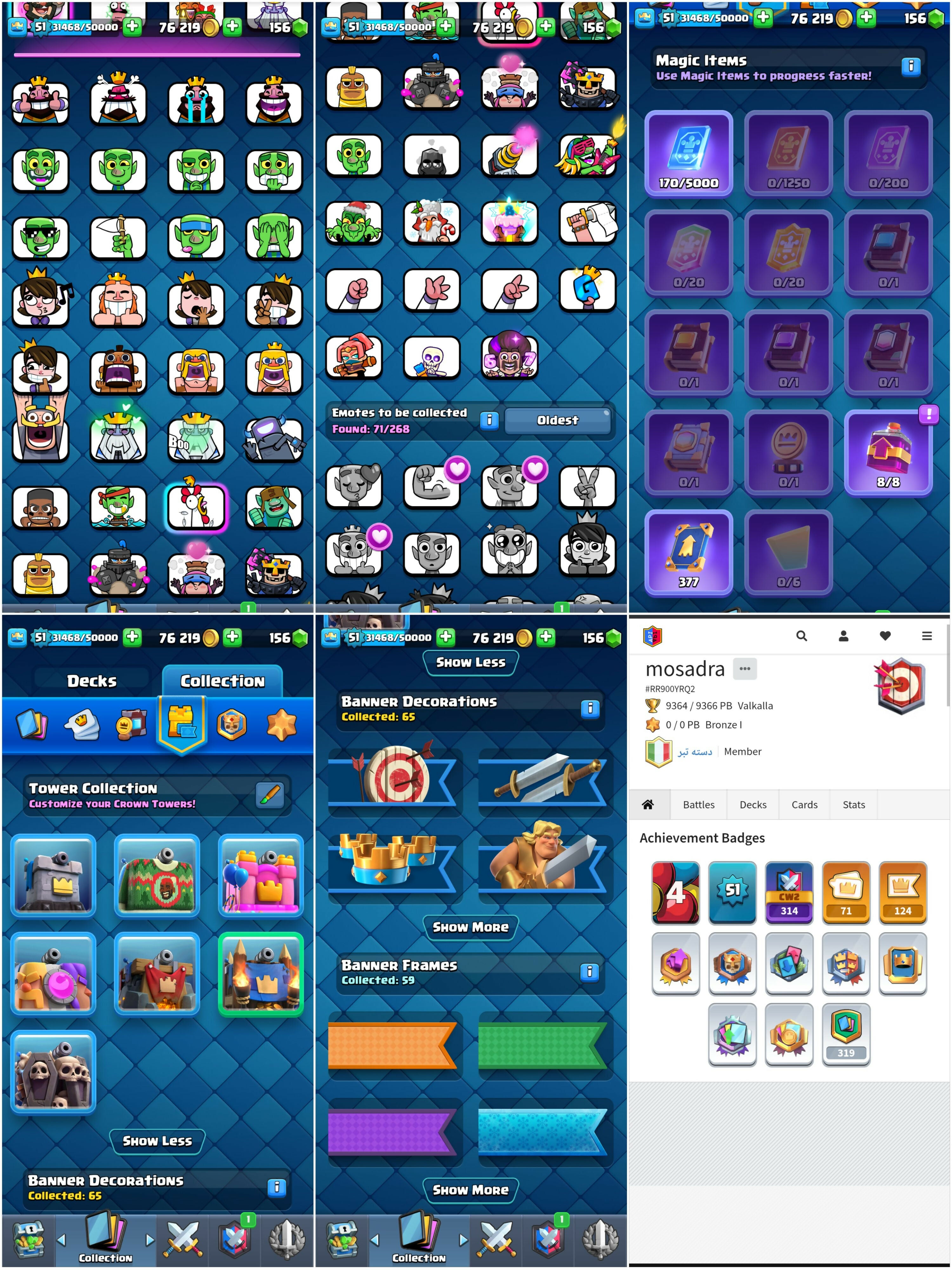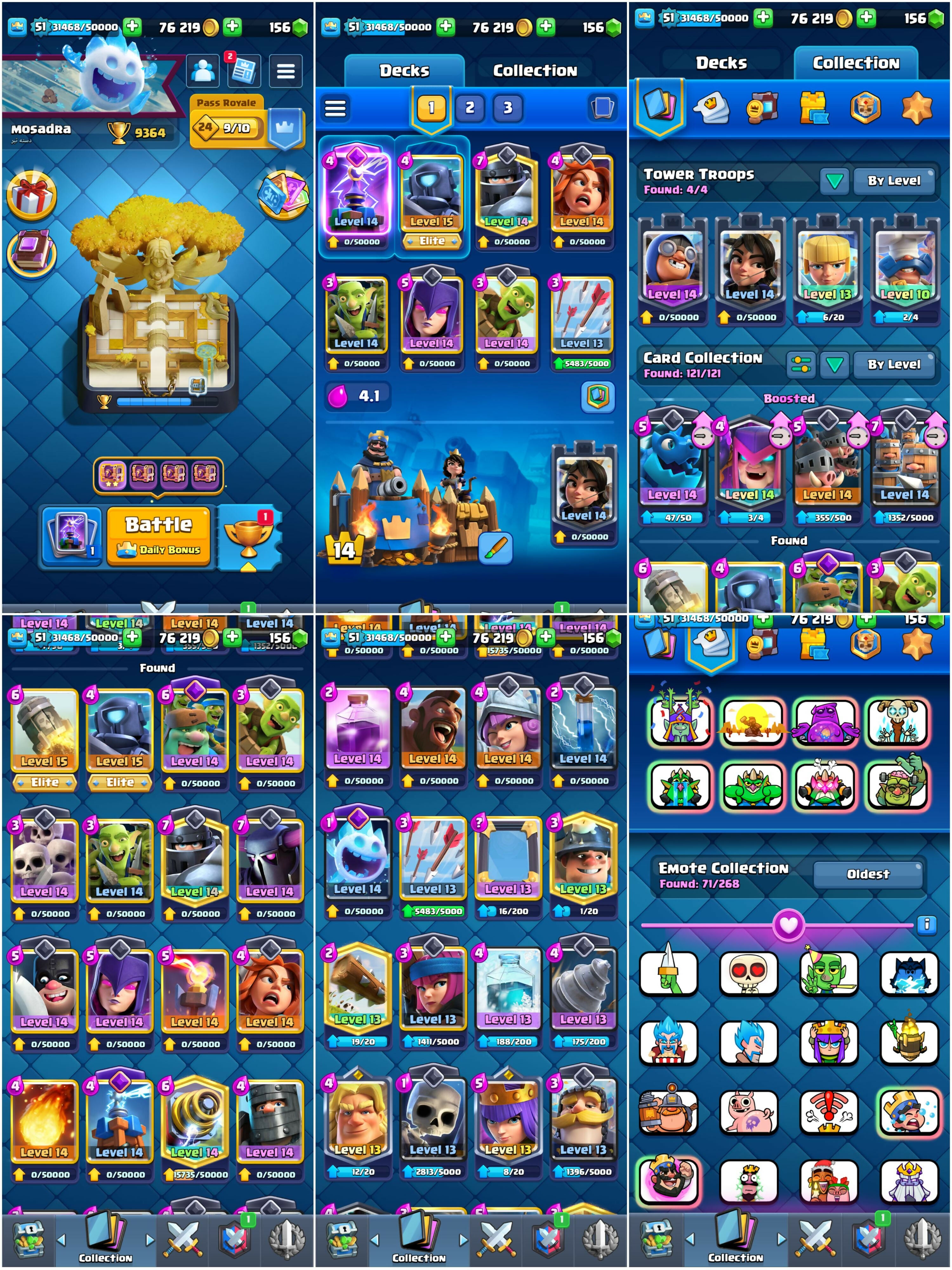 Level 51 + KT 14 | 9300 Trophies | 21 Max Cards {2 Elites} + 6 Evos | 71 High Stacked Emotes + 7 Tower Skins | Android/iOS