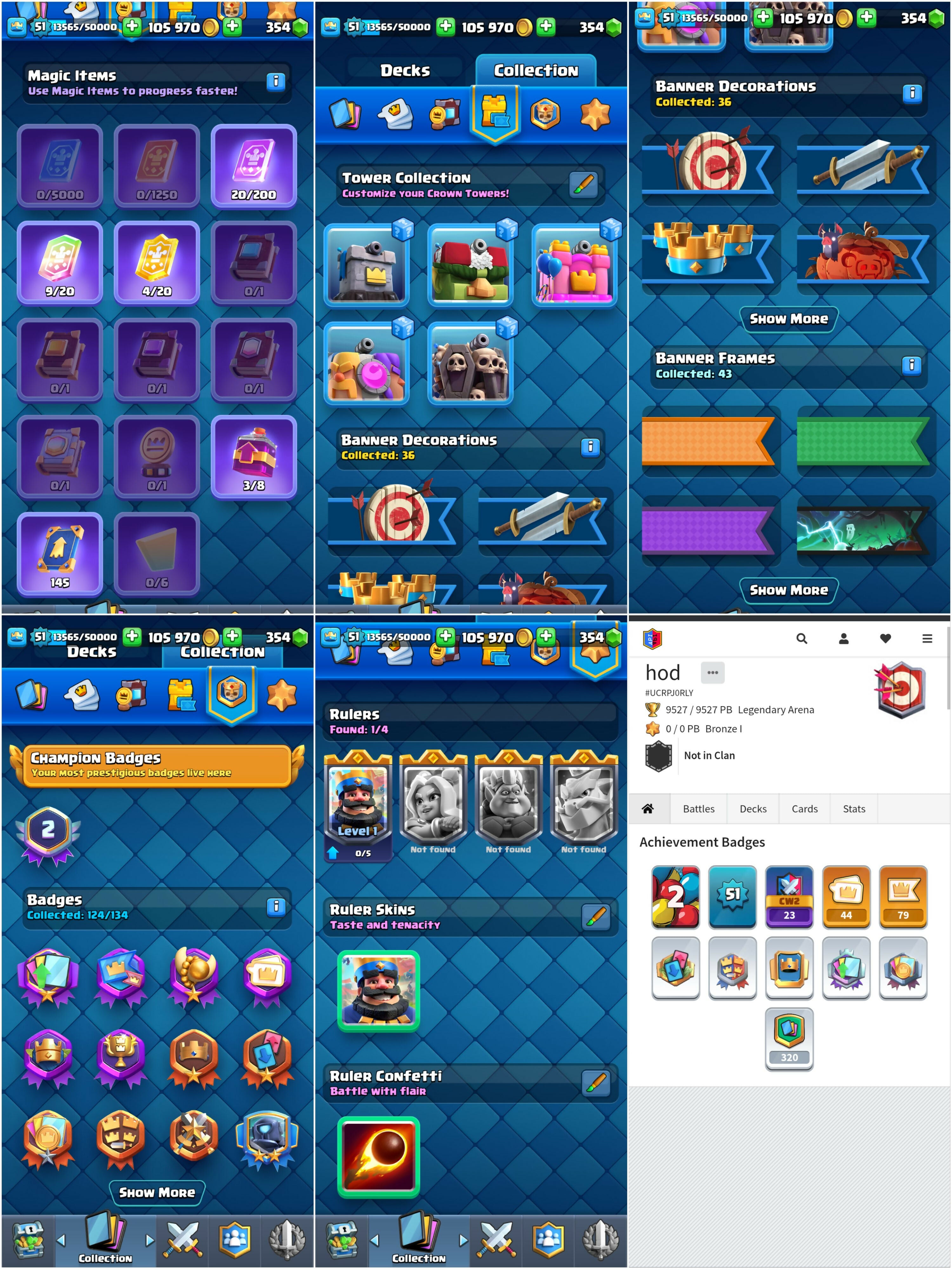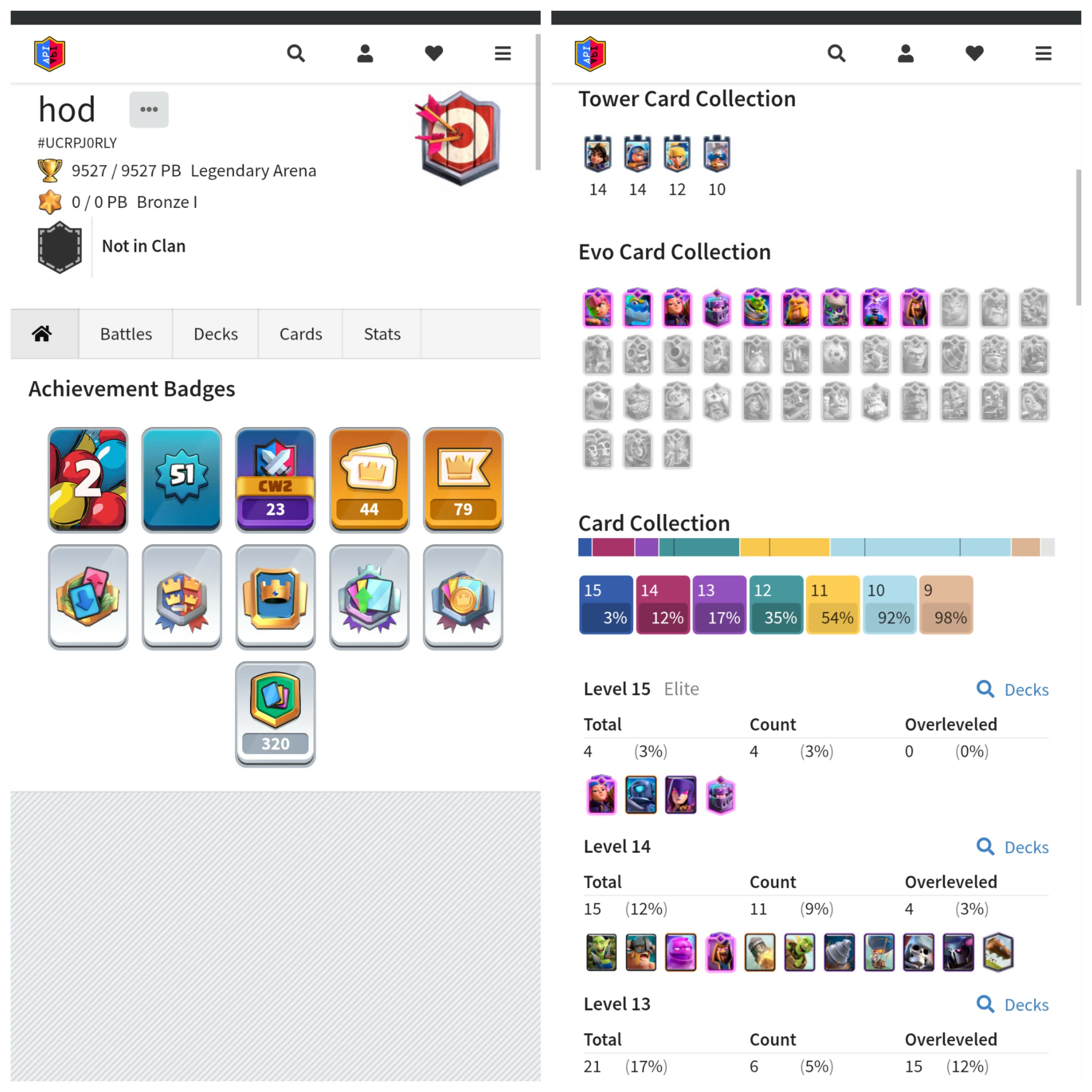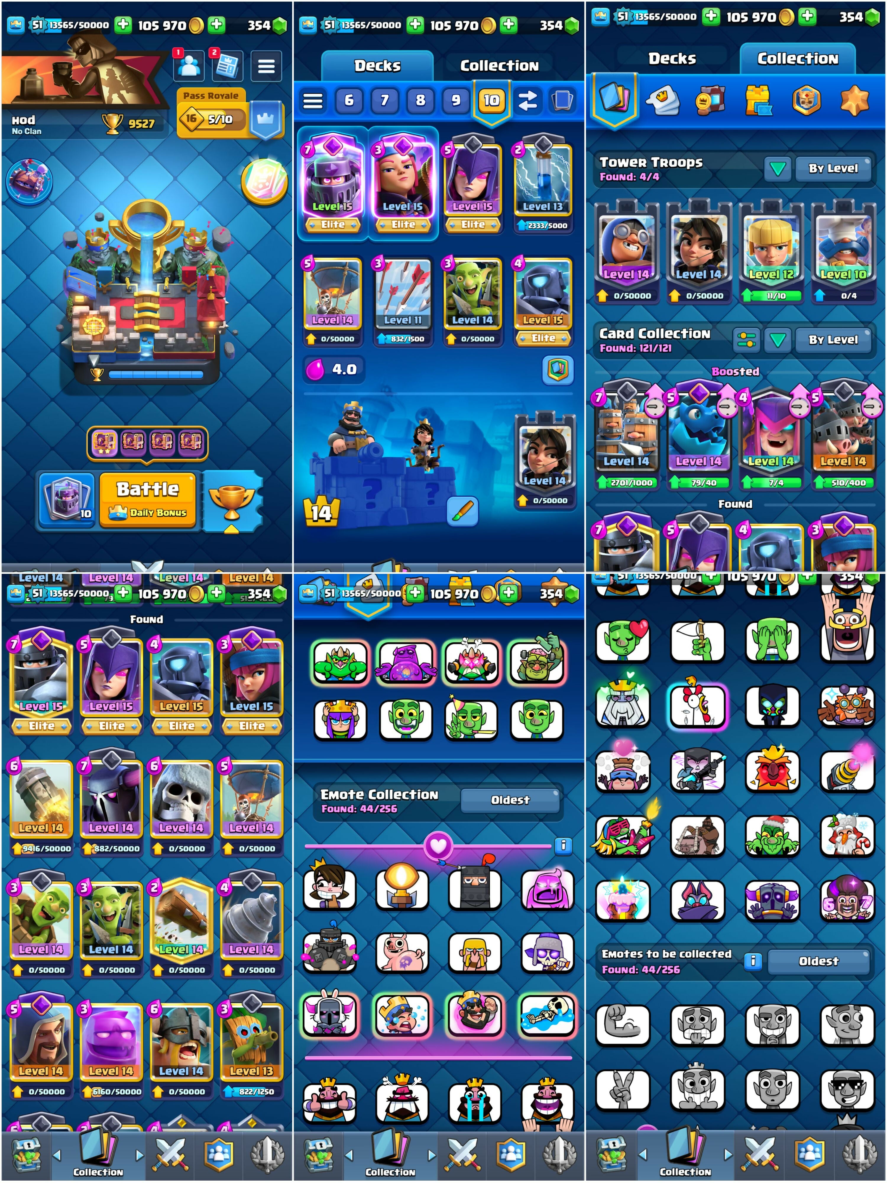 Level 51 + KT 14 | 9500 Trophies | 15 Max Cards {4 Elites} + 9 Evos | 44 Emotes & 5 Tower Skins | Android/iOS