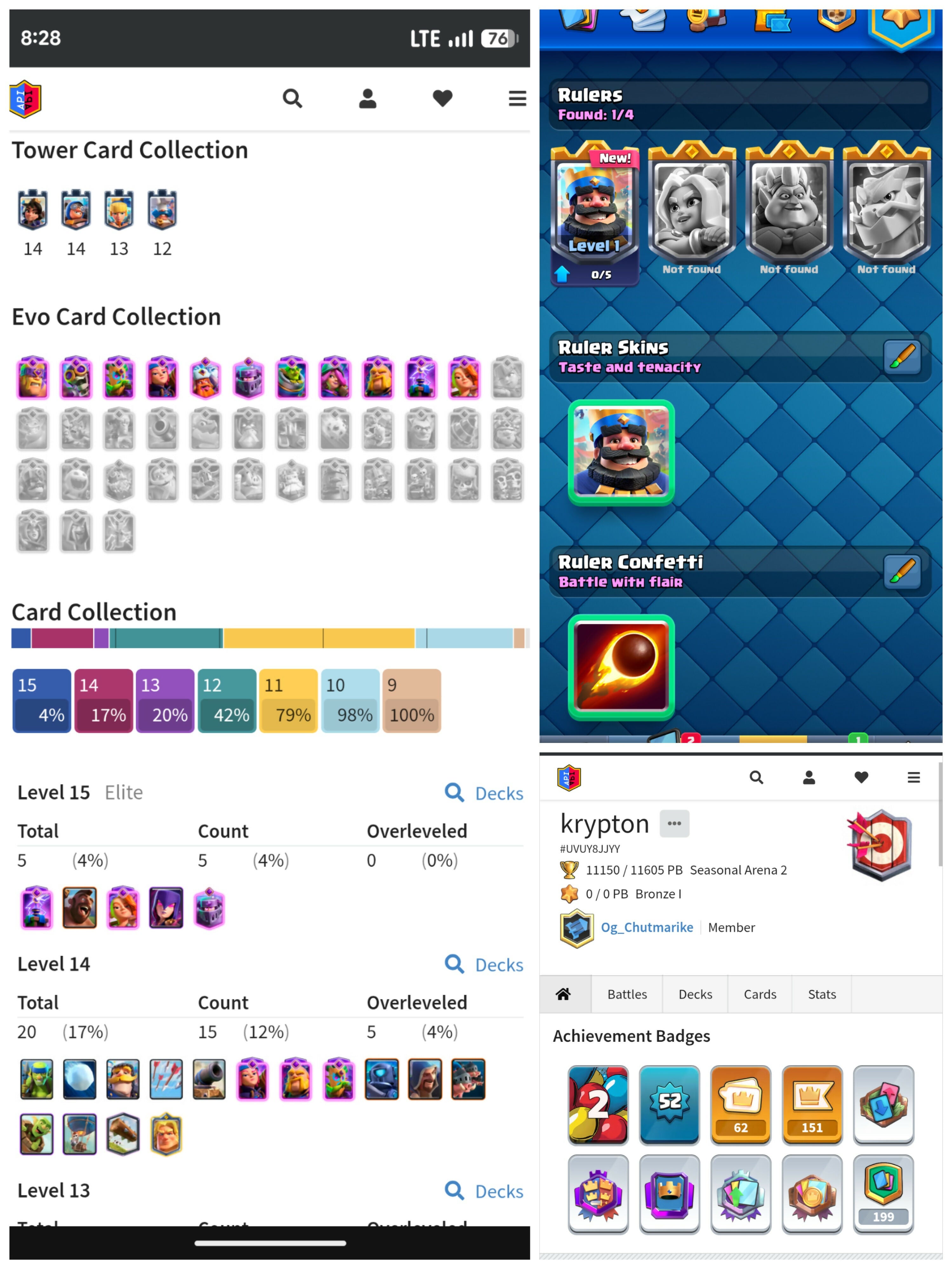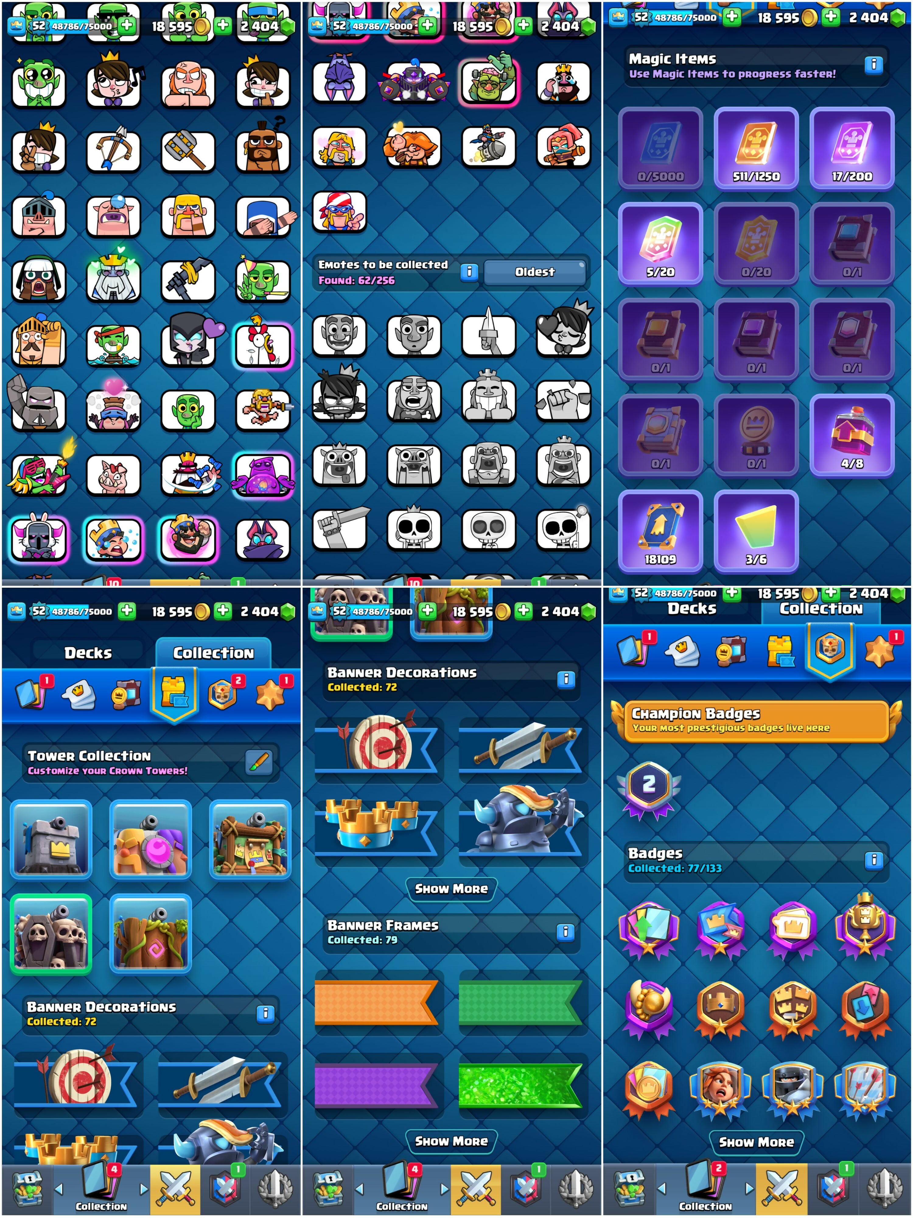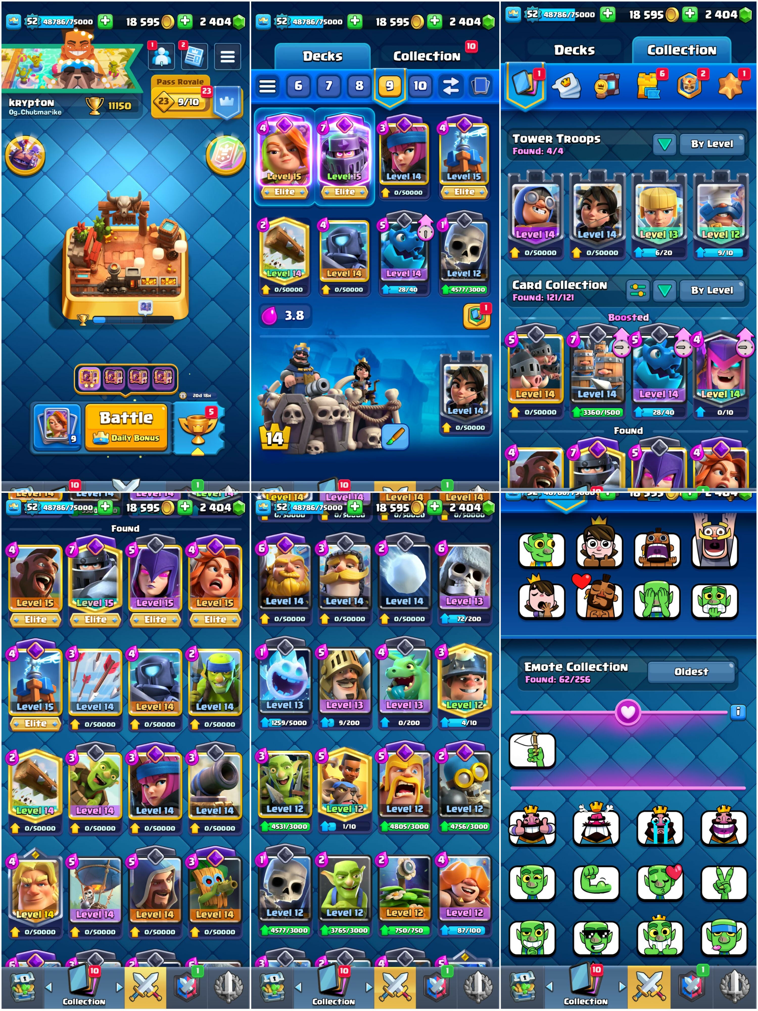 Level 52 + KT 14 | 11150 Trophies : 2400 Gems | 20 Max Cards {5 Elites} + 11 Evos | 62 Emotes & 5 Tower Skins | Android/iOS