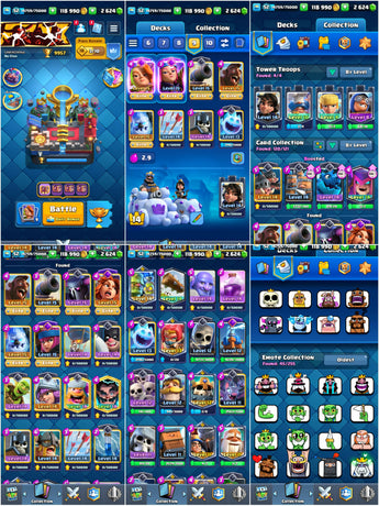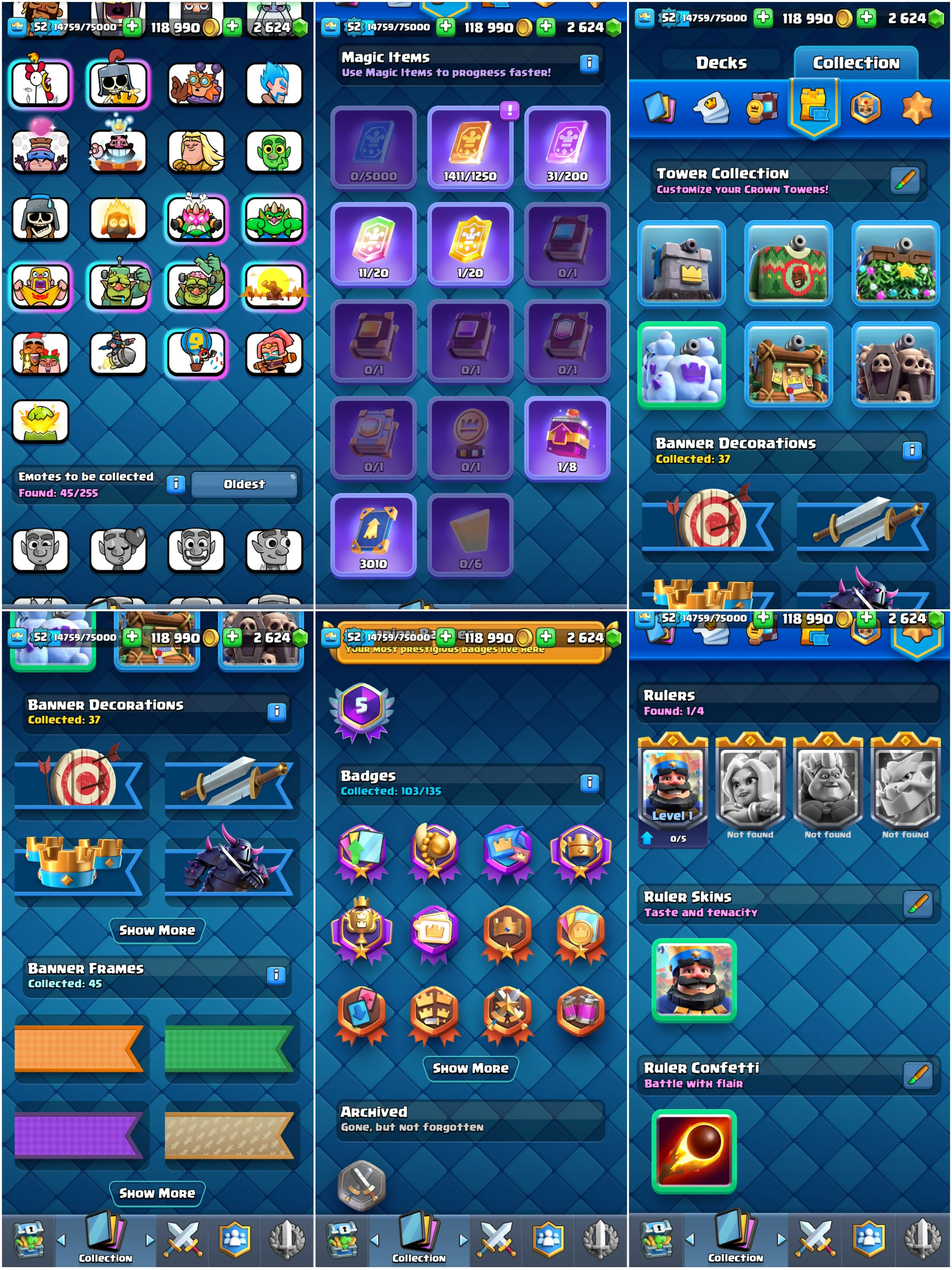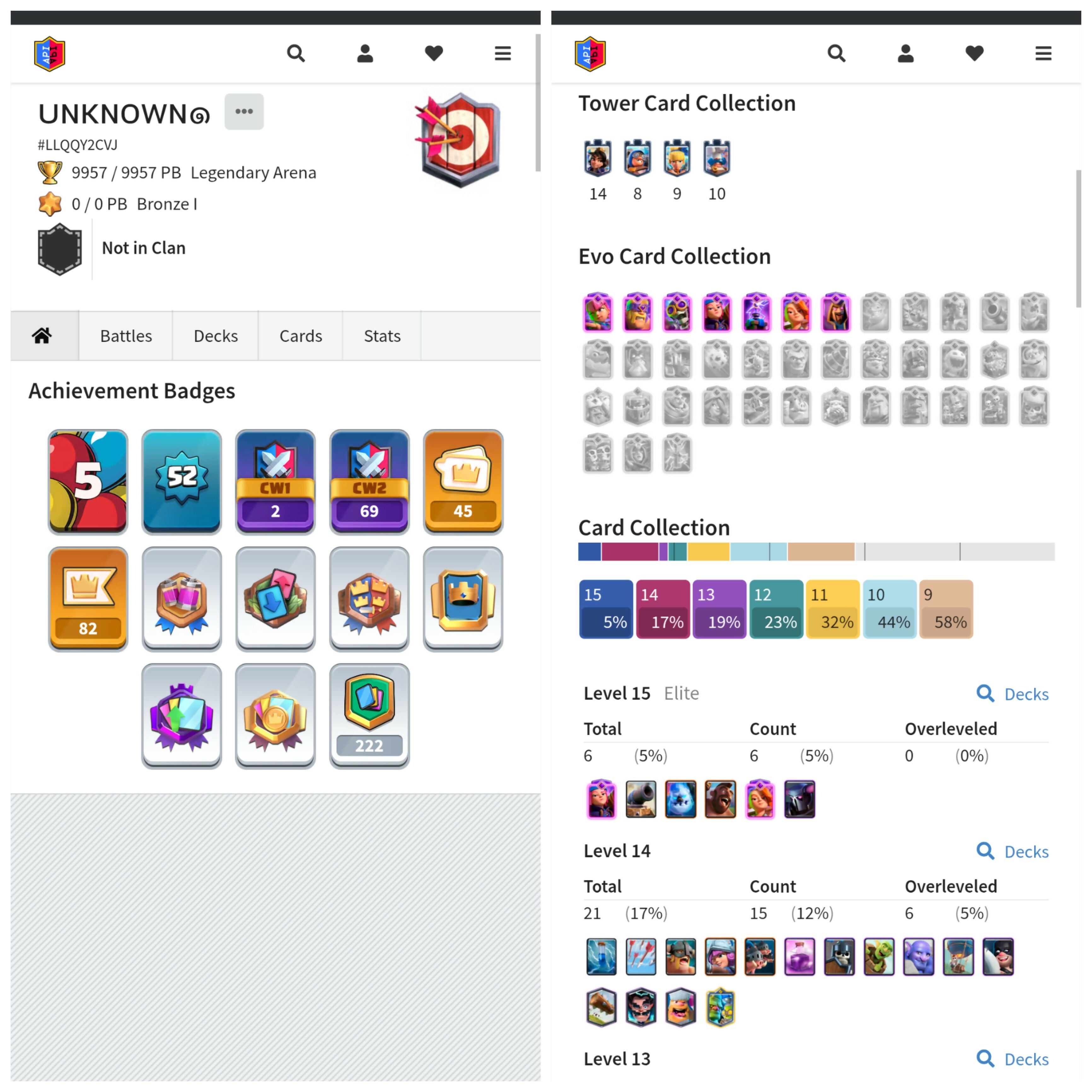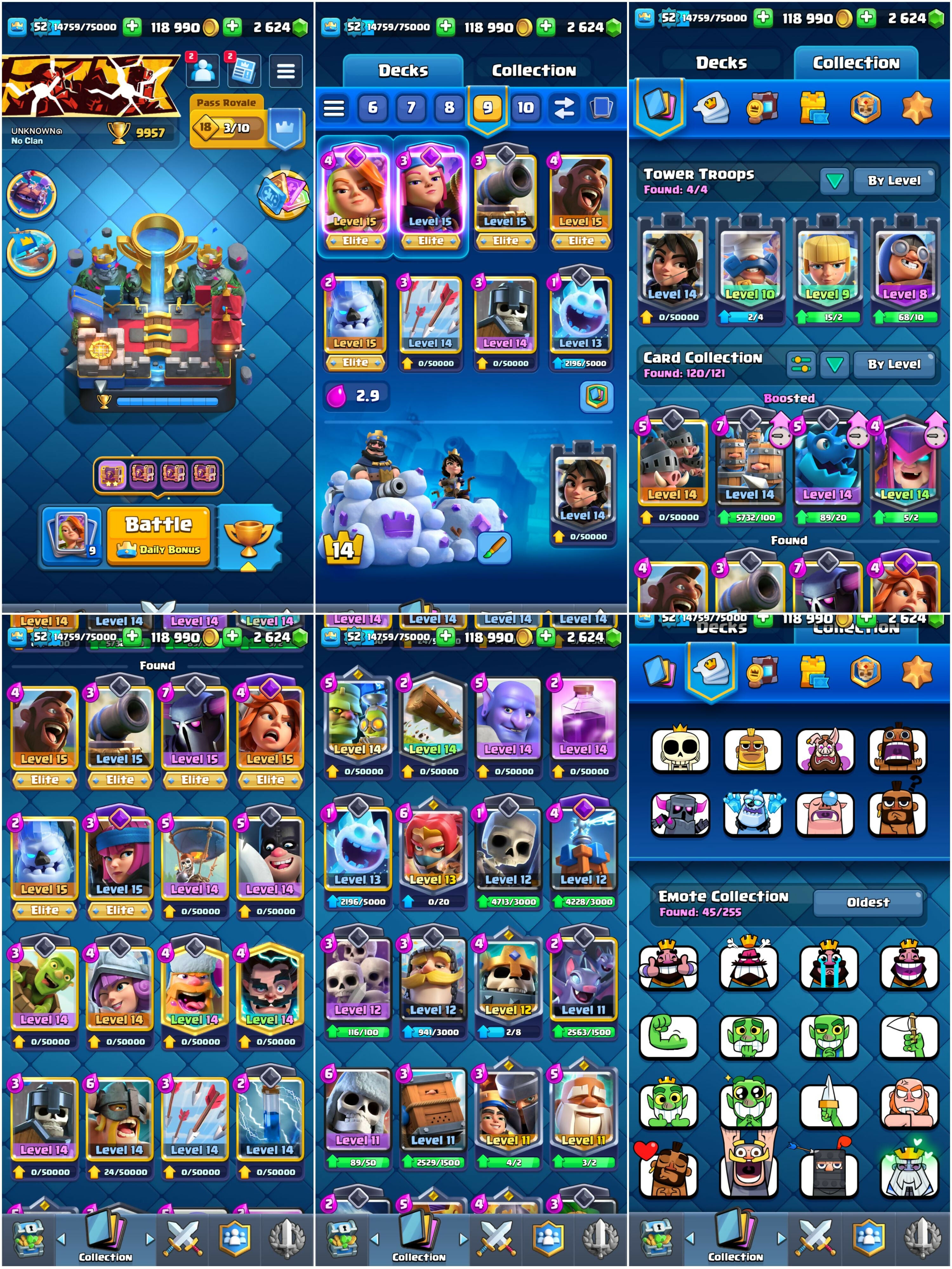 Level 52 + KT 14 | 9900 Trophies : 2600 Gems | 21 Max Cards {6 Elites} + 7 Evos | 45 Emotes & 6 Tower Skins | Android/iOS