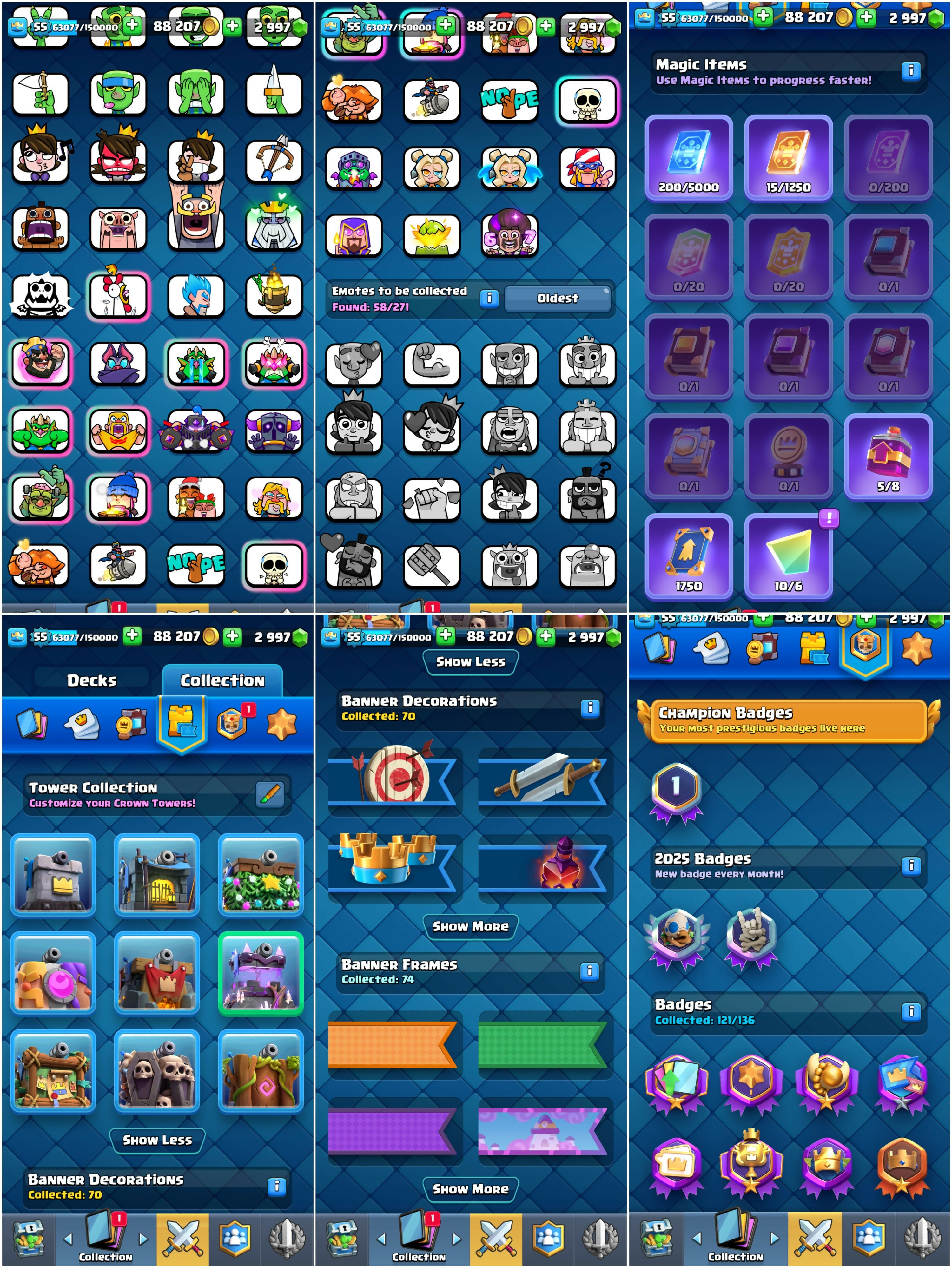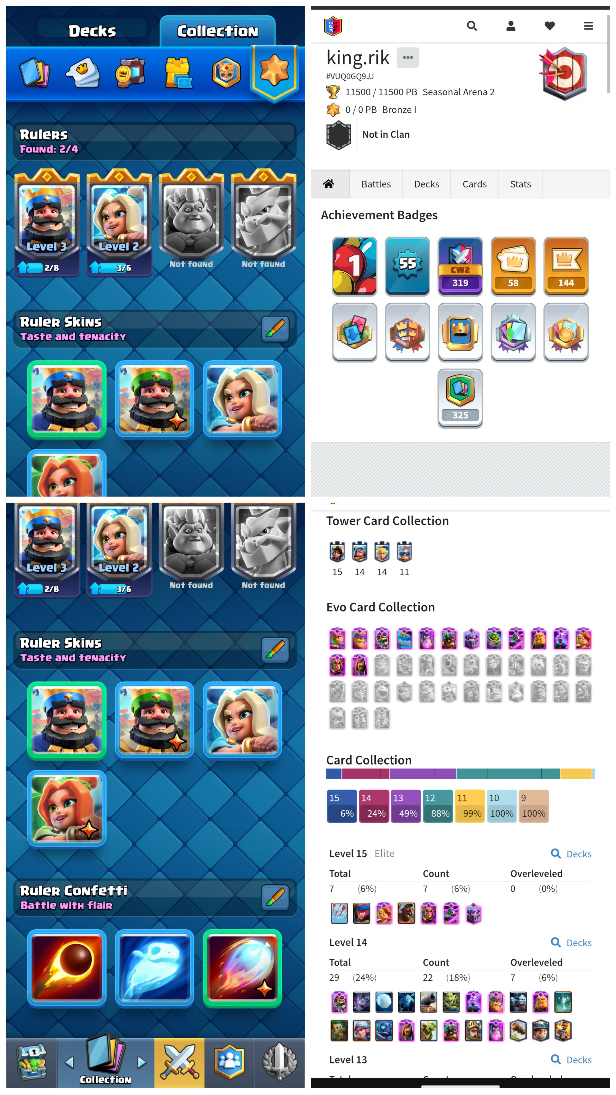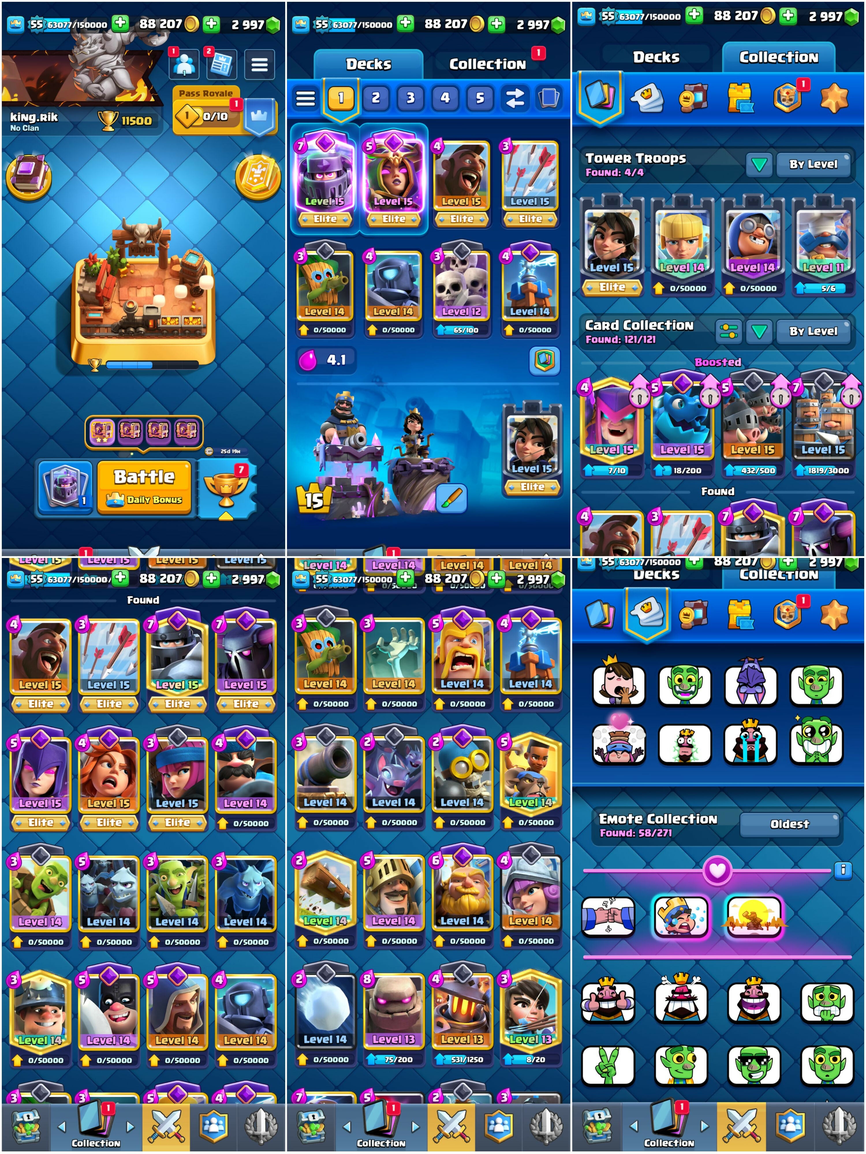 Level 55 + KT 15 | 11500 Trophies : 2900+ Gems | 29 Max Cards {7 Elites} + 14 Evos | 58 Emotes & 9 Tower Skins | Android/iOS