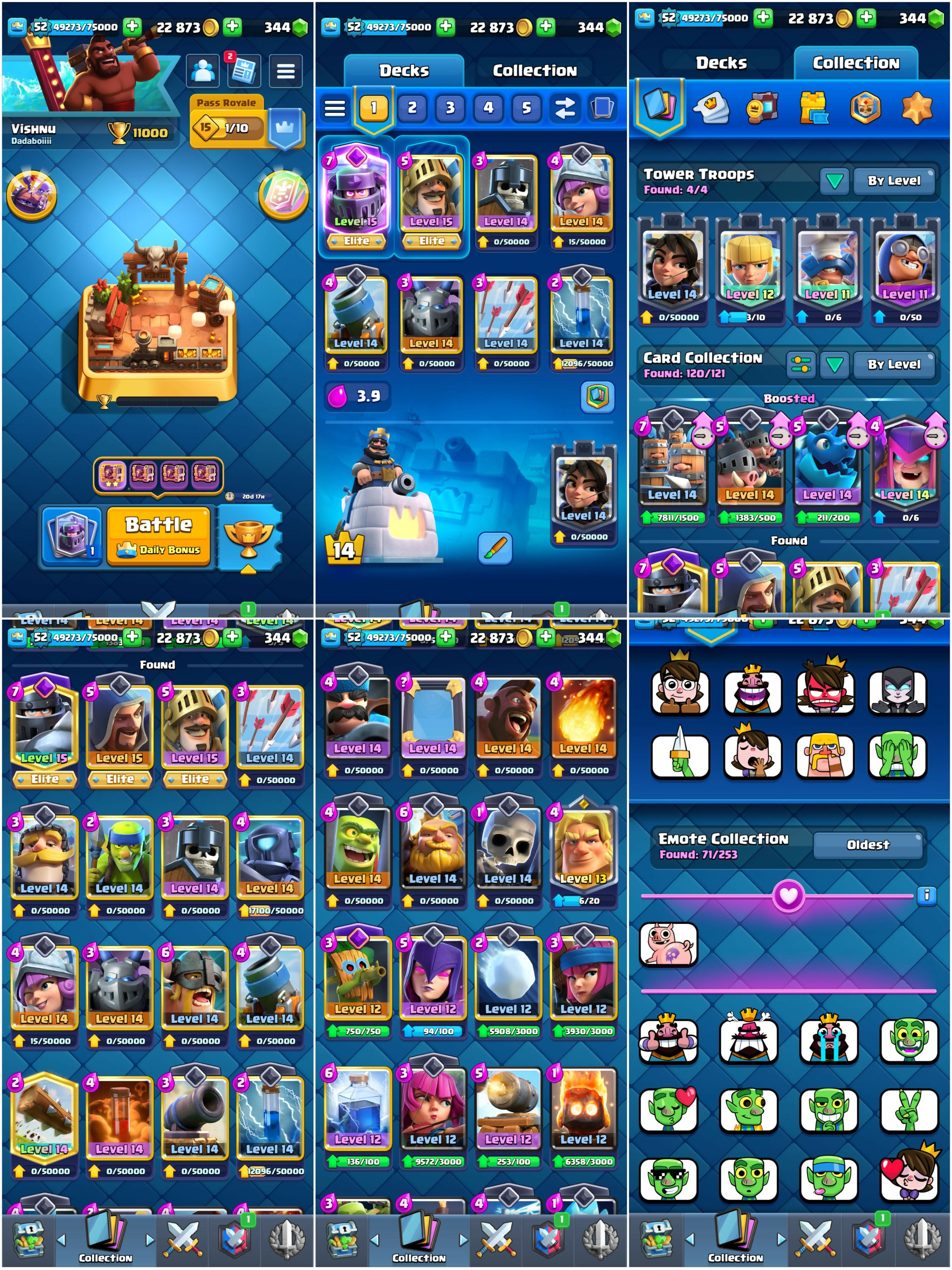 Rarest: 8 Years Played Badge | Level 52 + KT 14 | 11000 Trophies | 23 Max Cards {3 Elites} | 71 Stacked Emotes | Android/iOS