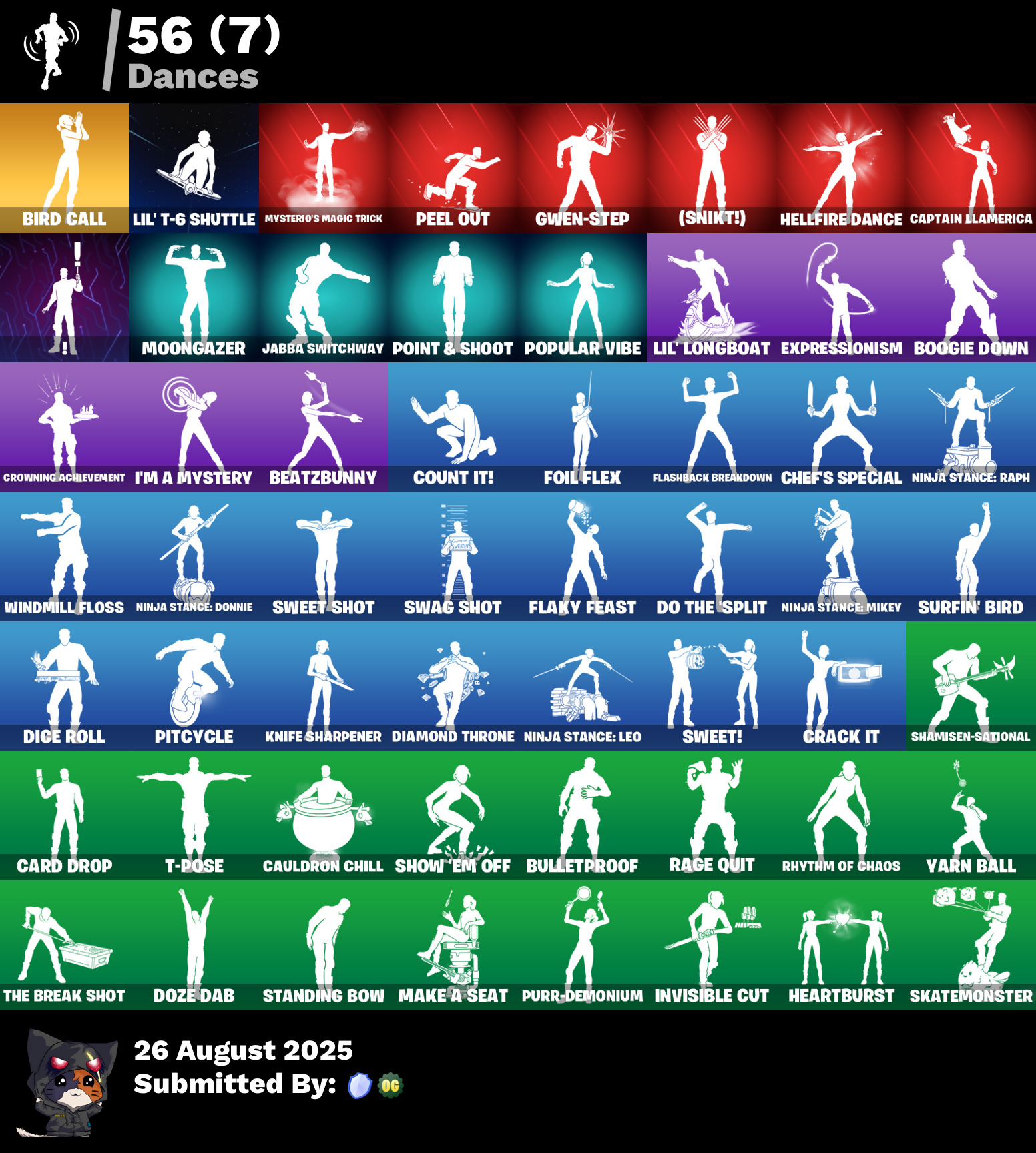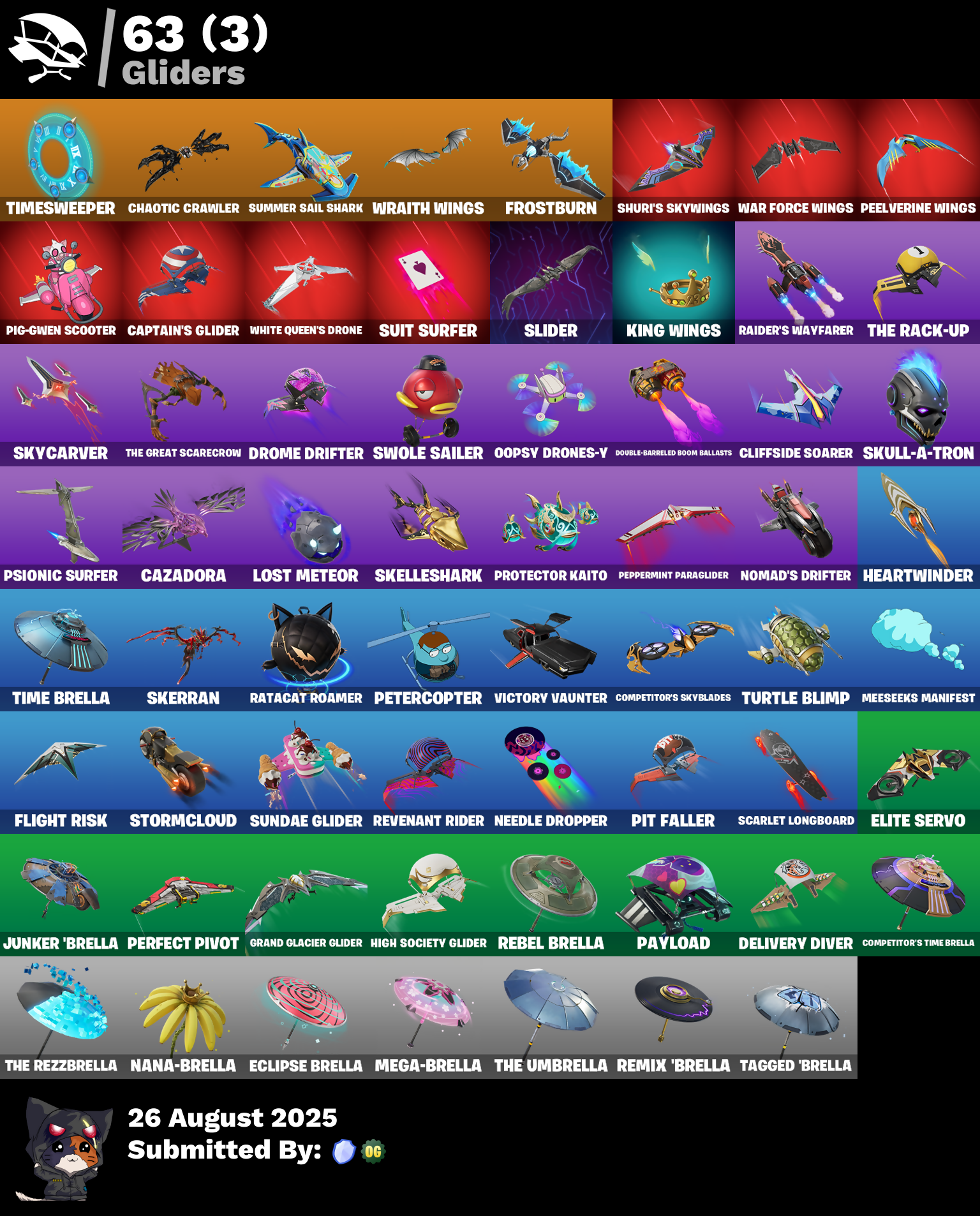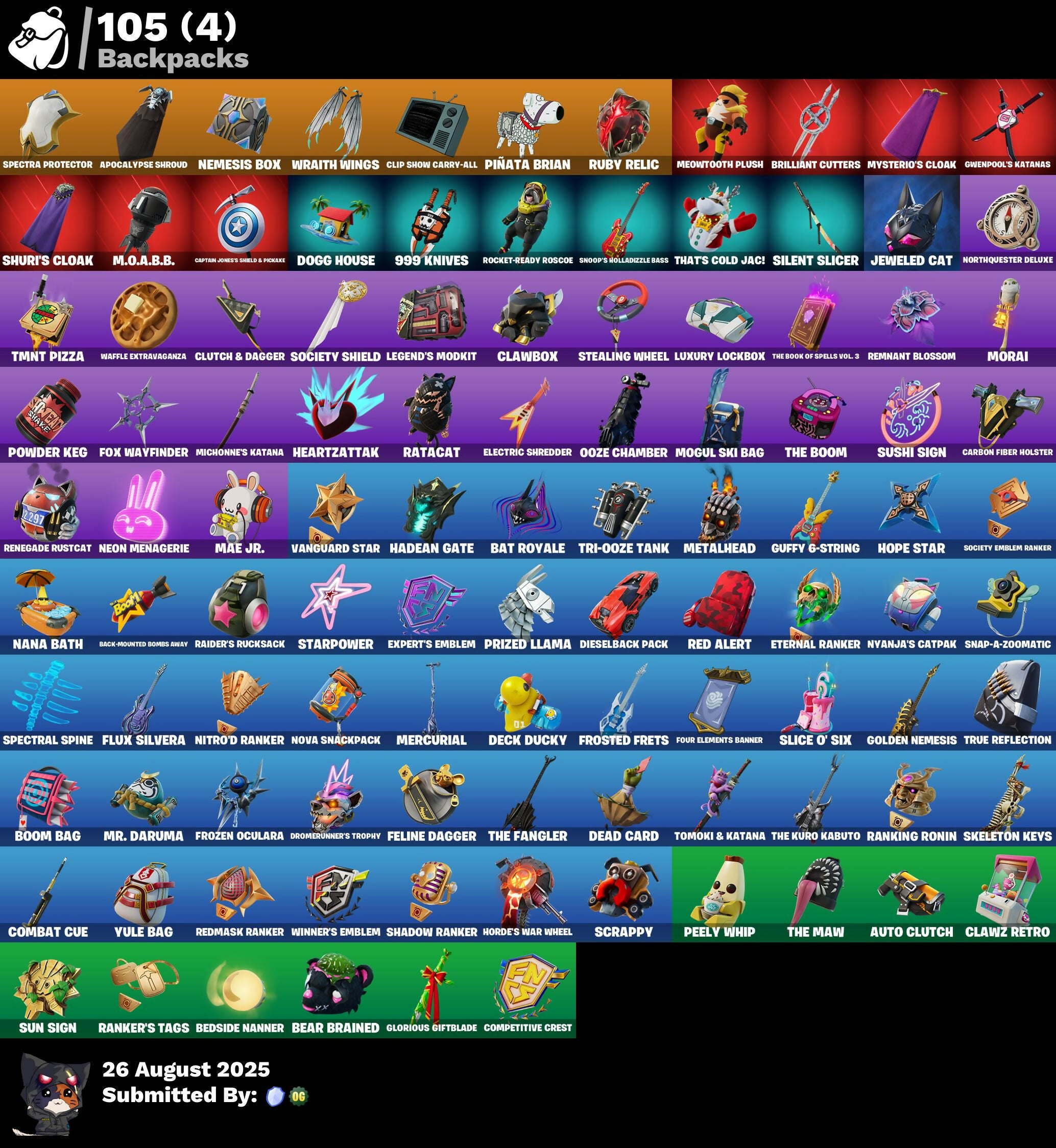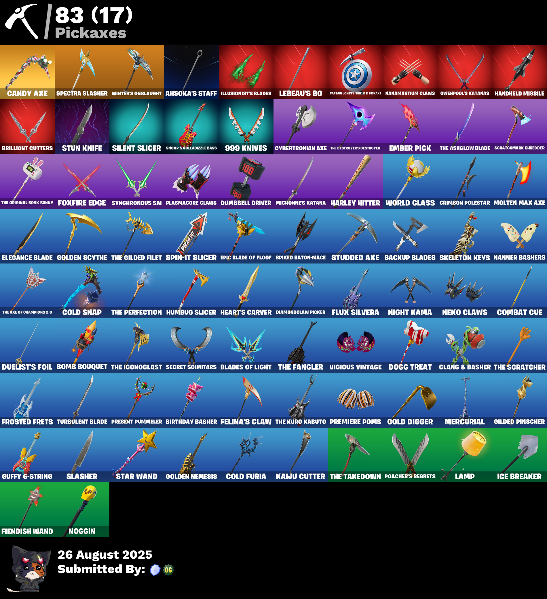 (Snikt!), 999 Knives, Ahsoka Tano, Ahsoka's Staff, Apocalypse Shroud, Auto Clutch, B.R.U.T.E. Gunner, Back-Mounted Bombs Away, Backup Blades, Bat Royale, Bear Brained, Beatzbunny, Bedside Nanner, Bird Call, Birdie, Birthday Basher, Blades of Light, Bomb Bouquet, Boogie Down, Boom Bag, Brilliant Cutters, Bulletproof, Burning Ambition Valeria, Camille, Candy Axe, Captain Jones, Captain Jones's Shield & Pickaxe, Captain Llamerica, Captain's Glider, Carbon Fiber Holster, Card Drop, Castaway Jonesy, Catwoman Comic Book Outfit, Cauldron Chill, Cazadora, Chalked Up 1-Ball, Chaos Agent, Chaotic Crawler, Chef's Special, Clang & Basher, Clawbox, Clawz Retro, Cliffside Soarer, Clip Show Carry-All, Clutch & Dagger, Cold Furia, Cold Snap, Collector Kado Thorne, Combat Cue, Competitive Crest, Competitor's Skyblades, Competitor's Time Brella, Count It!, Crack It, Crimson Polestar, Crowning Achievement, Crypt Crosser, Cryptic, Cybertronian Axe, Dead Card, Deck Ducky, Delivery Diver, Diamond Thorne, Diamondclaw Picker, Dice Roll, Dieselback Pack, Do The 'Split, Dogg House, Dogg Treat, Double-Barreled Boom Ballasts, Doze Dab, Drome Drifter, Dromerunner's Trophy, Duelist's Foil, Dumbbell Driver, Dynamo, Dynamo Tnttoon-A, Echo, Eclipse Brella, Electric Shredder, Elegance Blade, Eleven, Elite Servo, Ember Pick, Emma Frost, Envoy, Epic Blade of Floof, Eternal Ranker, Expert's Emblem, Expressionism, Fancy Peter Griffin, Felina, Felina's Claw, Feline Dagger, Festival Phaedra, Fiendish Wand, Flaky Feast, Flashback Breakdown, Flight Risk, Flux Silvera, Foil Flex, Four Elements Banner, Fox Wayfinder, Foxfire Edge, Frostburn, Frosted Frets, Frozen Oculura, Ghoul Trooper, Gilded Pinscher, Glorious Giftblade, Gold Digger, Golden Nemesis, Golden Scythe, Grand Glacier Glider, Guardian Jade, Guffy 6-String, Gwen-Step, Gwenpool, Gwenpool's Katanas, Hadean Gate, Handheld Missile, Harbinger Armor Omegarok, Harley (Always Fantabulous), Harley Hitter, Heart's Carver, Heartburst, Heartwinder, Heartzattak, Hellfire Dance, High Society Glider, Highwire, Holiday Boxy, Hope, Hope Star, Horde's War Wheel, Humbug Slicer, I'm A Mystery, Ice Breaker, Illusionist's Blades, Imani, Invisible Cut, Isabelle, Jabba Switchway, Jeweled Cat, Jolly Jammer, Junker 'Brella, Kaiju Cutter, Kendo, King Wings, Knife Sharper, Lamp, Lebeau's Bo, Legend's Modkit, Lewis Hamilton, Lil' Longboat, Lil' T-6 Shuttle, Lost Meteor, Luxury Lockbox, M.O.A.B.B., Mae Jr., Make A Seat, Manic, Meeseeks Manifest, Mega-Brella, Meowtooth Plush, Mercurial, Metalhead, Michonne, Michonne's Katana, Midnight Skye, Mogul Master, Mogul Ski Bag, Molten Max Axe, Moongazer, Morai, Mr. Daruma, Mysterio, Mysterio's Cloak, Mysterio's Magic Trick, Mystica, Nana Bath, Nana-Brella, Nanamatium Claws, Nanner Bashers, Needle Dropper, Neko Claws, Nemesis Box, Neon Menagerie, Night Kama, Ninja Stance: Donnie, Ninja Stance: Leo, Ninja Stance: Mikey, Ninja Stance: Raph, Nisha, Nitrod Ranker, Noggin, Nolan Chance, Nomad's Drifter, Northquester Deluxe, Nova Snackpack, Nyanja, Nyanja's Catpak, Oopsy Drones-y, Ooze Chamber, Par Patroller, Payload, Peel Out, Peelverine, Peelverine Wings, Peely Whip, Peppermint Paraglider, Perfect Pivot, Petercopter, Pig-Gwen Scooter, Pinata Brian, Pit Faller, Pitcycle, Pitstop, Plasmacore Claws, Poacher's Regrets, Point & Shoot, Popular Vibe, Powder Keg, Premiere Poms, Present Pummeler, Prized Llama, Protector Kaito, Psionic Surfer, Purr-Demonium, Rage Quit, Raider's Rucksack, Raider's Wayfarer, Ranker's Tags, Ranking Ronin, Ratacat, Ratacat Roamer, Razor Rae, Rebel Brella, Red Alert, Redmask Ranker, Reef Cake Fish Thicc, Remix 'Brella, Remnant Blossom, Renegade Runner, Renegade Rustcat, Renzo The Destroyer, Revenant Rider, Rhythm Of Chaos, Rocket-Ready Roscoe, Rough Cut Montague, Ruby, Ruby Relic, Runway Racer, Santa Dogg, Scarlet Commander, Scarlet Longboard, Scrappy, Scratchmark Shredder, Scuba Crystal, Secret Scimitars, Sgt. Green Clover, Shadow Meowdas, Shadow Ranker, Shadowstruck Director, Shamisen-Sational, Shimmer Specialist, Shock Brawler Oscar, Show 'Em Off, Shuri, Shuri's Cloak, Shuri's Skywings, Silent Slicer, Skatemonster, Skeleton Keys, Skelleshark, Skerran, Skull-A-Tron, Skycarver, Slasher, Slayer Juice Wrld, Slice O' Six, Slider, Snap-A-Zoomatic, Snoop Dogg, Snoop's Holladizzle Bass, Society Emblem Ranker, Society Shield, Solid Snake, Sparkplug, Spectra Knight, Spectra Protector, Spectra Slasher, Spectral Spine, Spiked Baton-Mace, Spin-It Slicer, Standing Bow, Star Wand, Starpower, Stealing Wheel, Stormcloud, Stray, Studded Axe, Stun Knife, Suit Surfer, Summer Sail Shark, Sun Sign, Sundae Glider, Sunflower, Sunspot, Surf Witch, Surfin' Bird, Sushi Sign, Swag Shot, Sweet Shot, Sweet!, Swole Sailer, Synchronous Sai, T-Pose, TMNT Pizza, Tagged 'Brella, That's Cold Jac!, The Ashglow Blade, The Axe of Champions 2.0, The Book of Spells Vol. 3, The Boom, The Break Shot, The Destroyer's Destroyer, The Fangler, The Gilded Filet, The Great Scarecrow, The Iconoclast, The Kuro Kabuto, The Maw, The Original Bonk Bunny, The Perfection, The Rack-Up, The Rezzbrella, The Scratcher, The Takedown, The Umbrella, Thunder, Time Breaker Lil Split, Time Breaker Renegade Lynx, Time Brella, Timesweeper, Tomoki & Katana, Traditional Khaby, Tri-Ooze Tank, True Reflection, Turbulent Blade, Turtle Blimp, Underground Jones, Underworld Desdemona, Vanguard Star, Vicious Vintage, Victory Vaunter, Waffle Extravaganza, War Force Wings, War Machine, White Queen's Drone, Windmill Floss, Winner's Emblem, Winter's Onslaught, Winterfest Bushranger, World Class, Wraith Wings, Yarn Ball, Yellow Diamond Antonia, Yellow Diamond Mae, Yellow Diamond Piper Pace, Yule Bag