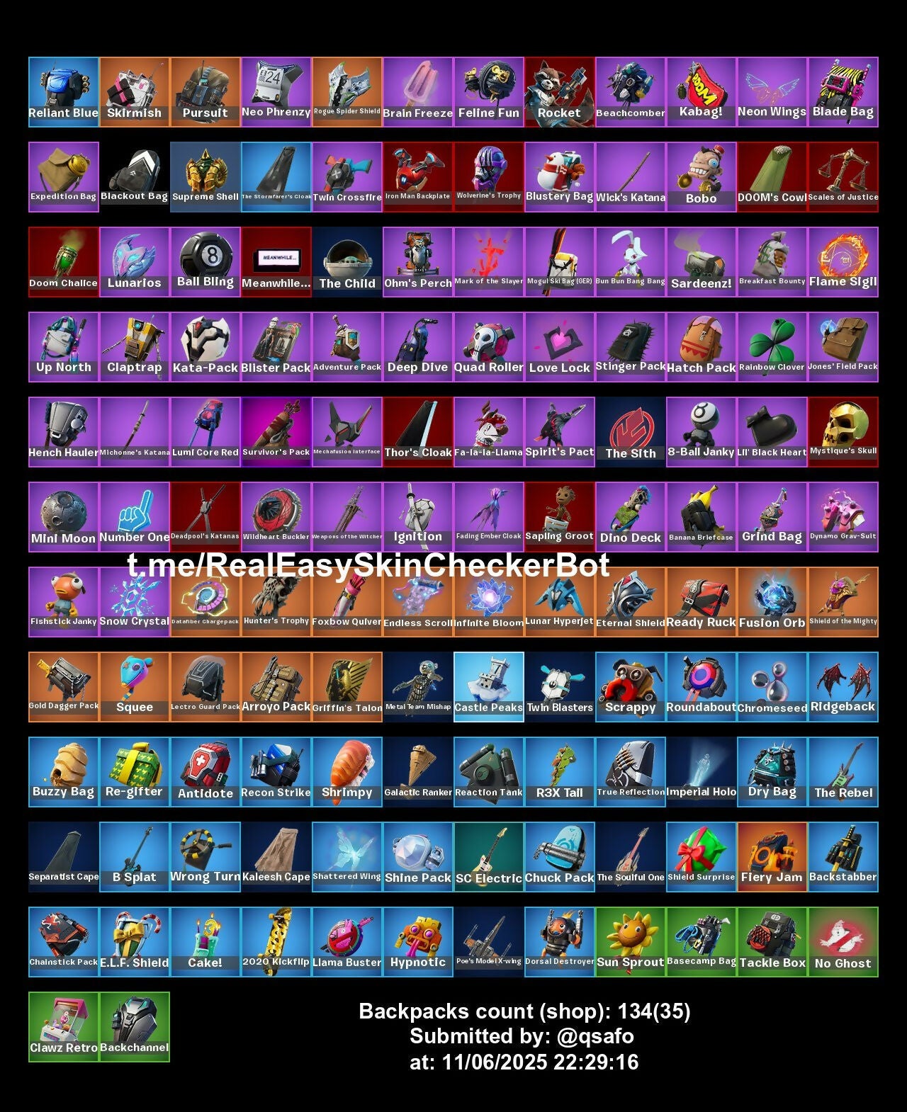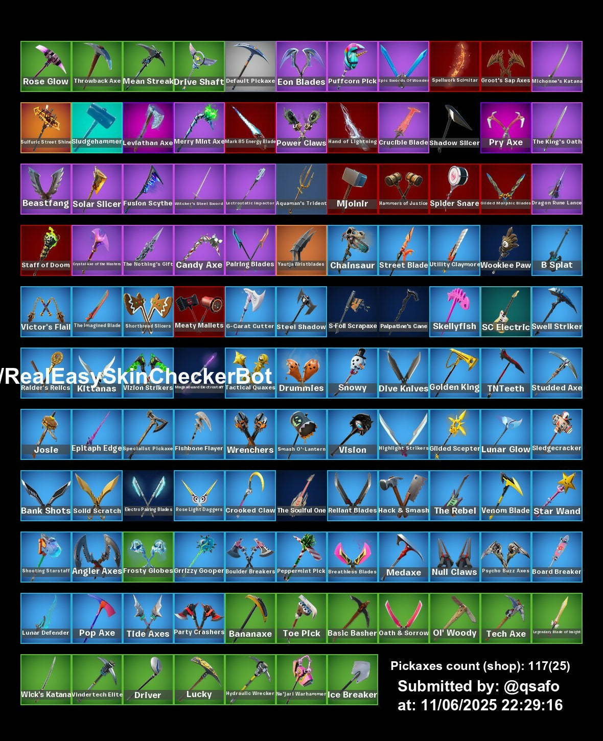 2020 Kickflip, 6-Carat Cutter, 8-Ball Janky, 8-Ball vs Scratch, A Warrior Prepares, Adira, Adventure Pack, Agent Jones, Agent Peely, Air Shredder, Alli, Angler Axes, Antidote, Apprentice Evie, Aquaman, Aquaman's Trident, Arachrobatics, Arctic Adeline, Arroyo Pack, Aura, B Splat, B.R.U.T.E. Gunner, Backchannel, Backscatter, Backstabber, Balance Board, Ball Bling, Banana Briefcase, Bananaxe, Bank Shots, Basecamp Bag, Basic Basher, Beachcomber, Bean Bag, Bear Hug, Beastfang, Beep Beep, Bhangra Boogie, Blackout Bag, Blade Bag, Blister Pack, Blowin' Up, Blustery Bag, Board Breaker, Bobo, Bold Stance, Boling!, Boogie Down, Boomin', Boots 'n' Cats, Boulder Breakers, Brain Freeze, Breakfast Bounty, Breathless Blades, Brutus, Buckle Up, Bun Bun Bang Bang, Burnoff, Burst Case Scenario, Bushranger, Buzzy Bag, Bytes, Cake!, Call Me, Cameo vs Chic, Candy Axe, Cap Kick, Cardistry, Castle Peaks, Chainsaur, Chainstick Pack, Chimichanga!, Chrome Punk, Chromeseed, Chuck Pack, Claptrap, Clawz Retro, Clean Sweep, Cluck, Codename E.L.F., Coin Flip, Contract Giller, Crooked Claw, Crowning Achievement, Crucible Blade, Crystal Axe of The Masters, Cyclo Curl, DOOM's Cowl, Dagger Dance, Dance Moves, Databfer Chargepack, Deadpool, Deadpool's Katanas, Deep Dab, Deep Dive, Default, Default Pickaxe, Denied, Derby Dynamo, Diamond Diva, Dino Deck, Dirtbike Challenge, Dive Knives, Doctor Doom, Dominion, Don't Start Now, Doom Chalice, Doom Slayer, Dorsal Destroyer, Dragon Rune Lance, Dream, Dream Feet, Drive Shaft, Driver, Droop, Drummies, Dry Bag, Dummy, Dynamo Grav-Suit, E.L.F. Shield, Echo, Electro Pairing Blades, Electrostatic Impactor, Emperor Palpatine, Endless Scroll, Eon Blades, Epic Swords Of Wonder, Epitaph Edge, Eternal Knight, Eternal Shield, Evasive Maneuvers, Evie, Expedition Bag, Fa-la-la-llama, Fade, Fading Ember Cloak, Fancy Feet, Feel the Force, Feline Fun, Fiery Jam, Fishbone Flayer, Fishstick Janky, Flame Sigil, Flippin' Away, Focus, Foxbow Quiver, Frost Squad, Frosty Globes, Frozen Fishstick, Frozen Nog Ops, Fusion, Fusion Orb, Fusion Scythe, Galactic Ranker, Gear Specialist Maya, General Grievous, Geralt of Rivia, Get Loose, Gilded Morphic Blades, Gilded Scepter, Glitter, Glow, Go Mufasa, Gold Dagger Pack, Golden King, Griffin's Talon, Grind Bag, Grizzly Gooper, Groot, Groot's Sap Axes, Grriz, Guff Gringle, Hack & Smash, Hammers of Justice, Hand of Lightning, Hatch Pack, Have a Seat, Haze, Hench Hauler, High Five, Highlight Strikers, Hula Hoopin', Hunter's Trophy, Hydraulic Wrecker, Hypnotic, I Declare!, I'm Diamond, Ice Breaker, Igni Sign, Ignition, Imperial Holo, Indiana Jones, Infinite Bloom, Instinct, Introducing..., Iris, Iron Man Backplate, It Is Finished, It's Dynamite!, It's a Vibe, Jabba Switchway, Jennifer Walters, Joltara, Jones' Field Pack, Josie, Journey vs Hazard, Jules, Kabag!, Kaleesh Cape, Kata-Pack, Keyed Up, Kit, Kittanas, Kondor, Lara Croft, Laser Focused, Last Forever, Laugh It Up, Lectro Guard Pack, Lennox, Leviathan Axe, Lexa, Lil' Black Heart, Lil' Prancer, Lil' Resistance Bomber, Llama Buster, Llambro, Love Lock, Lt. Evergreen, Lucky, Lucky Rider, Lumi Core Red, Lunar Defender, Lunar Glow, Lunar HyperJet, Lunar Party, Lunarios, Magguard Electrostaff, Maki Master, Malik, Mancake, Mandalorian, Mark 85 Energy Blade, Mark of the Slayer, Mashed Potato, Massai, Mave, Mean Streak, Meanwhile..., Meaty Mallets, Mechafusion Interface, Medaxe, Members Only, Menace, Meow Skulls, Meowscles, Merry Mint Axe, Metal Team Mishap, Mezmer, Michonne, Michonne's Katana, Midas, Mind Blown, Mini Dogfight, Mini Moon, Mini Slayer Fistbump, Mjolnir, Mogul Master (GER), Mogul Ski Bag (GER), Mystique, Mystique's Skull, Nailed It, Ne'jari Warhammer, Neo Phrenzy, Neo Versa, Neon Wings, Never Gonna, Neymar Jr, Ninja Style, Nitebeam, No Ghost, Null Claws, Number One, OMG I Love It, Oath & Sorrow, Ocean, Ohm's Perch, Ol' Woody, Out West, Out With The Old, Pairing Blades, Palpatine's Cane, Pandemonium, Paradygim (like edgy), Party Crashers, Party Hips, Paws & Claws, Peppermint Pick, Phew!, Pirouette, Planetary Vibe, Poe Dameron, Poe's Model X-wing, Point Patroller, Poised Playmaker, Pop Axe, Power Claws, Predator, Pry Axe, Psycho Bandit, Psycho Buzz Axes, Puffcorn Pick, Pursuit, Quad Roller, R3X Tail, Rage, Raider's Relics, Rainbow Clover, Raise The Roof, Raven's Legion, Raz, Re-gifter, Reaction Tank, Ready Ruck, Recon Strike, Reese, Reliant Blades, Reliant Blue, Remedy vs Toxin, Respect The Peace, Revel, Ride The Pony, Ridgeback, Rippley vs Sludge, Rock Paper Scissors, Rocket, Rogue Spider Knight, Rogue Spider Shield, Rose, Rose Glow, Rose Light Daggers, Rose Team Leader, Roundabout, Ruby Shadows, S-Foil Scrapaxe, SC Electric, Sapling Groot, Sardeenz!, Savage, Savor The W, Say So, Scales of Justice, Scarlet Commander, Scrappy, Scuba Jonesy, Seeker, Selene, Separatist Cape, Shadow Slicer, Shaolin Sip, Sharpshooter, Shattered Wing, Shield Surprise, Shield of the Mighty, Shine Pack, Shooting Starstaff, Shortbread Slicers, Shrimpy, Side Hustle, Sing Along, Siona, Skellyfish, Skirmish, Skye, Sled Ready Guff, Sledgecracker, Sludgehammer, Smash O'-Lantern, Snap, Snow Crystal, Snowmando, Snowshaker, Snowy, So Square, Solar Slicer, Solid Scratch, Sorana, Sparkplug, Specialist Pickaxe, Spellwork Scimitar, Spider Snare, Spider-Gwen, Spirit's Pact, Splatterella, Springy, Squee, Staff of Doom, Star Wand, Steady, Steel Shadow, Stinger Pack, Storm, Stormy, Street Blade, Studded Axe, Sulfuric Street Shine, Sun Sprout, Supreme Shell, Survivor's Pack, Swell Striker, TNTeeth, TNTina, Tackle Box, Tactical Quaxes, Take The Cake, Take a 'bow, Tarana, Tart Tycoon, Tech Axe, Tectonic Komplex, The Child, The Dance LARO, The Devourer, The Herald, The Imagined Blade, The King's Oath, The Nothing's Gift, The Rebel, The Renegade, The Rick Dance, The Sith, The Soulful One, The Stormfarer's Cloak, Thor, Thor's Cloak, Throwback Axe, Tide Axes, Tippy Tap, Toasty Roast, Toe Pick, Tony Stark, Toosie Slide, Trilogy, True Reflection, Turk vs Ri
