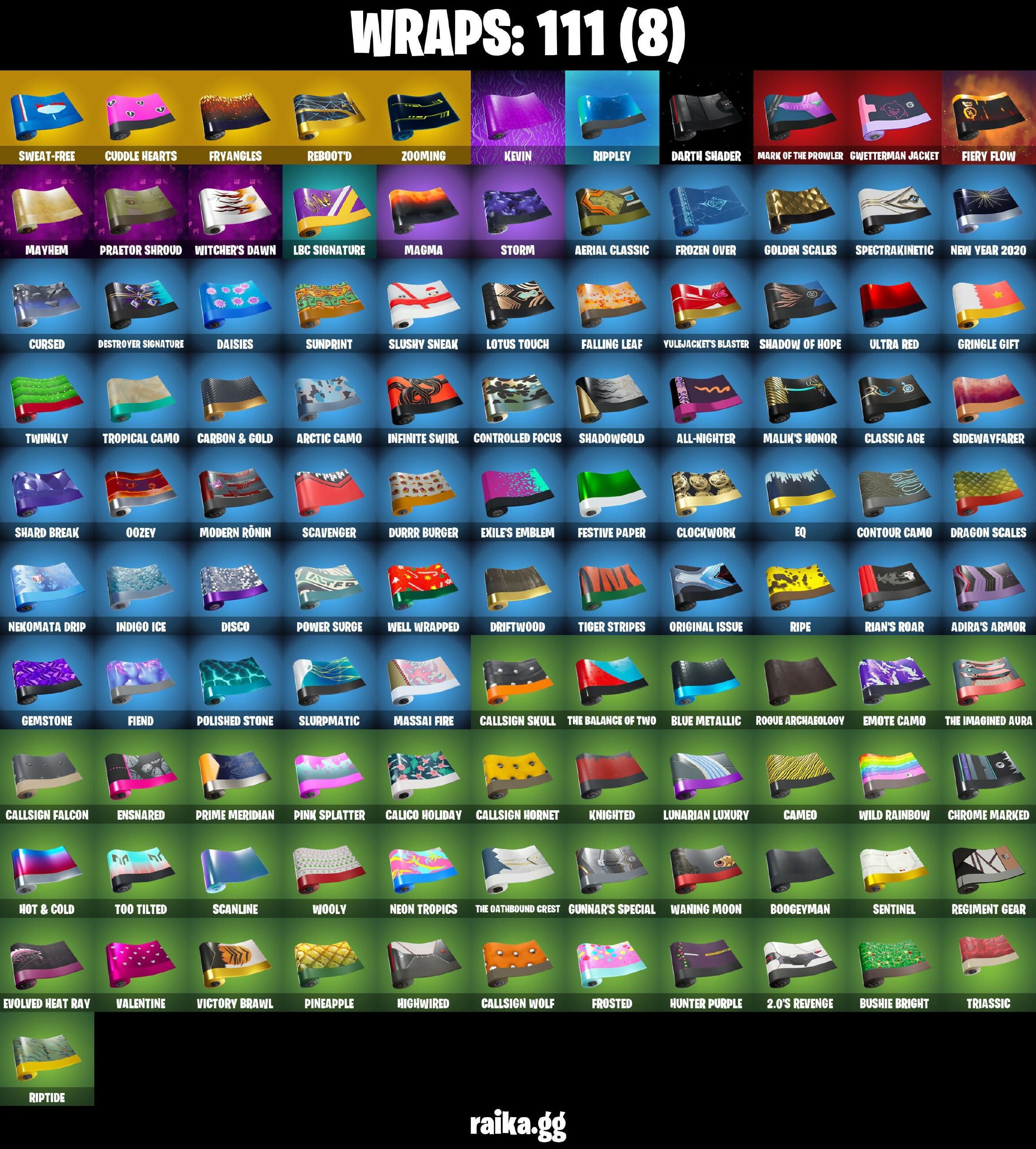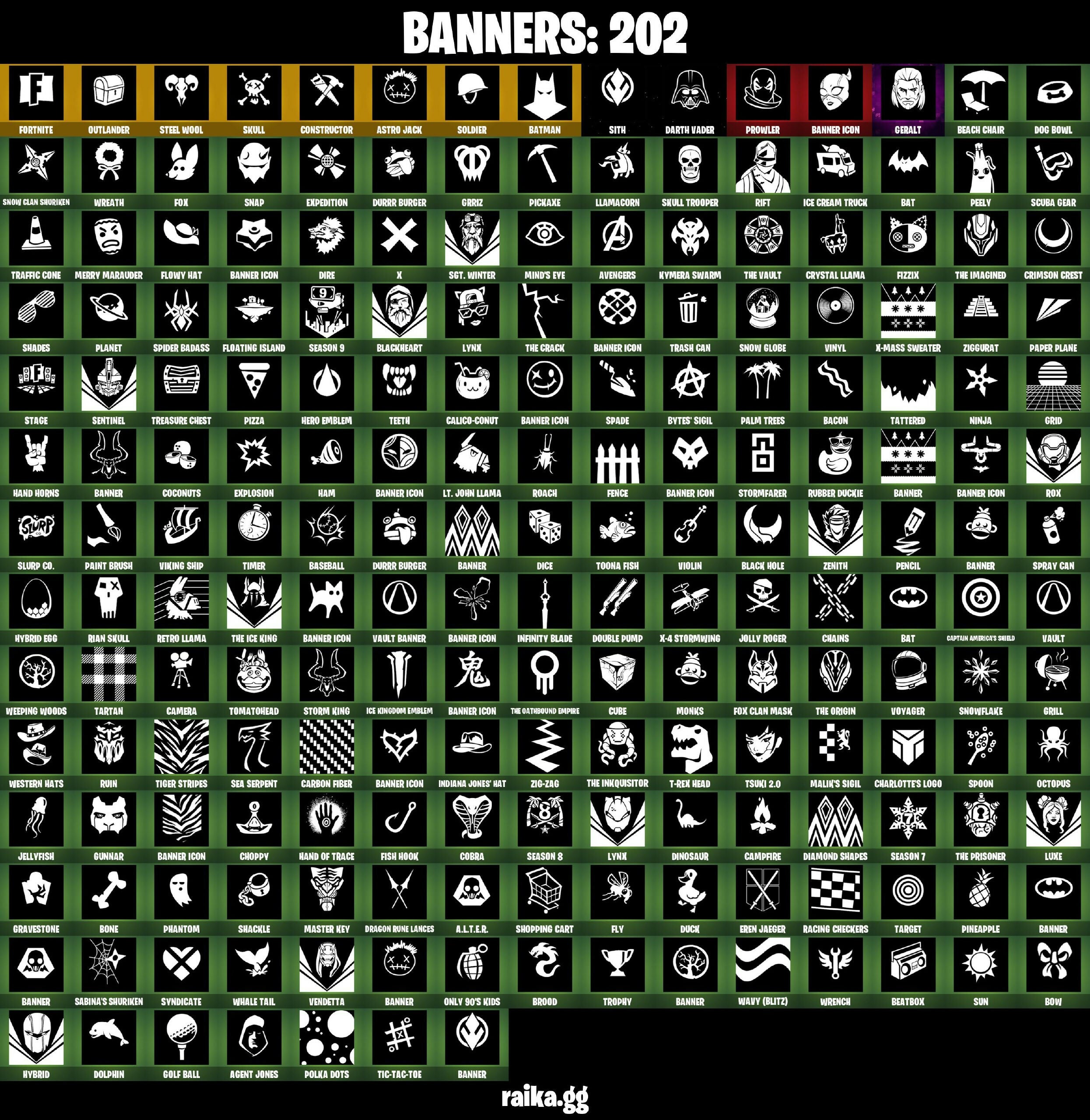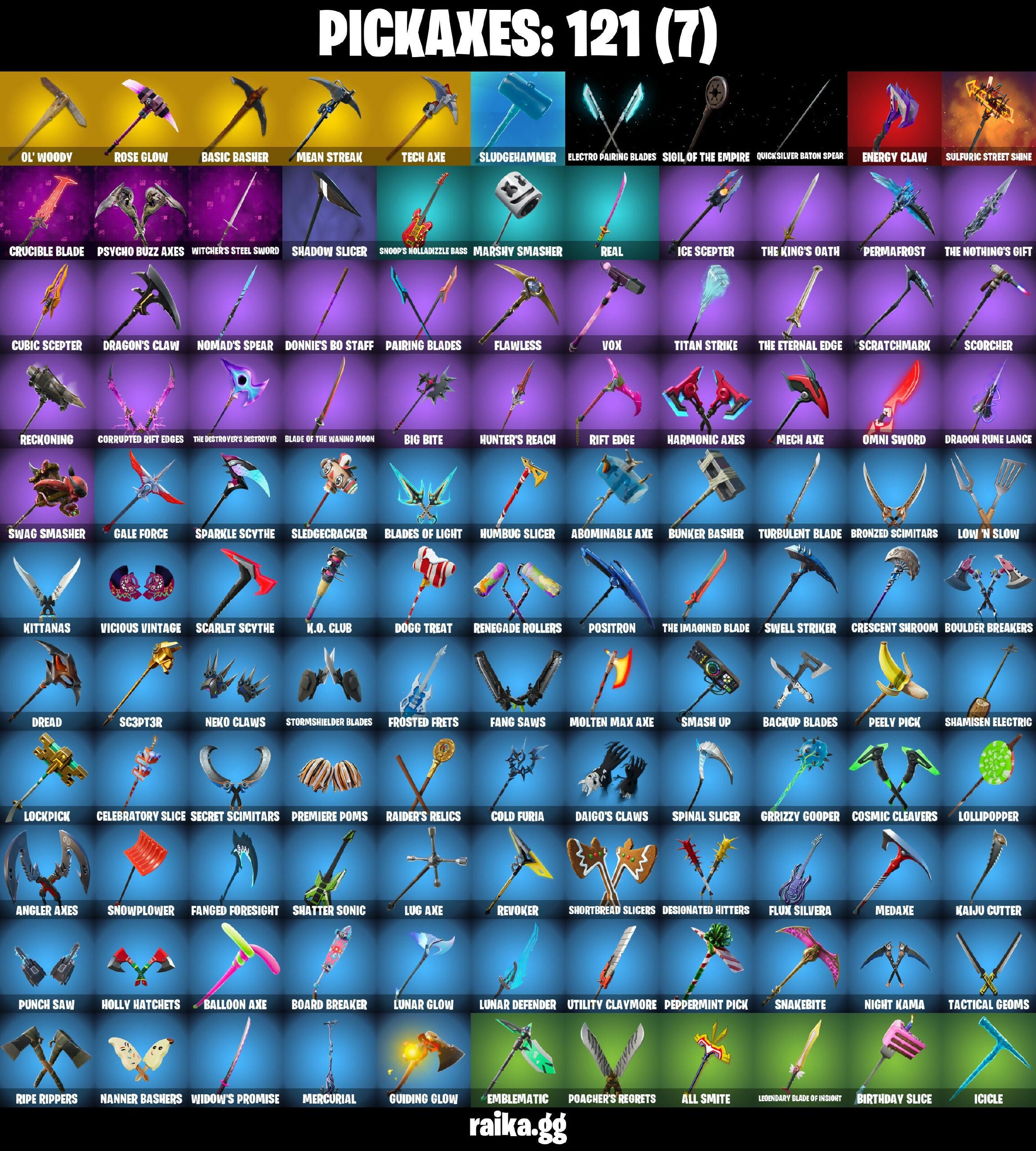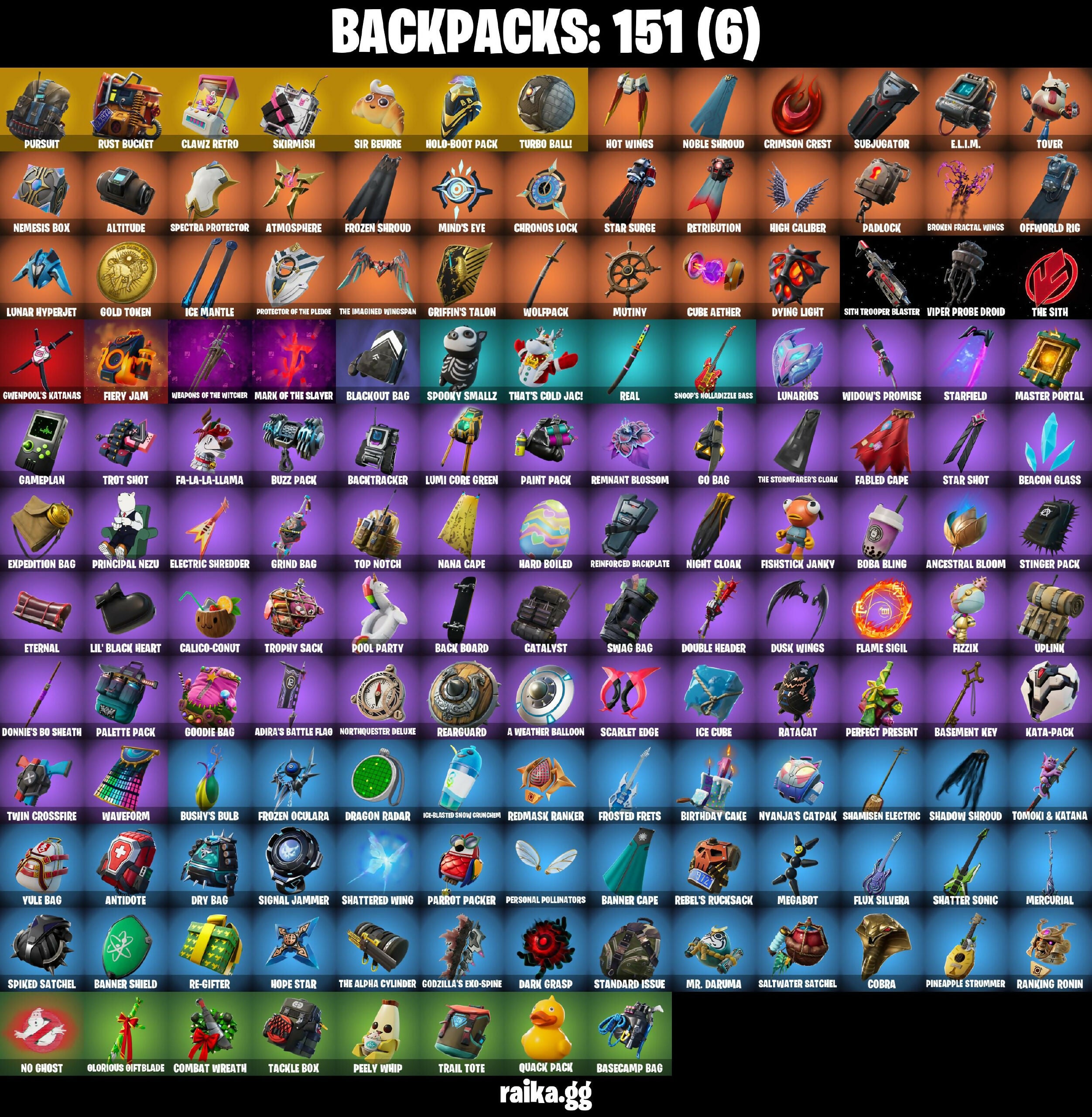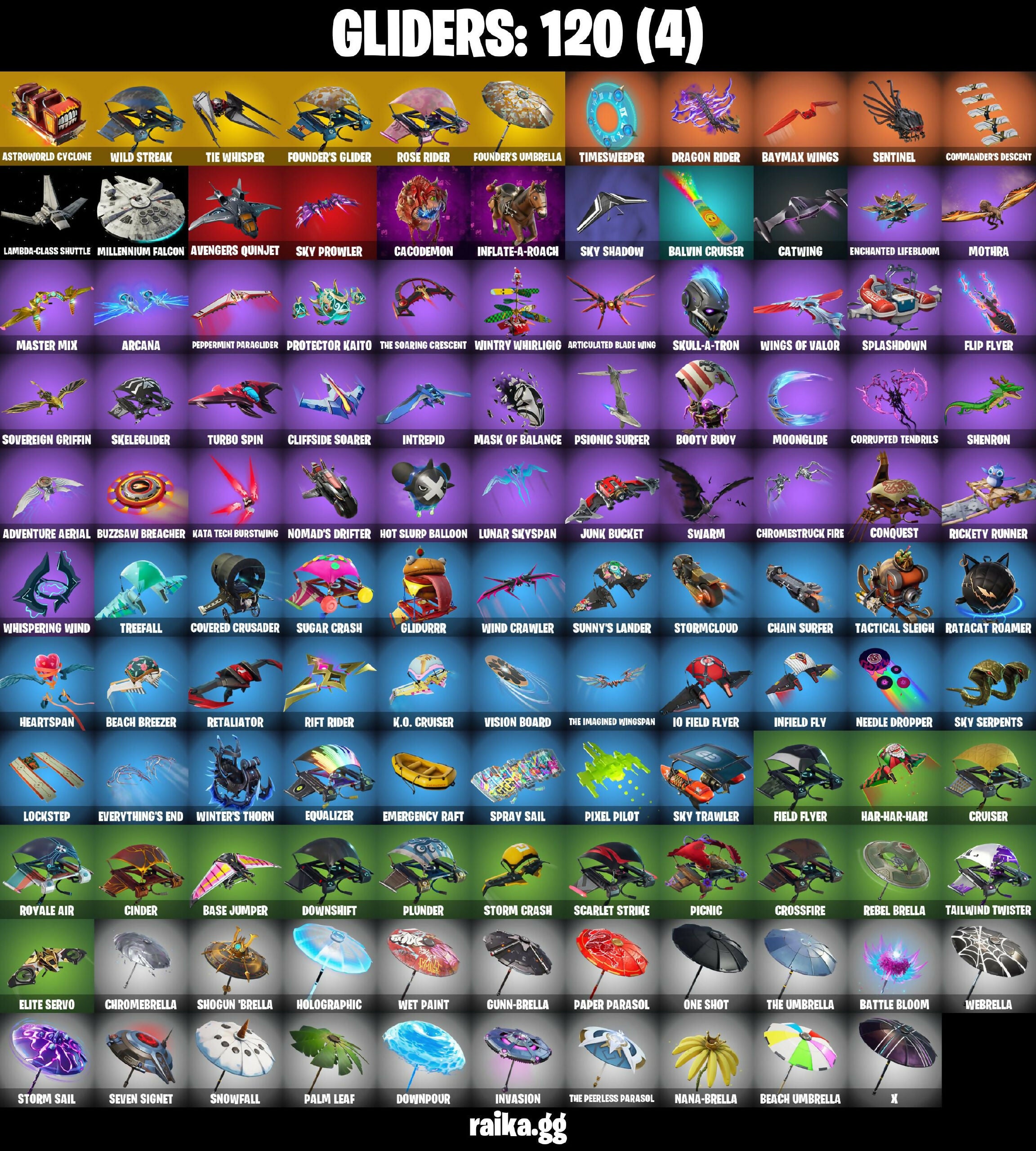 10 Field Flyer, 2.0's Revenge, A Weather Balloon, A.I.M., A.L.T.E.R., Abominable Axe, Adira, Adira's Armor, Adira's Battle Flag, Adventure Aerial, Aerial Classic, Agent Jones, Air Horn, All Might, All Smite, All-Nighter, Altitude, Ancestral Bloom, Angler Axes, Antidote, Arcana, Arctic Adeline, Arctic Camo, Articulated Blade Wing, Astro Antidote, Astro Jack, Astroworld Cyclone, Atmosphere, Avengers, Avengers Quinjet, Back Board, Backtracker, Backup Blades, Bacon, Balance Board, Balloon Axe, Balvin Cruiser, Banner, Banner Cape, Banner Icon, Banner Shield, Base Jumper, Baseball, Basecamp Bag, Basement Key, Basic Basher, Bat, Batman, Battle Ball, Battle Bloom, Battle Call, Battlehawk, Baymax Wings, Beach Breezer, Beach Chair, Beach Umbrella, Beacon Glass, Beatbox, Big Bite, Birthday Cake, Birthday Slice, Black Hole, Blackheart, Blackout Bag, Blade Of The Waning Moon, Blades Of Light, Blizzabelle, Blowin' Up, Blowing Bubbles, Blue Metallic, Board Breaker, Boba Bling, Boba Snack, Bone, Boogeyman, Boogie Down, Boosting Ki, Booty Buoy, Boulder Breakers, Bow, Breakdown, Breakin', Breakneck, Breakpoint, Broken Fractal Wings, Bronzed Scimitars, Brood, Bunker Basher, Bunker Jonesy, Burnoff, Bushie Bright, Bushy's Bulb, Buzz Pack, Buzzsaw Breacher, Bytes, Bytes' Sigil, Cacodemon, Calamity, Calculated, Calico Holiday, Calico-Conut, Call Me, Callsign Falcon, Callsign Hornet, Callsign Skull, Callsign Wolf, Cameo, Camera, Campfire, Captain America’s Shield, Carbide, Carbon & Gold, Carbon Fiber, Cat Flip, Catalyst, Catwing, Celebratory Slice, Chain Surfer, Chains, Chapter 3 Island Theme, Chapter 4 Island Theme, Chapter 5 Island Theme, Charging Up, Charlotte's Logo, Chef's Special, Choice Knit, Choppy, Chrome Marked, Chromebrella, Chromestruck Fire, Chronos Lock, Cinder, Classic Age, Clawz Retro, Clean Sweep, Cliffside Soarer, Clockwork, Cluck Strut, Cobalt, Cobra, Coconuts, Cold Furia, Combat Wreath, Commander's Descent, Conga, Conquest, Constructor, Contour Camo, Controlled Focus, Corrupted Rift Edges, Corrupted Tendrils, Cosmic Cleavers, Covered Crusader, Crescent Shroom, Crimson Crest, Crossfire, Crowning Achievement, Crucible Blade, Cruiser, Crystal Llama, Cube, Cube Aether, Cubic Scepter, Cuddle Hearts, Cursed, Cyclo Curl, DJ Yonder, Dabstand, Daigo, Daigo's Claws, Daisies, Dark Grasp, Darth Shader, Darth Vader, Deep End, Demi, Designated Hitters, Destroyer Signature, Diamond Shapes, Dice, Dinosaur, Dire, Disco, Dog Bowl, Dogg Treat, Dolphin, Dominion, Donatello, Donnie's Bo Sheath, Donnie's Bo Staff, Doom Slayer, Double Header, Double Pump, Downpour, Downshift, Dragon Radar, Dragon Rider, Dragon Rune Lances, Dragon Scales, Dragon Stance, Dragon's Claw, Dragoon Rune Lance, Dread, Dream, Drift, Driftwalker, Driftwood, Droop, Dry Bag, Duck, Durrr Burger, Dusk, Dusk Wings, Dusty, Dying Light, E.L.I.M., Electric Shredder, Electro Pairing Blades, Elite Servo, Ember, Emblematic, Emergency Raft, Emote Camo, Enchanted Lifebloom, Energy Claw, Enforcer, Ensnared, Eq, Equalizer, Era, Eren Jaeger, Eternal, Eternal Voyager, Everybody Dance!, Everything's End, Evie, Evolved Heat Ray, Exile's Emblem, Expedition, Expedition Bag, Explosion, Expressionism, Fa-La-La-Llama, Fable, Fabled Cape, Falling Leaf, Fang Saws, Fanged Foresight, Fence, Festive Paper, Field Flyer, Fiend, Fierce, Fiery Flow, Fiery Jam, Fish Hook, Fishstick (World Cup), Fishstick Janky, Fist Bump, Fizzix, Flame Sigil, Flamenco, Flare, Flawless, Flip Flyer, Flippin' Sexy, Floating Island, Flowy Hat, Flux Silvera, Fly, Fortnite, Founder's Glider, Founder's Umbrella, Fox, Fox Clan Mask, Free Flow, Frosted, Frosted Frets, Frozen Oculata, Frozen Over, Frozen Shroud, Fryangles, Fusion! Hah!!, Gale Force, Gameplan, Gemstone, Gentleman's Dab, Geralt, Geralt Of Rivia, Get Funky, Get Out Of Your Mind, Giddy-Up, Glidrrr, Glorious Giftblade, Go Bag, Godzilla Evolved, Godzilla's Exo-Spine, Gold Token, Golden Scales, Golf Ball, Golf Clap, Goodie Bag, Gravestone, Grid, Griffin's Talon, Grill, Grind Bag, Gringle Gift, Grriz, Grrizzy Gooper, Guff Gringle, Guiding Glow, Gunn-Brella, Gunnar, Gunnar's Special, Gwenpool's Katanas, Gwetterman Jacket, Ham, Hand Horns, Hand of Trace, Har-Har-Har!, Hard Boiled, Harmonic Axes, Heartspan, Hello Friend, Helsie, Hero Baymax, Hero Emblem, High Caliber, High Five, Highwired, Holiday Boxy, Holly Hatchets, Holo-Boot Pack, Holographic, Hoop Master, Hope, Hope Star, Hot & Cold, Hot Slurp Balloon, Hot Stuff, Hot Wings, Human Bill, Humbug Slicer, Hunter Purple, Hunter's Reach, Huntress, Hybrid, Hybrid Egg, Hype, Hypnot-Eyes, I'm A Mystery, Ice Cream Truck, Ice Cube, Ice Kingdom Emblem, Ice Mantle, Ice Scepter, Ice-Blasted Snow Cruncher, Icicle, Igni Sign, Imani, Imperial March, In Da Party, Indiana Jones, Indiana Jones' Hat, Indigo Ice, Infield Fly, Infinite Swirl, Infinity, Infinity Blade, Inflate-A-Roach, Intrepid, Invasion, Invisible Cut, It Is Finished, It's Go Time!, J Balvin, Jade, Jaywalking, Jellyfish, Jet Signals, Jolly Roger, Journey Vs Hazard, Jubilation, Jump Around, Jump Jets, Jumpshot, Junk Bucket, K.O. Club, K.O. Cruiser, Kaiju Cutter, Kata Tech Burstwing, Kata-Pack, Keep It Mello, Kendo, Kevin, Kiara K.O., Kittanas, Knighted, Krisabelle, Kymera Swarm, Laguna, Laid Back Shuffle, Lambda-Class Shuttle, Laser Focused, Lbc Signature, Legendary Blade Of Insight, Lego Fortnite Theme, Lil' Black Heart, Lil' Godzilla Attack, Lil' Monster, Lil' Prancer, Liteshow, Llamacorn, Lobby Classic, Lockpick, Lockstep, Lollipopper, Lotus Touch, Low 'N Slow, Lt. Evergreen, Lt. John Llama, Lug Axe, Lumi Core Green, Lunar Charge, Lunar Defender, Lunar Glow, Lunar Hyperjet, Lunar Party, Lunar Skyspan, Lunarian Luxury, Lunarios, Luxe, Lynx, Magma, Malik, Malik's Honor, Malik's Sigil, Mark Of The Prowler, Mark of the Slayer, Marshy Smasher, Mask of Balance, Massai, Massai Fire, Master Key, Master Mix, Master Portal, Mayhem, Mean Streak, Mech Axe, Medaxe, Megabot, Mercurial, Merry Marauder, Mic Drop, Millennium Falcon, Min-Joon, Mind's Eye, Mini