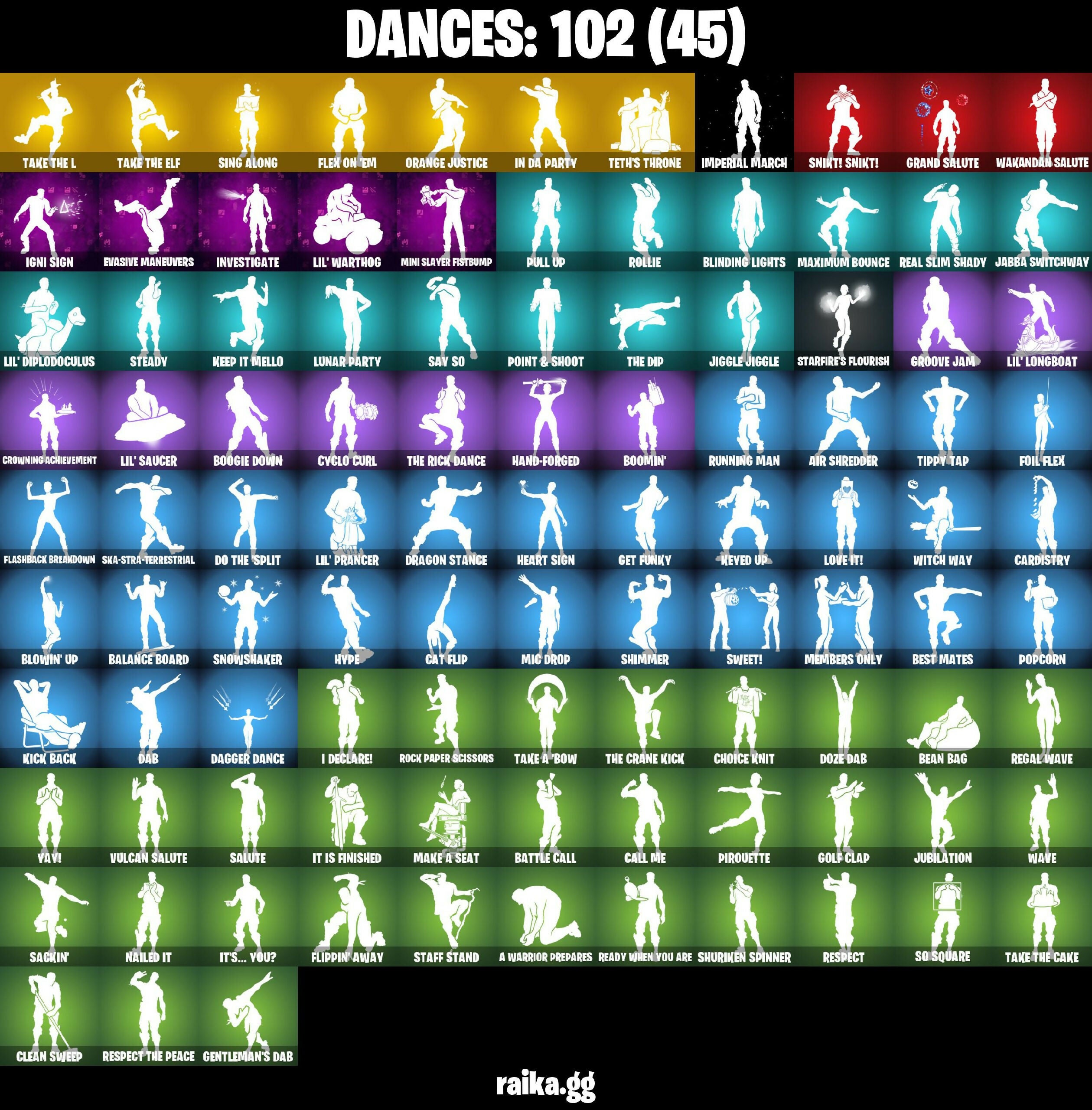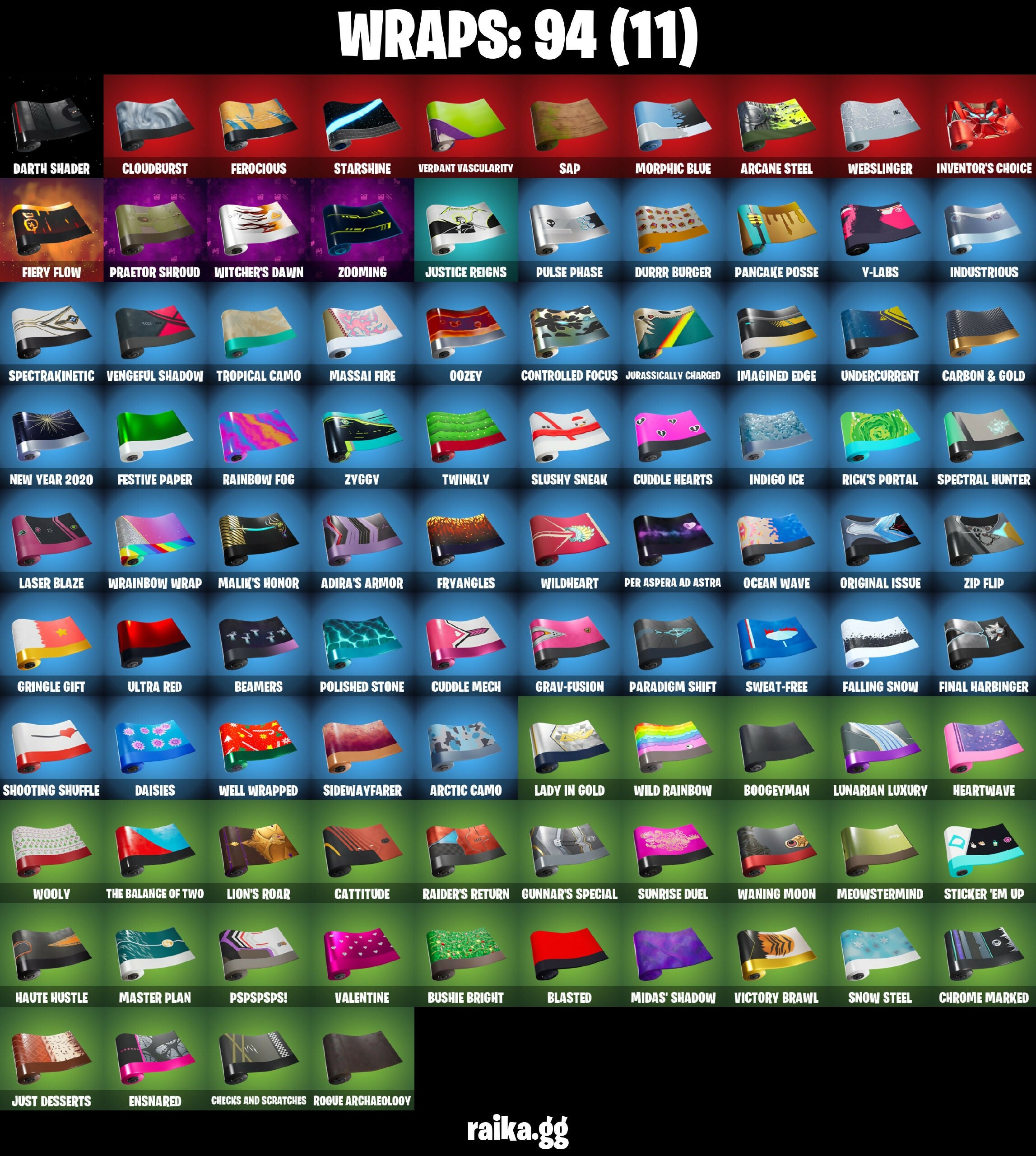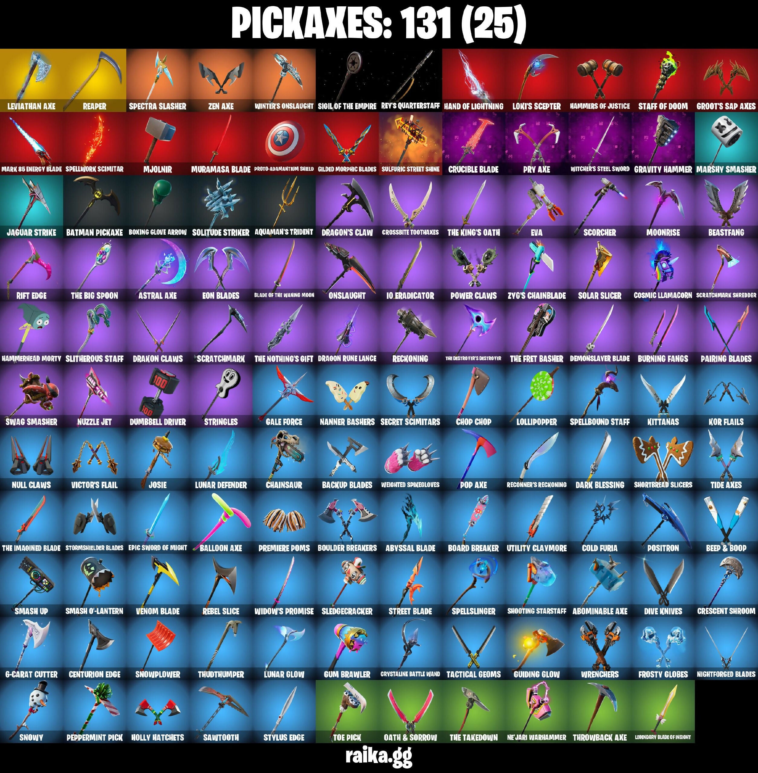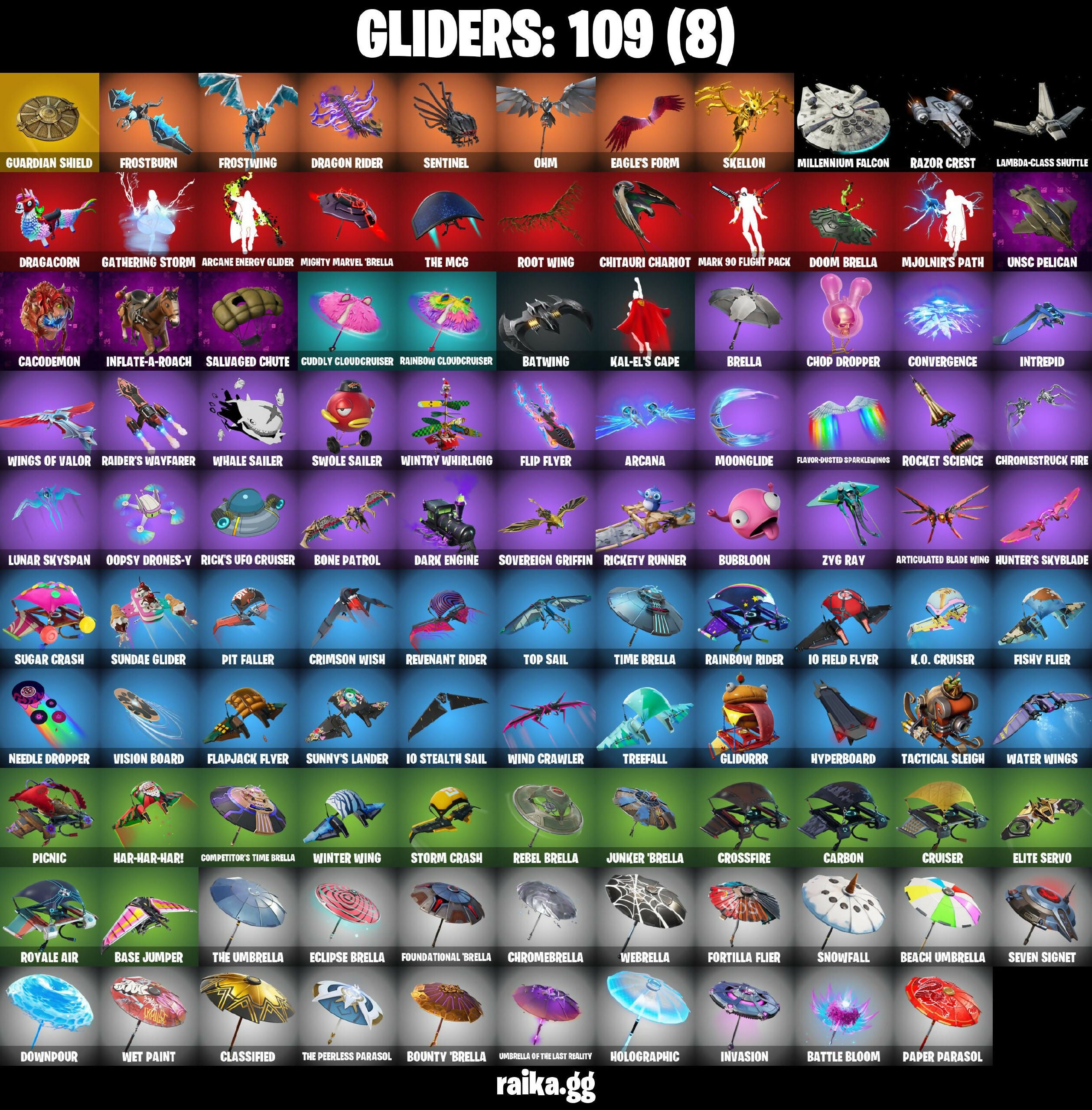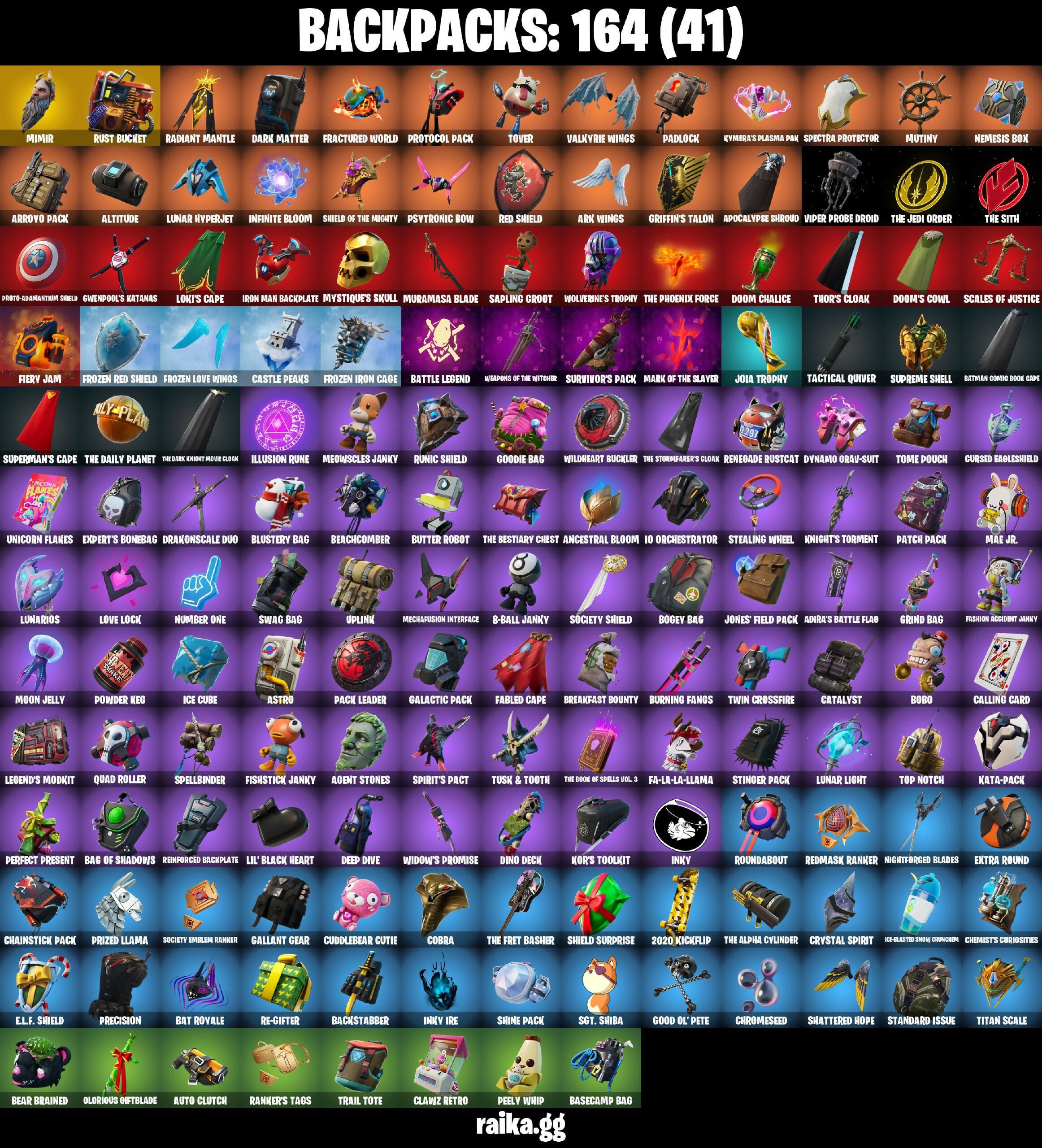 2020 Kickflip, 6-Carat Cutter, 8-Ball Janky, A Warrior Prepares, Abominable Axe, Absenz, Abyssal Blade, Adira, Adira's Armor, Adira's Battle Flag, Agent Jones, Agent Stones, Air Shredder, Altitude, Ancestral Bloom, Apocalypse Shroud, Aquaman, Aquaman's Trident, Arcana, Arcane Energy Glider, Arcane Steel, Arctic Adeline, Arctic Camo, Ark, Ark Wings, Arroyo Pack, Articulated Blade Wing, Astral Axe, Astro, Atlantean Fishstick, Auto Clutch, Backfire, Backstabber, Backup Blades, Bag Of Shadows, Balance Board, Balloon Axe, Base Jumper, Basecamp Bag, Bat Royale, Batman Comic Book Cape, Batman Comic Book Outfit, Batman Pickaxe, Battle Bloom, Battle Call, Battle Legend, Battlehawk, Batwing, Beach Umbrella, Beachcomber, Beamers, Bean Bag, Bear Brained, Beastfang, Beep & Boop, Best Mates, Blackheart, Blade of the Waning Moon, Blasted, Blinding Lights, Blowin' Up, Blustery Bag, Board Breaker, Bobo, Bogey Bag, Bone Patrol, Boogeyman, Boogie Down, Boomin', Boulder Breakers, Bounty 'Brella, Boxing Glove Arrow, Breakfast Bounty, Brella, Bubloon, Burning Fangs, Bushie Bright, Butter Robot, Bytes, Cacodemon, Calamity, Call Me, Calling Card, Captain America, Carbide, Carbon, Carbon & Gold, Cardistry, Castle Peaks, Castor, Cat Flip, Catalyst, Cattitude, Centio, Centurion, Centurion Edge, Chainsaur, Chainstick Pack, Charlotte, Checks And Scratches, Chemist's Curiosities, Chitauri Chariot, Choice Knit, Chop Chop, Chop Dropper, Chrome Marked, Chromebrella, Chromeseed, Chromestruck Fire, Clark Kent, Classified, Clawz Retro, Clean Sweep, Cloudburst, Cobalt, Cobra, Codename E.L.F., Cold Furia, Competitor's Time Brella, Controlled Focus, Convergence, Cosmic Llamacorn, Crescent Shroom, Crimson Wish, Crossbite Toothaxes, Crossfire, Crowning Achievement, Crucible Blade, Cruiser, Crystal Spirit, Crystalline Battle Wand, Cuddle Hearts, Cuddle Mech, Cuddlebear Cutie, Cuddly Cloudcruiser, Cursed Eagleshield, Cyclo Curl, Cyclone, DJ Yonder, Dab, Dagger Dance, Daisies, Dark, Dark Blessing, Dark Engine, Dark Matter, Dark Phoenix, Dark Voyager, Darth Shader, Darth Vader, Deep Dive, Delirium, Demonslayer Blade, Derby Dynamo, Diamond Diva, Dino Deck, Dive Knives, Dizzie, Do The Split, Doctor Doom, Doctor Slone, Dominus GT, Doom Brella, Doom Chalice, Doom Slayer, Doom's Cowl, Downpour, Doze Dab, Dragacorn, Dragon Rider, Dragon Stance, Dragon's Claw, Dragoon Rune Lance, Drakon Claws, Drakon Steel Hybrid, Drakonscale Duo, Drift, Dumbbell Driver, Durrr Burger, Dynamo Grav-Suit, E.L.F. Shield, Eagle's Form, Eclipse Brella, Elite Servo, Elmira, Ensnared, Eon Blades, Epic Sword of Might, Etheria, Eva, Evasive Maneuvers, Evie, Expert's Bonebag, Extra Round, Fa-La-La-Llama, Fabio Sparklemane, Fabled Cape, Fade, Falling Snow, Fashion Accident Janky, Ferocious, Festive Paper, Fiery Flow, Fiery Jam, Final Harbinger, Fishstick Janky, Fishy Flier, Flapjack Flyer, Flashback Breakdown, Flavor-Dusted Sparklewings, Flex On 'Em, Flip Flyer, Flippin' Away, Foil Flex, Fortilla Flier, Foundational 'Brella, Fractured World, Frost Squad, Frostburn, Frostwing, Frosty Globes, Frozen Fishstick, Frozen Iron Cage, Frozen Love Ranger, Frozen Love Wings, Frozen Nog Ops, Frozen Raven, Frozen Red Knight, Frozen Red Shield, Fryangles, Fyra, Galactic Pack, Galaxia, Gale Force, Gallant Gear, Gathering Storm, Gentleman's Dab, Geralt of Rivia, Get Funky, Ghoul Trooper, Gia, Giddy-up, Gilded Morphic Blades, Glidurr, Glorious Giftblade, Golf Clap, Good Ol' Pete, Goodie Bag, Grand Salute, Grav-Fusion, Gravity Hammer, Green Arrow, Griffin's Talon, Grim Fable, Grind Bag, Gringle Gift, Groot, Groot's Sap Axes, Groove Jam, Guardian Shield, Guggimon, Guiding Glow, Gum Brawler, Gunnar's Special, Gwenpool's Katanas, Hammerhead Morty, Hammers of Justice, Hand of Lightning, Hand-Forged, Har-Har-Har!, Haute Hustle, Heart Sign, Heartwave, Hemlock, Holiday Boxy, Holly Hatchets, Holographic, Hunter's Skyblade, Huntress, Hybrid, Hype, Hyperboard, I Declare!, IO Field Flyer, IO Orchestrator, IO Stealth Sail, Ice Cube, Ice-Blasted Snow Cruncher, Igni Sign, Illusion Rune, Imagined Edge, Imperial March, In Da Party, Indigo Ice, Industrious, Infinite Bloom, Inflate-A-Roach, Inky, Inky Ire, Intrepid, Invasion, Inventor's Choice, Investigate, Io Eradicator, Iris, Iron Man Backplate, Isabelle, It Is Finished, It's... You?, Jabba Switchway, Jaguar Strike, Jennifer Walters, Jiggle Jiggle, Joey, Joia Trophy, Jones' Field Pack, Josie, Jubilation, Jules, Junker 'Brella, Jurassically Charged, Just Desserts, Justice Reigns, Jäger 619, K.O. Cruiser, Kal-El's Cape, Kata-Pack, Keep It Mello, Keyed Up, Kick Back, Kit, Kittanas, Knight's Torment, Kondor, Kor, Kor Flails, Kor's Toolkit, Kratos, Kymera, Kymera's Plasma Pak, Lady In Gold, Lambda-Class Shuttle, Lamborghini Huracán STO, Lara Croft, Laser Blaze, Legend's Modkit, Legendary Blade of Insight, Leviathan Axe, Lexa, Lil Split, Lil' Black Heart, Lil' Diplodoculus, Lil' Longboat, Lil' Prancer, Lil' Saucer, Lil' Warthog, Lion's Roar, Loki Laufeyson, Loki's Cape, Loki's Scepter, Lollipopopper, Love It!, Love Lock, Loveless, Lt. Evergreen, Luminos, Lunar Defender, Lunar Glow, Lunar Hyperjet, Lunar Light, Lunar Party, Lunar Skyspan, Lunarian Luxury, Lunarios, Lynx, Lyra, Mae Jr., Make A Seat, Malik, Malik's Honor, Mancake, Mandalorian, Mariana, Mark 85 Energy Blade, Mark 90 Flight Pack, Mark Of The Slayer, Marshy Smasher, Masamune, Massai, Massai Fire, Master Chief (Matte Black), Master Plan, Mave, Maximum Bounce, Mecha Cuddle Master, Mecha Strike Defender, Mechafusion Interface, Members Only, Menace, Meowscles Janky, Meowstermind, Mic Drop, Midas' Shadow, Mighty Marvel 'Brella, Millennium Falcon, Mimir, Min-Joon, Mini Slayer Fistbump, Mission Specialist, Mjolnir, Mjolnir's Path, Moon Jelly, Moonglide, Moonrise, Moonwalker, Morphic Blue, Muramasa Blade, Mutiny, Mystique, Mystique's Skull, Nailed It, Nanner Bashers, Ne-Jari Warhammer, Needle Dropper, Nemesis Box, New Year 2020, Neymar Jr, Nightforged Blades, Null Claws, Number One, Nuzzle Jet, Oath &
