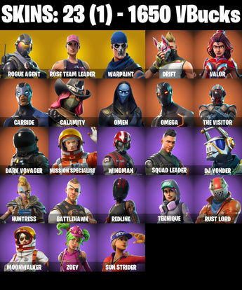 🎆23 SKINS ⚡️PC⚡️ ROGUE AGENT 👑 DRIFT 👑 VALOR 👑 CARBIDE 👑 CALAMITY 👑 OMEN 👑 OMEGA 👑 THE VISITOR 👑 DARK VOYAGER 👑 MISSION SPECIALIST ⚡️ 1650 VB 📧 MAIL CHANGEABLE #M171