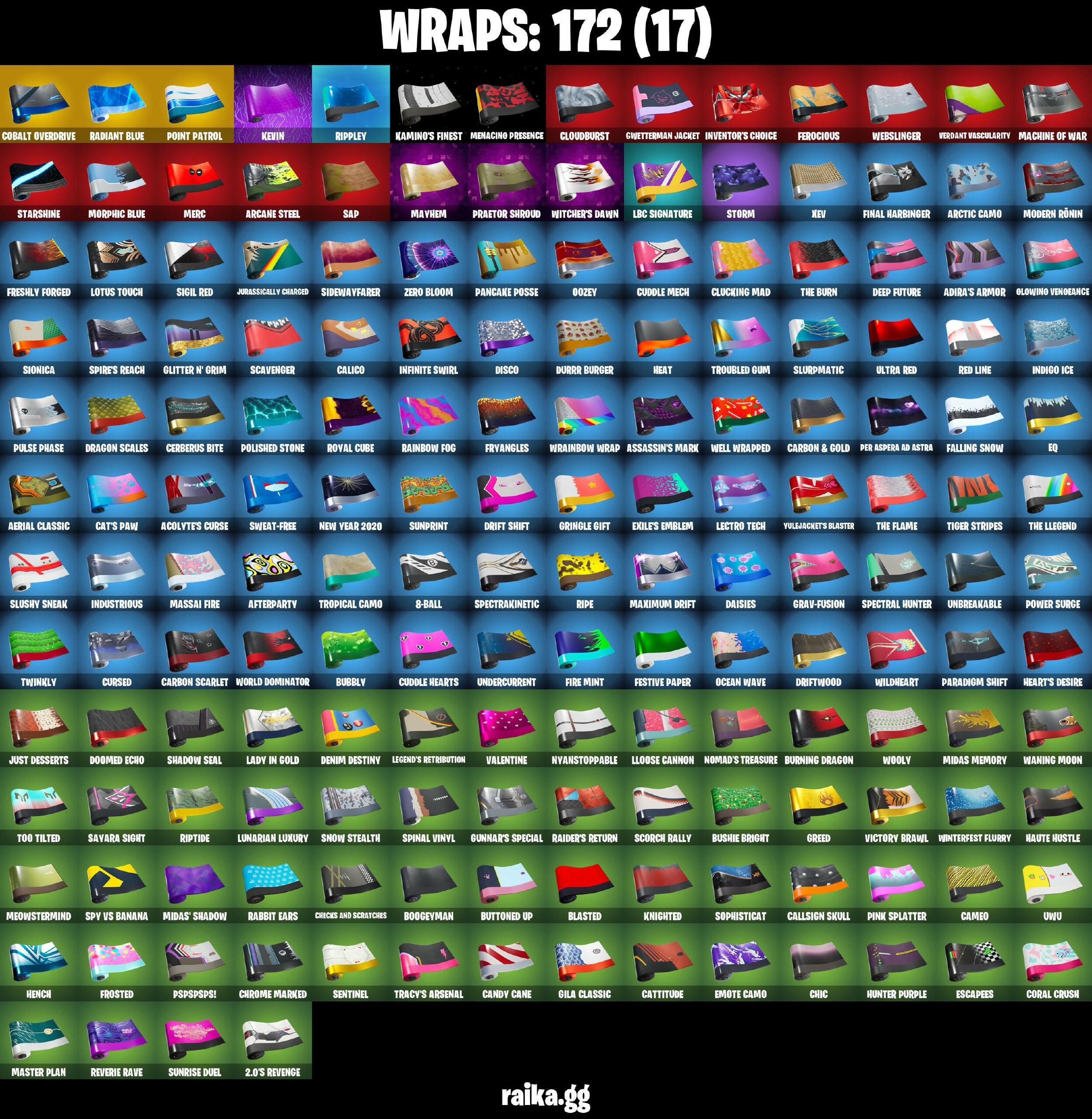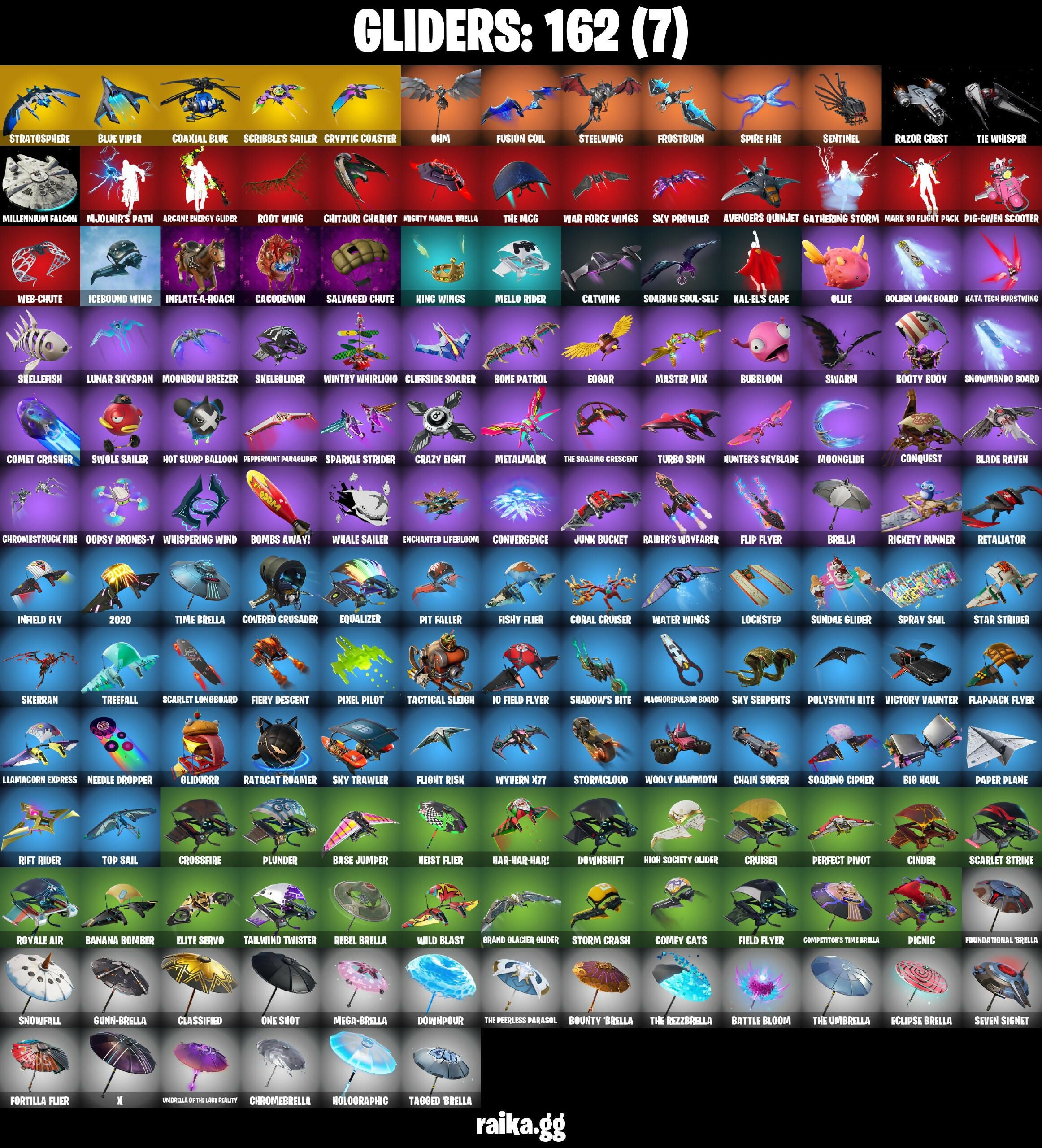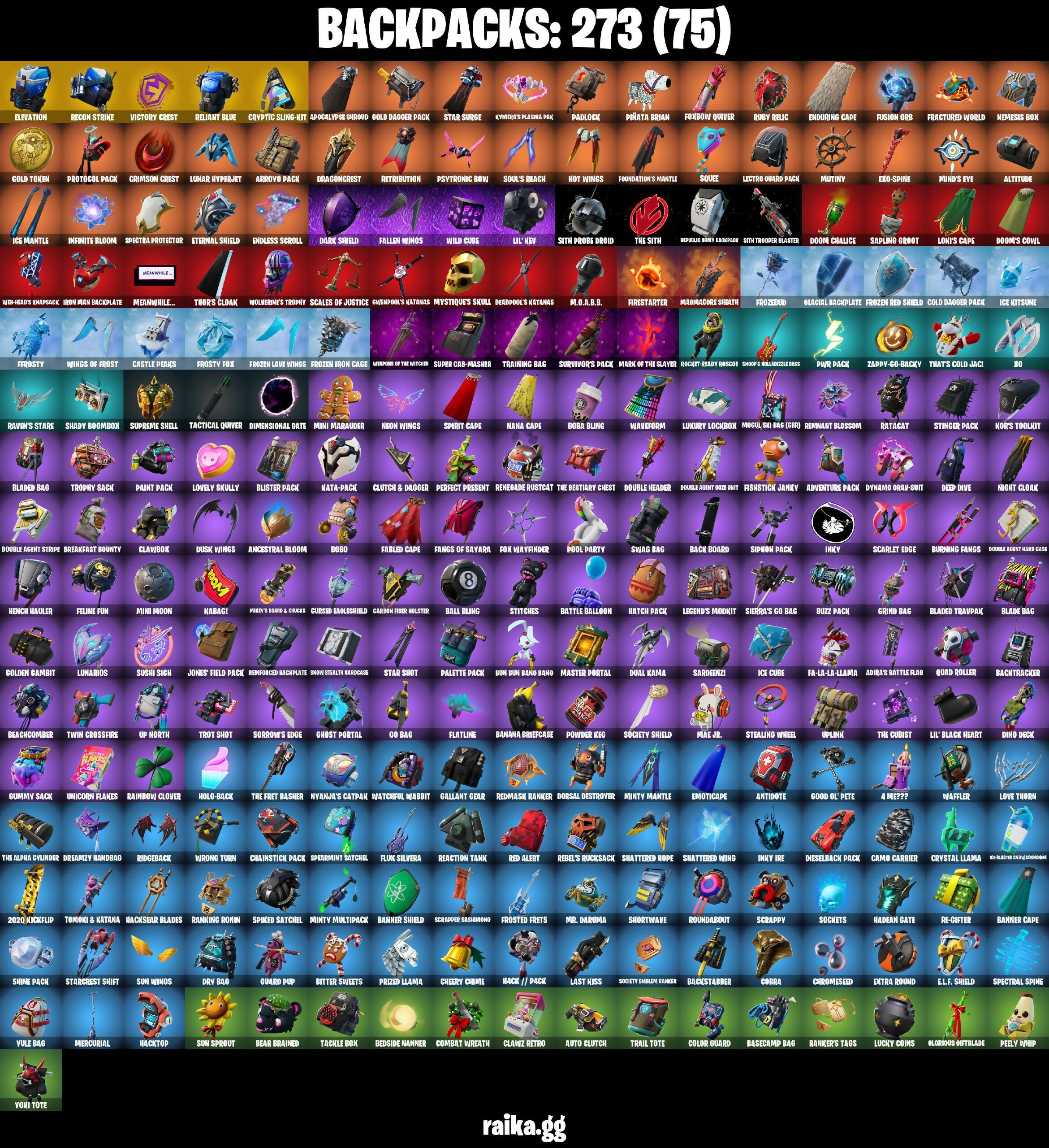 10 Field Flyer, 2.0's Revenge, 2020, 2020 Kickflip, 4 Me???, 8-Ball, 8-Ball vs Scratch, Abominable Axe, Absenz, Abyssal Blade, Acolyte's Curse, Adira's Armor, Adira's Battle Flag, Adventure Pack, Aerial Classic, Aftermath, Afterparty, Agent Jones, Agent Peely, Ahsoka's Clone Trooper, Air Shredder, Alias, Alli, Altitude, Ancestral Bloom, Angler Axes, Antidote, Antonia, Apocalypse Shroud, Aquaman, Aquaman's Trident, Arachrobatics, Arcane Energy Glider, Arcane Steel, Arctic Adeline, Arctic Camo, Arroyo Pack, Assassin's Mark, Aura, Auto Clutch, Avengers Quinjet, Axe-Tral Form, Azarath Metrion Zinthos, Back Board, Backstabber, Backtracker, Backup Blades, Balance Board, Ball Bling, Balloon Axe, Banana Bomber, Banana Briefcase, Bananaxe, Bank Shots, Banner Cape, Banner Shield, Base Jumper, Basecamp Bag, Basic Basher, Battle Balloon, Battle Bloom, Beachcomber, Bean Bag, Bear Brained, Beastfang, Bedside Manner, Beep Beep, Big Bite, Big Haul, Birthday Slice, Bitter Sweets, Blackheart, Blade Bag, Blade Raven, Blade of the Waning Moon, Bladed Bag, Bladed Travpak, Blasted, Blaze, Blister Pack, Blowing Bubbles, Blue Viper, Board Breaker, Boba Bling, Boba Snack, Bobo, Boing!, Bold Bar, Bombs Away!, Bone Patrol, Boobytrapped, Boogeyman, Boogie Down, Boomin', Boots 'N' Cats, Bootstraps, Booty Buoy, Boulder Breakers, Bounty 'Brella, Boxing Glove Arrow, Breakfast Bounty, Breakneck, Brella, Bronzed Scimitars, Brrr-Witching Blades, Bubbly, Bubloon, BullsEye, Bun Bun Bano Bano, Bunker Basher, Bunker Jonesy, Burning Dragon, Burning Fangs, Burnoff, Bushie Bright, Buttoned Up, Buzz Pack, Bytes, Cacodemon, Calamity, Calculated, Calico, Call Me, Callsign Skull, Cameo, Cameo vs Chic, Camo Carrier, Candy Axe, Candy Cane, Caper, Carbon & Gold, Carbon Fiber Holster, Carbon Scarlet, Cardistry, Castle Peaks, Cat Flip, Cat's Paw, Catalyst, Cattitude, Catwing, Catwoman's Grappling Claw, Celebratory Slice, Centurion, Centurion Edge, Cerberus, Cerberus Bite, Chain Surfer, Chainsaur, Chainstick Pack, Chaos Double Agent, Chaos Origins, Charlotte, Checks and Scratches, Cheery Chime, Chic, Chigusa, Chill Count, Chitauri Chariot, Choice Knit, Chrome Marked, Chromebrella, Chromeseed, Chromestruck Fire, Chun-Li, Cinder, Clash, Classified, Clawbox, Clawz Retro, Clean Sweep, Cliffside Soarer, Clinical Crosser, Cloud Striker, Cloudburst, Cluck, Cluck Strut, Clucking Mad, Clutch & Dagger, Coaxial Blue, Cobalt, Cobalt Overdrive, Cobra, Codename E.L.F., Coin Flip, Cold Dagger Pack, Cold Furia, Colden Touch, Color Crush, Color Guard, Combat Tech Jules, Combat Wreath, Comet Crasher, Comfy Cats, Competitor's Time Brella, Conga, Conquest, Contract Giller, Controller Crew, Convergence, Coral Cruiser, Coral Crush, Coruscant Guard, Cosmic Cleavers, Cosmic Llamacorn, Covered Crusader, Cozy Commander, Crack It, Crazy Eight, Crescent Darts, Crescent Shroom, Crimson Crest, Crimson Polestar, Crooked Claw, Crossfire, Crowbar, Crowning Achievement, Crucible Blade, Cruiser, Cryptic, Cryptic Coaster, Cryptic Sling-Kit, Crystal, Crystal Axe of the Masters, Crystal Llama, Cube Assassin, Cube Edge, Cuddle Hearts, Cuddle Mech, Cursed, Cursed Eagleshield, Cyimtar, D'ark, DJ Yonder, Dabstand, Daisies, Dance Monkey, Dante, Dark Axe, Dark Blessing, Dark Jonesy, Dark Red Knight, Dark Shield, Dark Wild Card, Deadpool, Deadpool's Katanas, Deep Dive, Deep End, Deep Future, Deimos, Demi, Demonslayer Blade, Denim Destiny, Derby Dynamo, Designated Hitters, Diamond Diva, Diamond Throne, Diamondclaw Picker, Dice Roll, Dieselback Pack, Dimensional Gate, Dino Deck, Disco, Dive Knives, Dizzie, Do The 'Split, Doctor Doom, Dogg Treat, Doom Chalice, Doom Slayer, Doom's Cowl, Doomed Echo, Dorsal Destroyer, Double Agent Hard Case, Double Agent Quoz Unit, Double Agent Rush, Double Agent Stripe, Double Agent Wildcard, Double Header, Downpour, Downshift, Doze Dab, Dragon Scales, Dragon Stance, Dragon's Claw, Dragoncrest, Dream, Dream Feet, Dreamzy Bandbag, Drift, Drift Shift, Driftwood, Driver, Droop, Drummies, Dry Bag, Dual Kama, Dual Machettas, Duelist's Foil, Dumbbell Driver, Dummy, Durrr Burger, Dusk, Dusk Wings, Dusty, Dynamic Dribbler, Dynamo Grab-Suit, E.L.F. Shield, EQ, Eclipse Brella, Eggar, Electro Pairing Blades, Elegance Blade, Elevation, Elite Servo, Ember, Ember Pick, Emote Camo, Emoticape, Enchanted Lifebloom, Endless Scroll, Enduring Cape, Energy Claw, Eon Blades, Epic Sword of Might, Epic Swords of Wonder, Equalizer, Escapees, Eternal Knight, Eternal Shield, Eternal Voyager, Evasive Maneuvers, Exile's Emblem, Exo-Spine, Extra Round, Fa-La-La-Llama, Fable, Fabled Cape, Fade, Fallen Love Ranger, Fallen Wings, Falling Snow, Fang Saws, Fanged Foresight, Fangs of Sayara, Featherweight, Feline Fun, Ferocious, Festive Paper, Field Flyer, Fiery Descent, Final Harbinger, Finesse Finisher, Fire Mint, Firestarter, Fish Thicc, Fishbone Flayer, Fishy Flier, Flaky Feast, Flapjack Flyer, Flashback Breakdown, Flatline, Flight Risk, Flip Flyer, Flippin' Away, Flippin' Sexy, Flux Silvera, Foil Flex, Fortilla Flier, Foundation's Mantle, Foundational 'Brella, Fox Wayfinder, Foxbow Quiver, Fractured World, Free Flow, Fresh Aura, Fresh Cut, Freshbreaker, Freshly Forged, Frost Broker, Frostbite Cane, Frostburn, Frosted, Frosted Frets, Frosty, Frosty Fox, Frozebud, Frozen Axe, Frozen Fishstick, Frozen Iron Cage, Frozen Love Ranger, Frozen Love Wings, Frozen Nog Ops, Frozen Raven, Frozen Red Knight, Frozen Red Shield, Fryangles, Fusion, Fusion Coil, Fusion Orb, Fusion Scythe, G-Carat Cutter, Galaxia, Gallant Gear, Gathering Storm, Gear Specialist Maya, Gentleman's Dab, Geralt of Rivia, Get Funky, Ghost Portal, Ghoul Trooper, Giddy-Up, Gila Classic, Gilded Morphic Blades, Gilded Scepter, Gingerbread Raider, Glacial Backplate, Glacial Rift Edges, Glacial Slasher, Glidurr, Glitter N' Grim, Glorious Giftblade, Glowing Vengeance, Go Bag, Gold Brutus, Gold Dagger Pack, Gold Midas, Gold Token, Golden Daggers, Golden Gambit, Golden King, Golden Look Board, Golf Clap, Good Ol' Pete, Grand Glacier