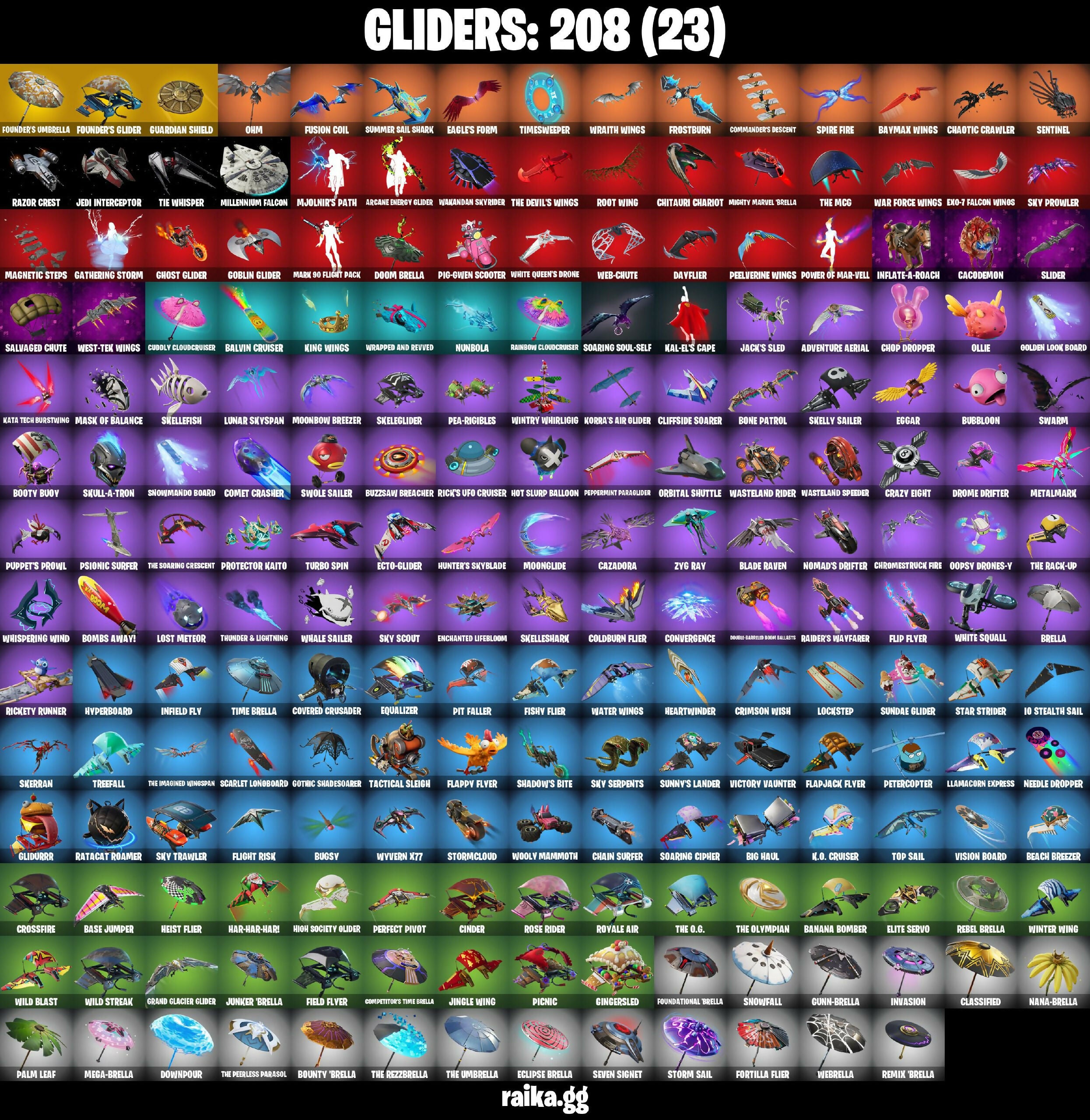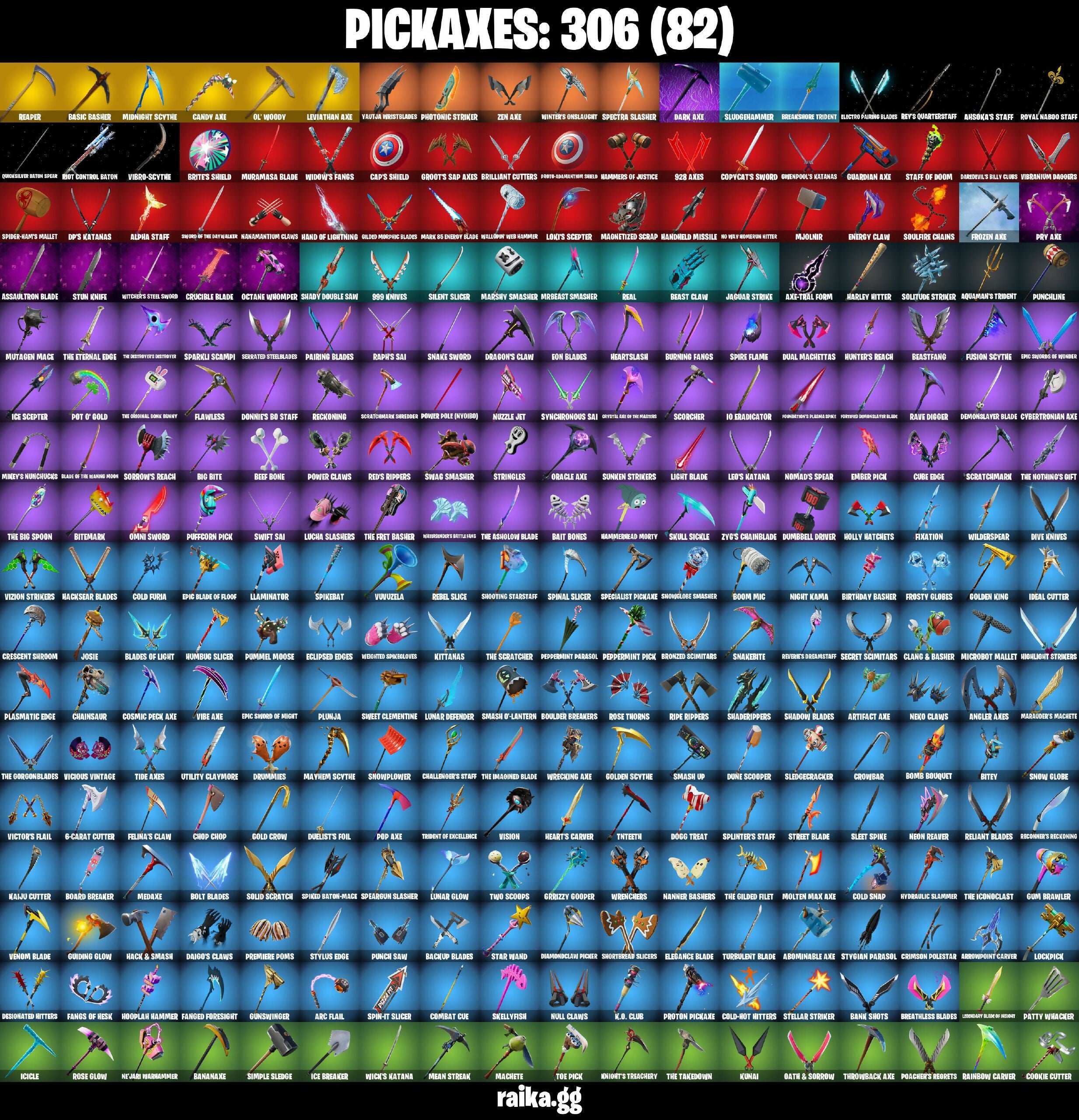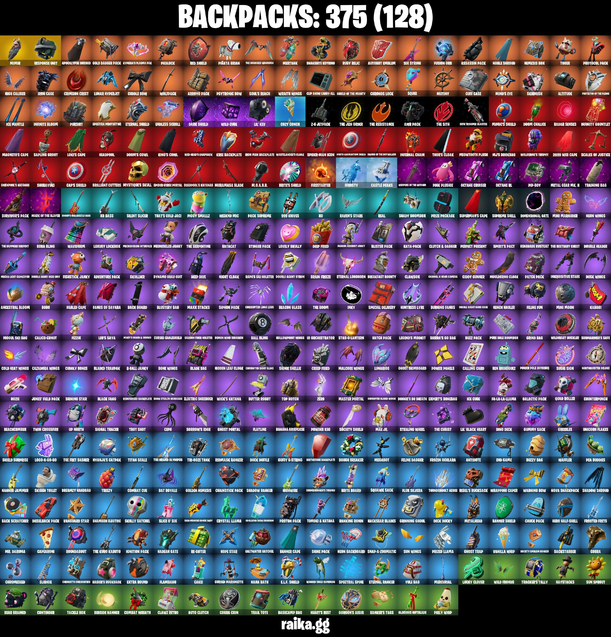 (Snikt!), 1-Ball, 10 Eradicator, 10 Stealth Sail, 2099 Web Cape, 6-Carat Cutter, 8-Ball Janxny, 8-Ball vs Scratch, 928 Axes, 999 Knives, A Warrior Prepares, AWP Pack, Abominable Axe, Adventure Aerial, Adventure Pack, Aftermath, Agent Jones, Agent Peely, Air Shredder, Alias, Alpha Staff, Altitude, Ancestral Bloom, Angler Axes, Antidote, Antonia, Aphrodite, Apocalypse Shroud, April O'Neil, Aquaman, Aquaman’s Trident, Arc Flail, Arcane Energy Glider, Arctic Adeline, Ariana Grande, Arie, Arm The Pumpkin!, Arrowpoint Carver, Arroyo Pack, Arsuka’s Staff, Artefact Axe, Artemis, Assassin Pack, Assault Trooper, Assaultron Blade, Astra, Atlantean Fishstick, Aura, Auto Clutch, Autobot Emblem, Avatar's Flourish, Axe-Tral Form, Axo, Azarath Metrion Zinthos, Back Board, Back Scratcher, Backstabber, Backup Blades, Bait Bones, Baki-Kingdom Shadow Patty, Balance Board, Ball Bling, Balvin Cruiser, Banana Axe, Banana Bomber, Banana Briefcase, Bank Shots, Banner Cape, Banner Shield, Banner Trooper, Base Jumper, Basecamp Bag, Basic Basher, Bat Royale, Battle Call, Baymax Wings, Beach Bomber, Beach Breezer, Beachcomber, Beacon Glass, Bean Bag, Bear Brained, Bear Hug, Beast Claw, Beastfang, Beatzbunny, Bedside Nanner, Beef Bone, Beef Boss, Beep Beep, Behold!, Ben Rodriguez, Benzo The Destroyer, Big Bite, Big Fan, Big Haul, Billy Bounce, Birthday Basher, Birthstone Backplate, Bitemark, Bitey, Black Fang, Black Panther, Blackheart, Blade, Blade Bag, Blade Raven, Blade of the Waning Moon, Bladed Trapapak, Blades of Light, Blaze, Blister Pack, Blowin' Up, Blustery Bag, Board Breaker, Boba Bling, Boba Fett, Boba Snack, Bobo, Boing!, Bolt Blades, Bomb Bouquet, Bombs Away!, Bone Patrol, Bone Ravage, Bonejamin, Boneless, Boogie Down, Boom Mic, Boomin', Boots 'N' Cats, Booty Buoy, Bough Breaker, Boulder Breakers, Bounce Berry, Bounty 'Brella, Brain Freeze, Brainiac, Breakfast Bounty, Breakpoint Trident, Breathless Blades, Brella, Brilliant Cutters, Brite Board, Brite Bomber, Brite Moves, Brite Raider, Brite's Shield, Britesrar, Brite’s Shield, Bronzed Scimitars, Brutus, Bubbloon, Budge, Bugsy, Bulletproof, Bunker Jonesy, Burning Fangs, Burnoff, Bushranger, Butter Robot, Buzz Pack, Buzzsaw Breacher, Buzzy Bag, Bytes, Cacodemon, Cake!, Calamity, Calico-Donut, Call Me, Called Shot, Calling Card, Camo vs Chic, Candy Axe, Cap's Shield, Capearoni, Caper, Captain America, Captain Marvel, Cap’s Shield, Card Drop, Cardistry, Castle Peaks, Cat Flip, Cazadora, Cazadora Wings, Ceph, Cerberus, Chain Surfer, Chainsaur, Chainstick Pack, Challinour’s Staff, Champion Kuno, Champion Kyra, Champion Siren, Channel 6 News Camera, Chaos Director, Chaos Double Agent, Chaos Origins, Chaotic Crawler, Charlotte, Chef's Special, Chemist's Curiosities, Chewbacca, Chitauri Chariot, Choice Knit, Chop Chop, Chop Dropper, Chrome Punk, Chromeseed, Chromestruck Fire, Chronos Lock, Chuck Pack, Cinder, Clang & Basher, Clark Kent, Classified, Clawbox, Clawz Retro, Clean Sweep, Cliffside Soarer, Clip Show Carry-All, Cluck, Cluck Strut, Clutch & Dagger, Cobalt, Cobra, Cobra Coin, Codename E.L.F., Codsworth's Cleanup, Coin-Flip, Cold Furia, Cold Heat Wings, Cold Snap, Cold-Hot Hitters, Coldburn Flier, Color Crush, Combat Cue, Combat Tech Jules, Combat Wreath, Comet Crasher, Commander's Descent, Competitors' Time Brella, Conch Call, Conga, Contender, Controller Crew, Convergence, Cookie Cutter, Copycat’s Sword, Core Assassin, Corrupted Arachnid, Corrupted Inound, Corrupted Island Wings, Corrupted Long Legs, Corrupted Shogun, Corrupted Sight Sling, Cosmic Peak Axe, Count It!, Counterpunch, Covered Crusader, Cozy Conch, Crack It, Crackdown, Crayon Fudur Holster, Crazy Eight, Creep Fried, Crescent Shroom, Crimson Crest, Crimson Polestar, Crimson Wish, Crossfire, Crowbar, Crowning Achievement, Crucible Blade, Crusher, Cryptic, Crystal, Crystal Axe of the Masters, Crystal Llama, Cube Edge, Cuddle Bow, Cuddle Team Leader, Cuddly Bones, Cuddly Cloudcruiser, Cuff Case, Curling Iron, Cursed Balooshield, Cursed Marionette, Cyberdyne Salute, Cybertronian Axe, Cyclo Curl, DP’s Katanas, Dab, Dagobah Luke, Daigo, Daigo’s Claws, Dance Off, Daredevil, Daredevil’s Billy Clubs, Dark Axe, Dark Jonesy, Dark Red Knight, Dark Shield, Dark Wild Card, Darkreaper's Trophy, Dayflier, Daywalker's Kata, Deadpool, Deadpool (Pen & Ink), Deadpool's Katanas, Deck Ducky, Deep Dive, Deep Fried, Deimos, Demogorgon, Demon Hand Shuriken, Demonslayer Blade, Denied, Derby Dynamo, Designated Hitters, Diamond Diva, Diamond Throne, Diamondclaw Picker, Dice Roll, Dieselback Pack, Dimensional Gate, Dino Deck, Dire, Distracted, Dive Knives, Dizzle, Do The Split, Doctor Doom, Doctor Slone, Dogg Treat, Dolph, Donatello, Donnie's Bo Sheath, Donnie’s Bo Staff, Doom Brella, Doom Chalice, Doom Slayer, Doom's Cowl, Double Agent Hard Case, Double Agent Hush, Double Agent Ooze Unit, Double Agent Stripe, Double Agent Wildcard, Double Header, Double-Barrelled Doom Ballasts, Downpour, Doze Dab, Dragon Stance, Dragon’s Claw, Dramatic Flares, Dreamzy Handbag, Drome Drifter, Droop, Drummies, Dual Machettas, Duck Duffle, Duelist’s Foil, Dumbbell Driver, Dune Scooper, Dusk, Dusk Wings, Dusty, Dynamo, Dynamo Grab-Suit, Dynamo TNTina, E.L.F. Shield, EXO-7 Falcon Wings, Eagle's Form, Eclipse Brella, Eclipsed Edges, Ecto-Glider, Eggar, Electric Shredder, Electro Pairing Blades, Electro Swing, Elegance Blade, Elite Servo, Ember, Ember Pick, Emma Frost, Enchanted Lifebloom, End Game, Endless Scroll, Endure Dripping Rodriguez, Energy Claw, Entranced, Envision, Eon Blades, Epic Blade of Floof, Epic Sword of Might, Epic Swords of Wonder, Equalizer, Era, Errant, Eternal Knight, Eternal Longhorn, Eternal Ranker, Eternal Shield, Evasive Maneuvers, Evie, Expert's Bonebag, Explorer Emilie, Expressionism, Extra Round, Fa-La-La-Llama, Fable, Fabled Cape, Fade, Fang Dance, Fanged Foresight, Fangs of Hesk, Fangs of Sayara, Fashion Accident Janxny, Felina, Felina’s Claw, Feline Dagger, Feline Fun, Field Flyer, Fi
