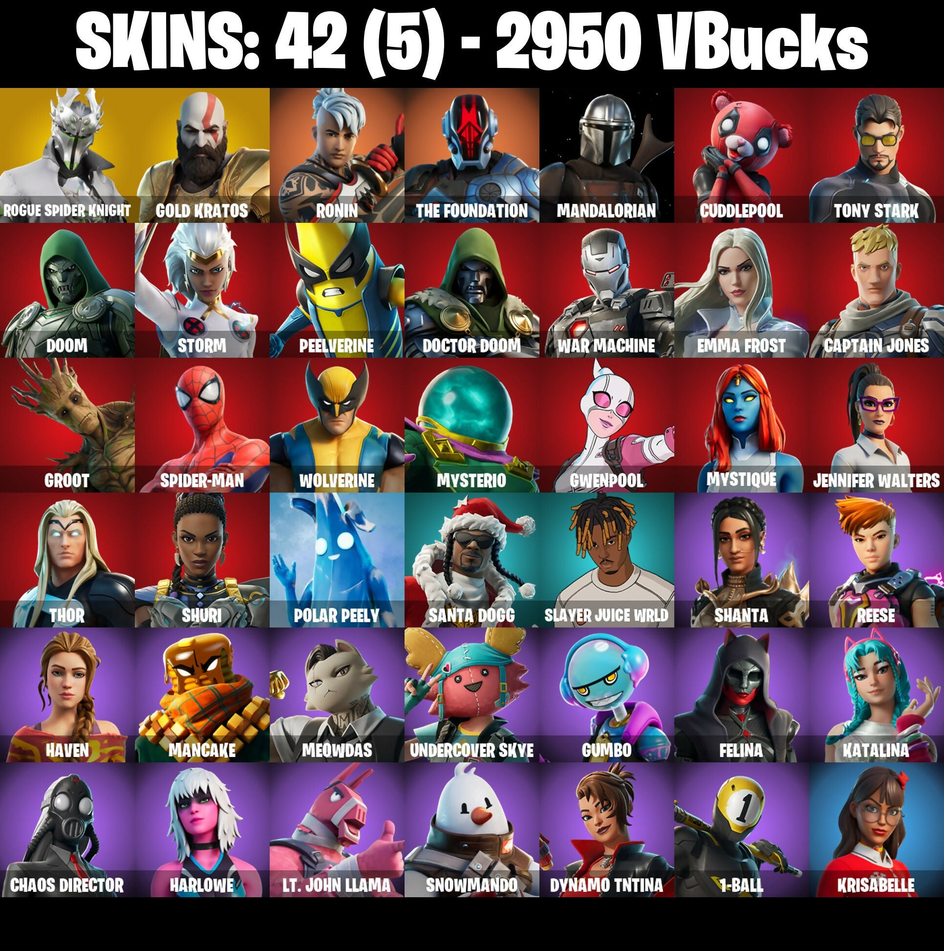 🎆42 SKINS ⚡️PC⚡️ ROGUE SPIDER KNIGHT 👑 GOLD KRATOS 👑 RONIN 👑 THE FOUNDATION 👑 MANDALORIAN 👑 CUDDLEPOOL 👑 TONY STARK 👑 DOOM 👑 STORM ⚡️ 2950 VB 📧 MAIL CHANGEABLE SOON #M423