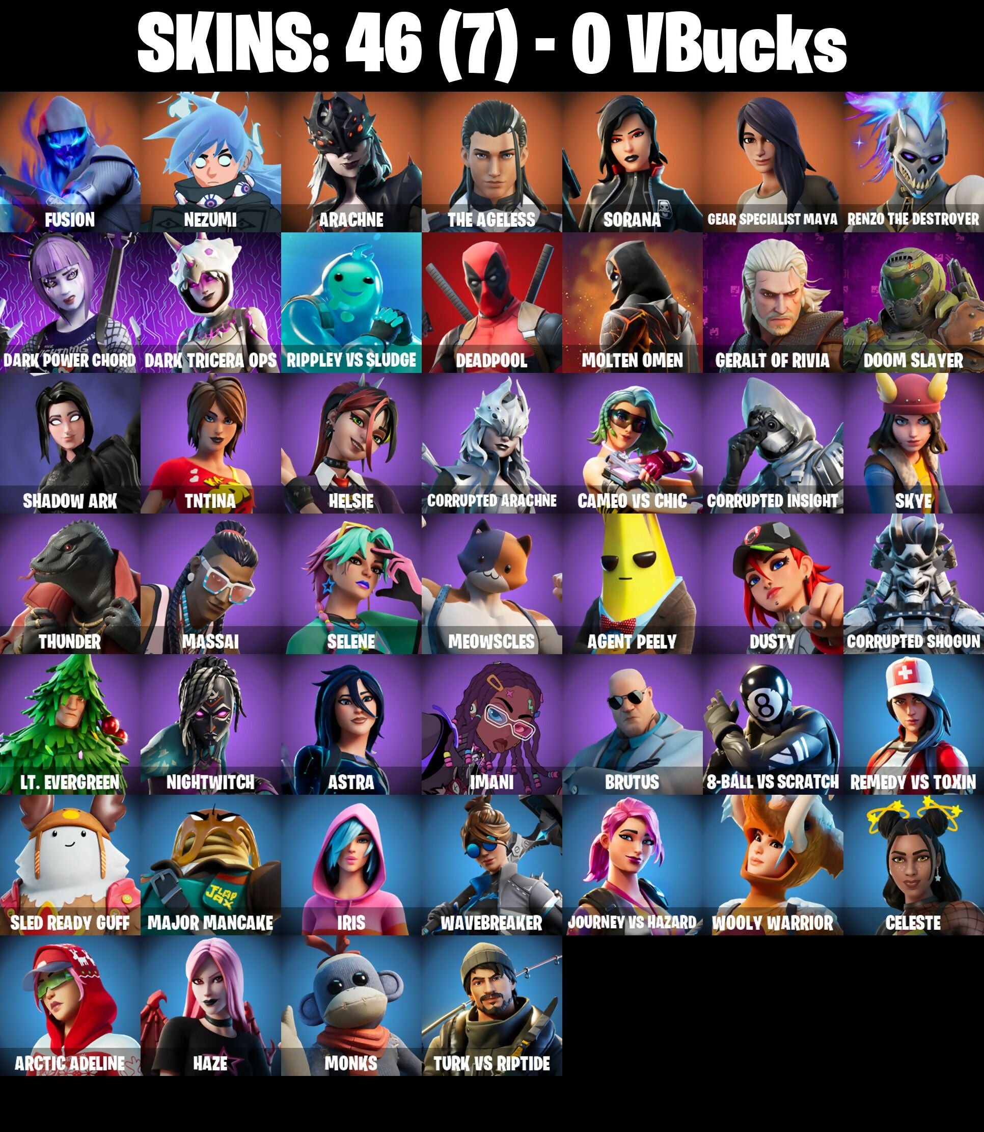 🎆46 SKINS ⚡️PC⚡️ FUSION 👑 NEZUMI 👑 ARACHNE 👑 THE AGELESS 👑 SORANA 👑 GEAR SPECIALIST MAYA 👑 RENZO THE DESTROYER 👑 DARK POWER CHORD ⚡️ 0 VB 📧 MAIL CHANGEABLE #M222