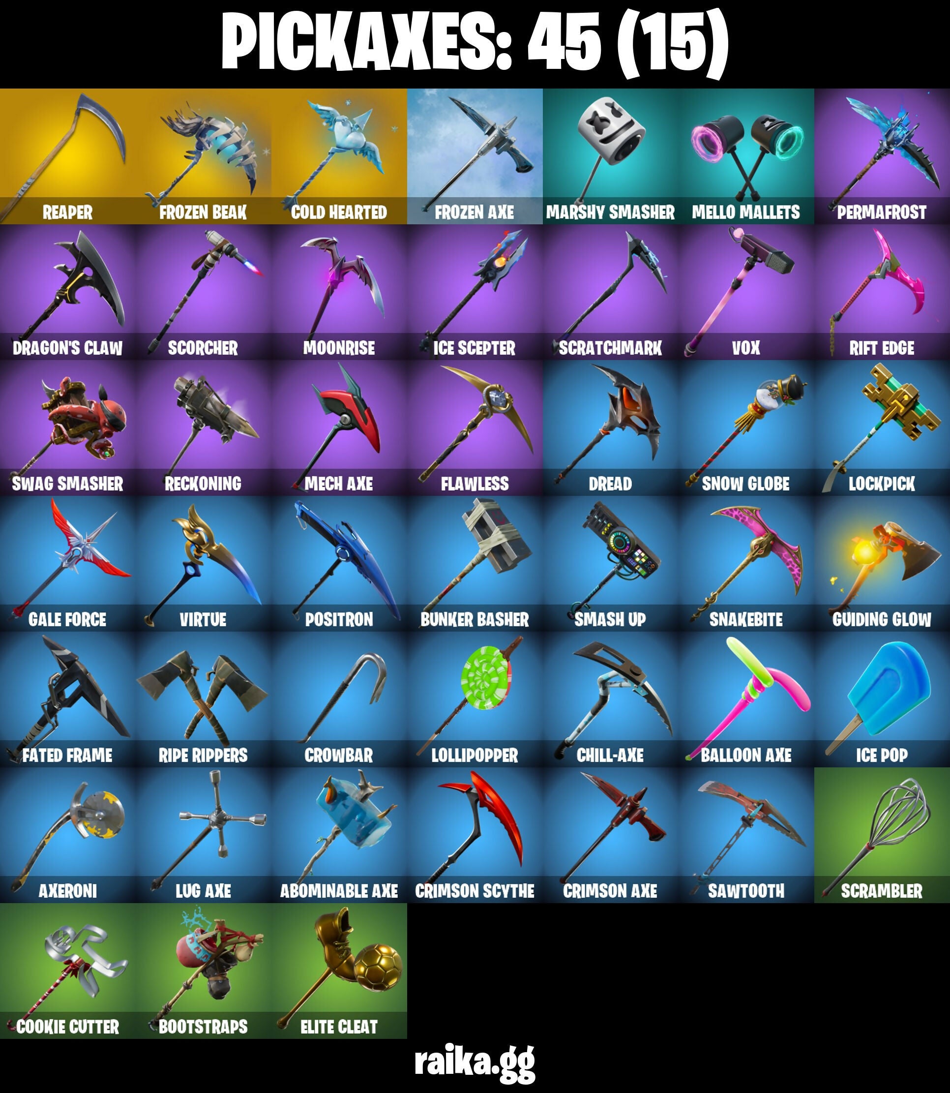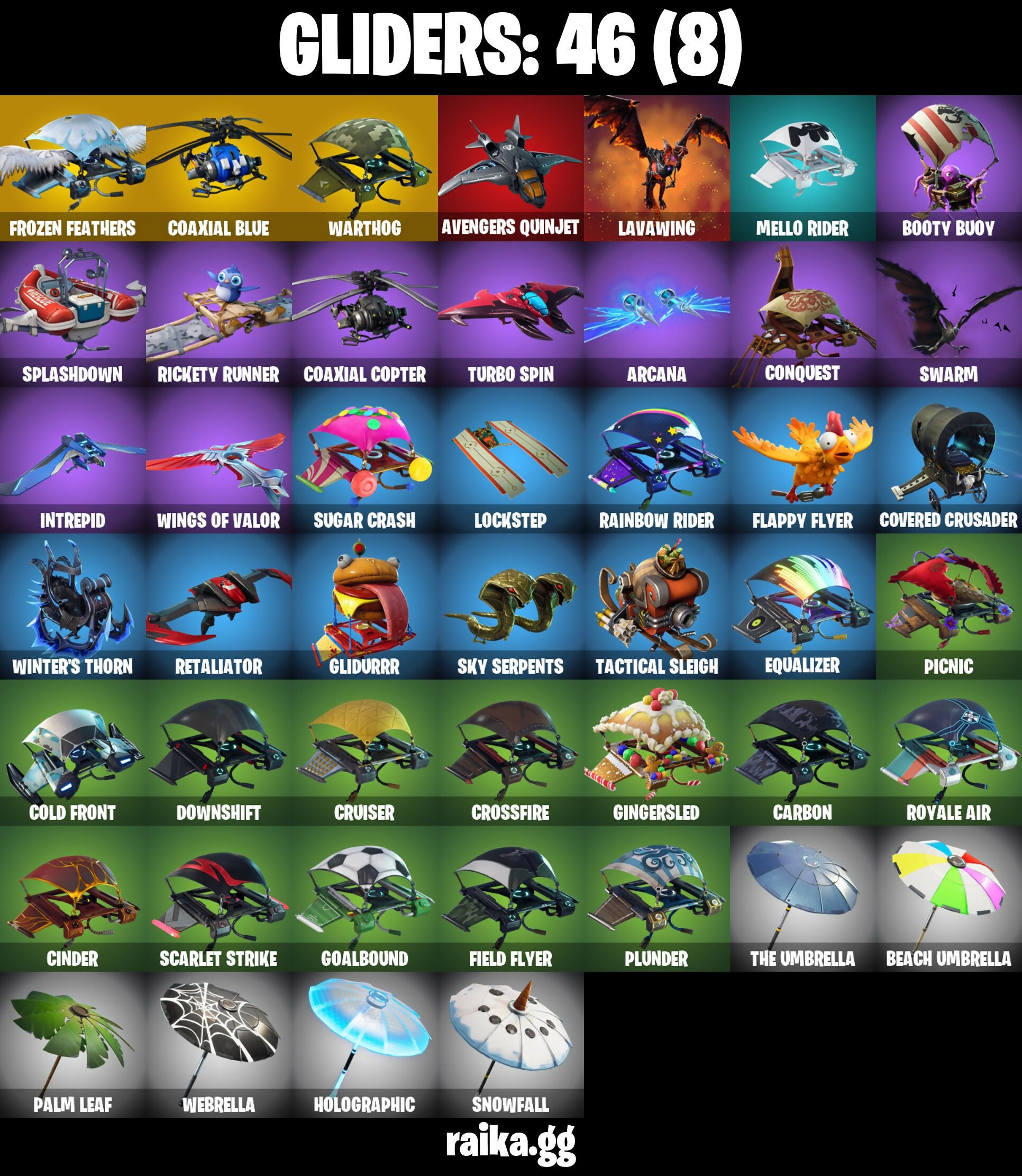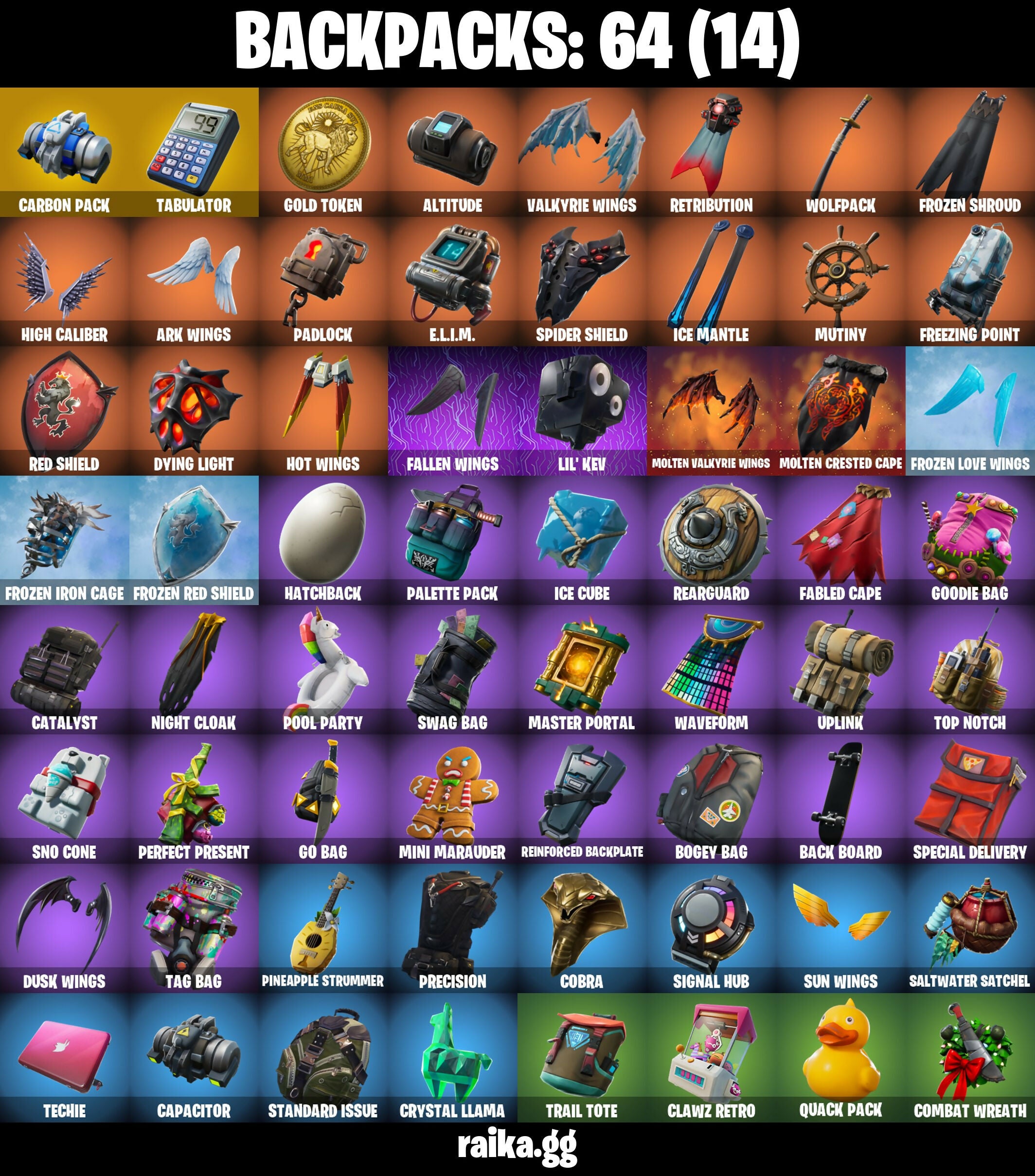 A.I.M., Abominable Axe, Abstrakt, Aerial Threat, Altitude, Arcana, Arctic Camo, Ark, Ark Wings, Avengers Quinjet, Axeroni, Back Board, Bacon, Balloon Axe, Banner Icon, Bat, Battle Bus Balloon, Battle Call, Battlehawk, Beach Chair, Beach Umbrella, Bee, Behold!, Black Werewolf, Blackheart, Blitz, Blue Metallic, Bogey Bag, Bone, Boogeyman, Boogie Down, Bootstraps, Booty Buoy, Bow, Branded Brigadier, Breakdown, Brood, Bunker Basher, Bunker Jonesy, Burnmark, Calamity, Calculated, Camera, Campfire, Capacitor, Captain America's Shield, Carbide, Carbon, Carbon & Gold, Carbon Commando, Carbon Fiber, Carbon Pack, Cat Flip, Catalyst, Chains, Chick, Chill-Axe, Chromatic, Cinder, Clawz Retro, Click!, Cluck Strut, Clutch, Coaxial Blue, Coaxial Copter, Cobalt, Cobra, Coconuts, Coddle Hearts, Cold Front, Cold Hearted, Combat Wreath, Compass, Conga, Conquest, Cookie Cutter, Covered Crusader, Crab, Crimson Axe, Crimson Scythe, Crossfire, Crowbar, Crown, Cruiser, Crystal Llama, Cursed, DJ Yonder, Dark, Demi, Dice, Dinosaur, Dire, Disco, Dog Bowl, Dog Collar, Dolphin, Downshift, Dragon Scales, Dragon Stance, Dragon's Claw, Dread, Drift, Driftwood, Duck, Durr Burger, Durrr Burger, Dusk, Dusk Wings, Dying Light, E.L.I.M., Eagle, Egg, Elite Cleat, Ember, Enigma, Equalizer, Expedition, Explosion, Fable, Fabled Cape, Face Palm, Falcon, Fallen Love Ranger, Fallen Wings, Fated Frame, Fence, Festive Paper, Field Flyer, Fierce, Finesse Finisher, Fireworks, Fish Face, Flamenco, Flappy Flyer, Flawless, Flippin' Sexy, Floating Island, Flowerprint, Flowy Hat, Fly, Fox, Fox Clan Mask, Free Flow, Freezing Point, Frostbite, Frosted, Frozen Axe, Frozen Beak, Frozen Feathers, Frozen Iron Cage, Frozen Love Ranger, Frozen Love Wings, Frozen Raven, Frozen Red Knight, Frozen Red Shield, Frozen Shroud, Fryangles, Gale Force, Garrison, Gemstone, Gentleman's Dab, Get Funky, Giddy-Up, Gingersled, Glidurrr, Go Bag, Goalbound, Gold, Gold Token, Golf Ball, Golf Clap, Goodie Bag, Gravestone, Grind, Groove Jam, Guiding Glow, Ham, Hand Horns, Hatchback, Heat, Hello Friend, Hero Emblem, High Caliber, Holographic, Hoop Master, Hot Marat, Hot Wings, Howl, Huntress, Hybrid, Hype, Ice Cream Truck, Ice Cube, Ice Kingdom Emblem, Ice Mantle, Ice Pop, Ice Scepter, Indigo Ice, Infernal, Inferno, Infinity Blade, Intrepid, It's Go Time!, Jellyfish, Jolly Roger, Jubilation, Jump Jets, Keep It Mello, Laguna, Laid Back Shuffle, Lavawing, Lil Whip, Lil' Kev, Lockpick, Lockstep, Lollipopper, Lug Axe, Luxe, Lynx, Marshmello, Marshy Smasher, Mask, Master Key, Master Portal, Maven, Mech Axe, Mello Mallets, Mello Rider, Merry Marauder, Mic Drop, Midfield Maestro, Mini Marauder, Mission Specialist, Molten Battle Hound, Molten Crested Cape, Molten Valkyrie, Molten Valkyrie Wings, Moonrise, Mutiny, Nana Nana, Night, Night Cloak, Nightshade, Octopus, Onesie, Only 90's Kids, Orange Justice, Padlock, Paint Brush, Palette Pack, Palm Leaf, Palm Trees, Paper Plane, Paw, Peace Out, Peely, Pencil, Perfect Present, Permafrost, Phantom, Pickaxe, Picnic, Pineapple, Pineapple Strummer, Pink Splatter, Plunder, Point It Out, Polka Dots, Pool Party, Popcorn, Positron, Powder, Power Surge, Precision, Prodigy, Quack Pack, Racing Checkers, Ragnarok, Rainbow Rider, Reaper, Rearguard, Reckoning, Red Card, Red Knight, Red Shield, Red-Nosed Raider, Red-Nosed Ranger, Redline, Regal Wave, Reinforced Backplate, Respect, Retaliator, Retribution, Rickety Runner, Rift Edge, Ripe, Ripe Rippers, Roach, Rock Paper Scissors, Rogue Agent, Rook, Rox, Royale Air, Ruin, Running Man, Rust Lord, Sad Trombone, Saltwater Satchel, Salute, Sawtooth, Scarlet Strike, Scorcher, Scorpion, Scrambler, Scratchmark, Scuba Gear, Sea Serpent, Sentinel, Sgt. Winter, Shackle, Shaolin Sit-Up, Shimmer, Shopping Cart, Sidewinder, Sign Spinner, Signal Hub, Skull Trooper, Sky Serpents, Sledgehammer, Slitherin', Slow Clap, Smash Up, Snakebite, Sno Cone, Snoozefest, Snow Clan Shuriken, Snow Globe, Snowfall, Spade, Special Delivery, Spider Badass, Spider Knight, Spider Shield, Splashdown, Spray Can, Sprinkler, Sprinkles, Squad Leader, Stage, Stage 4, Stage 4 - No Ponytail, Stage 5, Stage 5 - No Shoulder Pad, Stage 8, Standard Issue, Storm, Stratus, Sugar Crash, Summit Striker, Sun, Sun Strider, Sun Wings, Sunbird, Sunprint, Swag Bag, Swag Smasher, Swarm, Swipe It, T-Rex Head, Tabulator, Tactical Sleigh, Tag Bag, Take The Elf, Take The L, Target, Tartan, Team Monster, Tech Ops, Techie, Teeth, Tender Defender, Texnique, The Ace, The Crack, The Ice King, The Prisoner, The Umbrella, Tic-Tac-Toe, Tiger Stripes, Timer, Tomatohead, Too Tilted, Top Hat, Top Notch, Traffic Cone, Trail Tote, Trash Can, Treasure Chest, Tribal, Trog, Tropical Camo, True Love, Turbo Spin, Ultra Red, Uplink, Valentine, Valkyrie, Valkyrie Wings, Valor, Vega, Vendetta, Verge, Viking Ship, Villain Emblem, Violin, Virtue, Vox, Warthog, Waterworks, Waveform, Wavy (Blitz), Waypoint, Webrella, Whale Tail, Whiplash, White, Wiggle, Wilde, Wingman, Wings Of Valor, Winter, Winter's Thorn, Wolfpack, World Cup, World Cup 2019 Banner, Worm, Wreath, X, X-4 Stormwing, Yay!, You're Awesome, Yuletide Ranger, Zany, Zenith, Zig-Zag, Ziggurat, Zoey