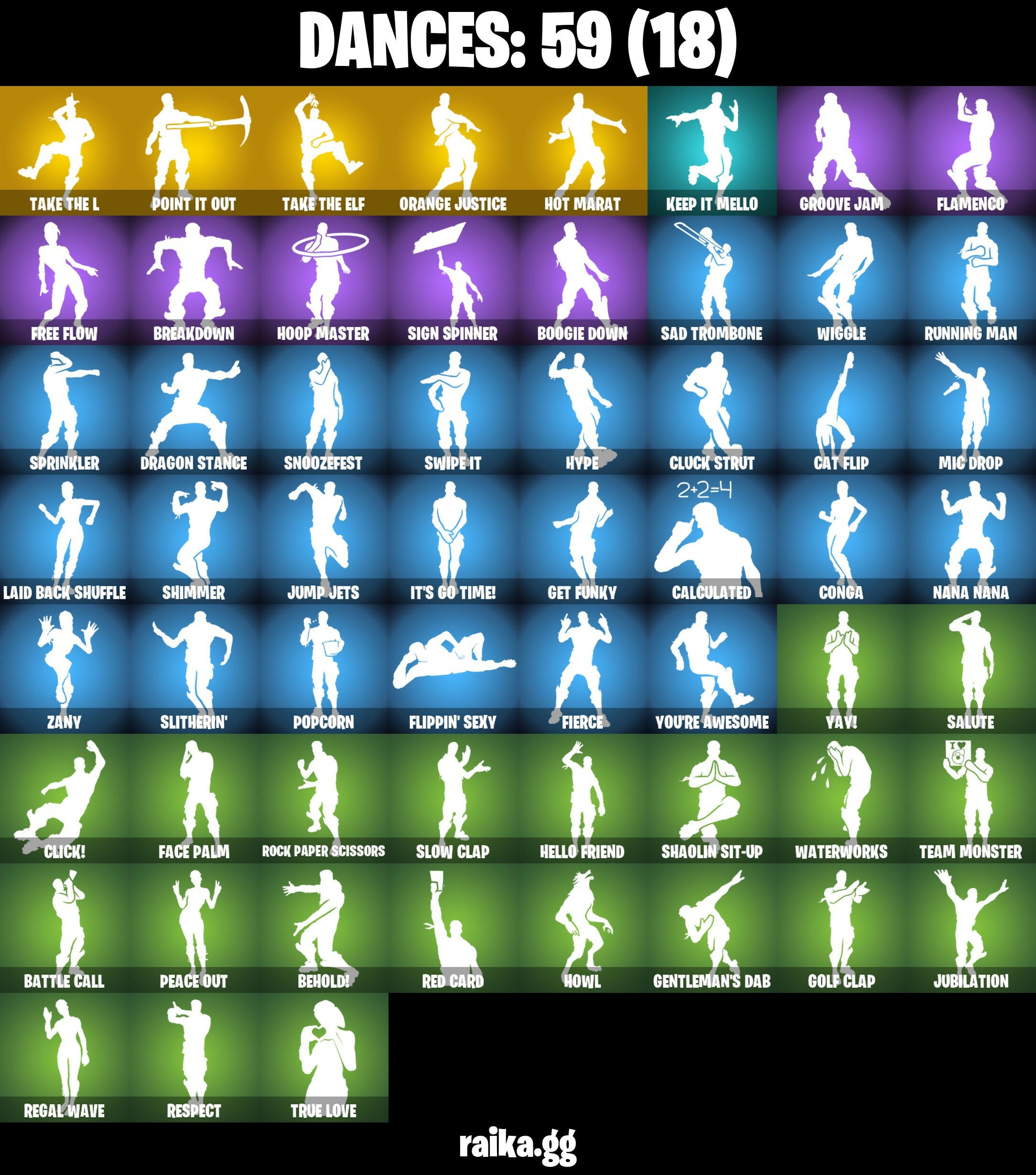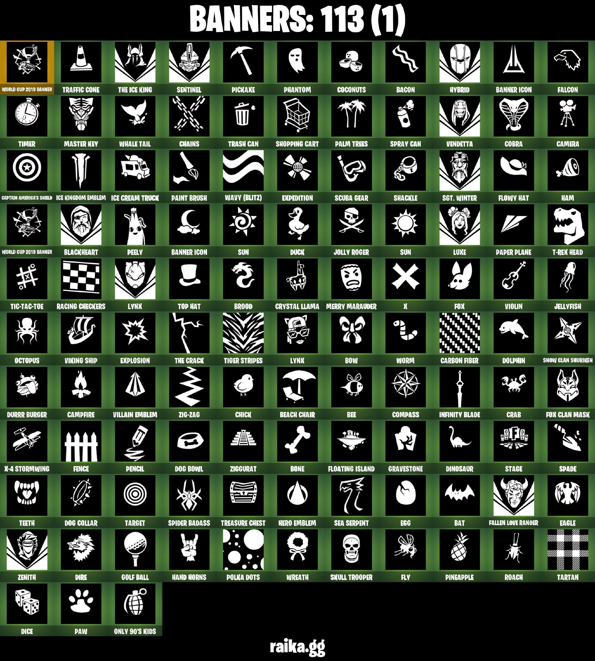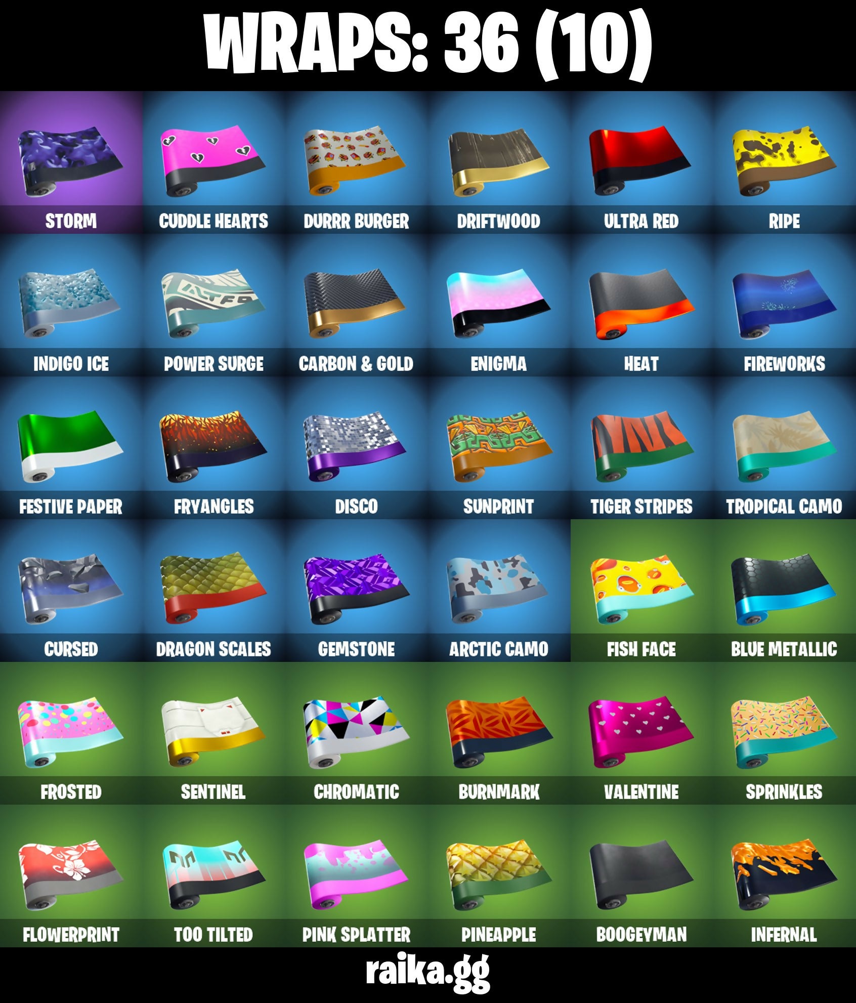 A.I.M., Abominable Axe, Abstrakt, Aerial Threat, Altitude, Arcana, Arctic Camo, Ark, Ark Wings, Avengers Quinjet, Axeroni, Back Board, Bacon, Balloon Axe, Banner Icon, Bat, Battle Bus Balloon, Battle Call, Battlehawk, Beach Chair, Beach Umbrella, Bee, Behold!, Black Werewolf, Blackheart, Blitz, Blue Metallic, Bogey Bag, Bone, Boogeyman, Boogie Down, Bootstraps, Booty Buoy, Bow, Branded Brigadier, Breakdown, Brood, Bunker Basher, Bunker Jonesy, Burnmark, Calamity, Calculated, Camera, Campfire, Capacitor, Captain America's Shield, Carbide, Carbon, Carbon & Gold, Carbon Commando, Carbon Fiber, Carbon Pack, Cat Flip, Catalyst, Chains, Chick, Chill-Axe, Chromatic, Cinder, Clawz Retro, Click!, Cluck Strut, Clutch, Coaxial Blue, Coaxial Copter, Cobalt, Cobra, Coconuts, Coddle Hearts, Cold Front, Cold Hearted, Combat Wreath, Compass, Conga, Conquest, Cookie Cutter, Covered Crusader, Crab, Crimson Axe, Crimson Scythe, Crossfire, Crowbar, Crown, Cruiser, Crystal Llama, Cursed, DJ Yonder, Dark, Demi, Dice, Dinosaur, Dire, Disco, Dog Bowl, Dog Collar, Dolphin, Downshift, Dragon Scales, Dragon Stance, Dragon's Claw, Dread, Drift, Driftwood, Duck, Durr Burger, Durrr Burger, Dusk, Dusk Wings, Dying Light, E.L.I.M., Eagle, Egg, Elite Cleat, Ember, Enigma, Equalizer, Expedition, Explosion, Fable, Fabled Cape, Face Palm, Falcon, Fallen Love Ranger, Fallen Wings, Fated Frame, Fence, Festive Paper, Field Flyer, Fierce, Finesse Finisher, Fireworks, Fish Face, Flamenco, Flappy Flyer, Flawless, Flippin' Sexy, Floating Island, Flowerprint, Flowy Hat, Fly, Fox, Fox Clan Mask, Free Flow, Freezing Point, Frostbite, Frosted, Frozen Axe, Frozen Beak, Frozen Feathers, Frozen Iron Cage, Frozen Love Ranger, Frozen Love Wings, Frozen Raven, Frozen Red Knight, Frozen Red Shield, Frozen Shroud, Fryangles, Gale Force, Garrison, Gemstone, Gentleman's Dab, Get Funky, Giddy-Up, Gingersled, Glidurrr, Go Bag, Goalbound, Gold, Gold Token, Golf Ball, Golf Clap, Goodie Bag, Gravestone, Grind, Groove Jam, Guiding Glow, Ham, Hand Horns, Hatchback, Heat, Hello Friend, Hero Emblem, High Caliber, Holographic, Hoop Master, Hot Marat, Hot Wings, Howl, Huntress, Hybrid, Hype, Ice Cream Truck, Ice Cube, Ice Kingdom Emblem, Ice Mantle, Ice Pop, Ice Scepter, Indigo Ice, Infernal, Inferno, Infinity Blade, Intrepid, It's Go Time!, Jellyfish, Jolly Roger, Jubilation, Jump Jets, Keep It Mello, Laguna, Laid Back Shuffle, Lavawing, Lil Whip, Lil' Kev, Lockpick, Lockstep, Lollipopper, Lug Axe, Luxe, Lynx, Marshmello, Marshy Smasher, Mask, Master Key, Master Portal, Maven, Mech Axe, Mello Mallets, Mello Rider, Merry Marauder, Mic Drop, Midfield Maestro, Mini Marauder, Mission Specialist, Molten Battle Hound, Molten Crested Cape, Molten Valkyrie, Molten Valkyrie Wings, Moonrise, Mutiny, Nana Nana, Night, Night Cloak, Nightshade, Octopus, Onesie, Only 90's Kids, Orange Justice, Padlock, Paint Brush, Palette Pack, Palm Leaf, Palm Trees, Paper Plane, Paw, Peace Out, Peely, Pencil, Perfect Present, Permafrost, Phantom, Pickaxe, Picnic, Pineapple, Pineapple Strummer, Pink Splatter, Plunder, Point It Out, Polka Dots, Pool Party, Popcorn, Positron, Powder, Power Surge, Precision, Prodigy, Quack Pack, Racing Checkers, Ragnarok, Rainbow Rider, Reaper, Rearguard, Reckoning, Red Card, Red Knight, Red Shield, Red-Nosed Raider, Red-Nosed Ranger, Redline, Regal Wave, Reinforced Backplate, Respect, Retaliator, Retribution, Rickety Runner, Rift Edge, Ripe, Ripe Rippers, Roach, Rock Paper Scissors, Rogue Agent, Rook, Rox, Royale Air, Ruin, Running Man, Rust Lord, Sad Trombone, Saltwater Satchel, Salute, Sawtooth, Scarlet Strike, Scorcher, Scorpion, Scrambler, Scratchmark, Scuba Gear, Sea Serpent, Sentinel, Sgt. Winter, Shackle, Shaolin Sit-Up, Shimmer, Shopping Cart, Sidewinder, Sign Spinner, Signal Hub, Skull Trooper, Sky Serpents, Sledgehammer, Slitherin', Slow Clap, Smash Up, Snakebite, Sno Cone, Snoozefest, Snow Clan Shuriken, Snow Globe, Snowfall, Spade, Special Delivery, Spider Badass, Spider Knight, Spider Shield, Splashdown, Spray Can, Sprinkler, Sprinkles, Squad Leader, Stage, Stage 4, Stage 4 - No Ponytail, Stage 5, Stage 5 - No Shoulder Pad, Stage 8, Standard Issue, Storm, Stratus, Sugar Crash, Summit Striker, Sun, Sun Strider, Sun Wings, Sunbird, Sunprint, Swag Bag, Swag Smasher, Swarm, Swipe It, T-Rex Head, Tabulator, Tactical Sleigh, Tag Bag, Take The Elf, Take The L, Target, Tartan, Team Monster, Tech Ops, Techie, Teeth, Tender Defender, Texnique, The Ace, The Crack, The Ice King, The Prisoner, The Umbrella, Tic-Tac-Toe, Tiger Stripes, Timer, Tomatohead, Too Tilted, Top Hat, Top Notch, Traffic Cone, Trail Tote, Trash Can, Treasure Chest, Tribal, Trog, Tropical Camo, True Love, Turbo Spin, Ultra Red, Uplink, Valentine, Valkyrie, Valkyrie Wings, Valor, Vega, Vendetta, Verge, Viking Ship, Villain Emblem, Violin, Virtue, Vox, Warthog, Waterworks, Waveform, Wavy (Blitz), Waypoint, Webrella, Whale Tail, Whiplash, White, Wiggle, Wilde, Wingman, Wings Of Valor, Winter, Winter's Thorn, Wolfpack, World Cup, World Cup 2019 Banner, Worm, Wreath, X, X-4 Stormwing, Yay!, You're Awesome, Yuletide Ranger, Zany, Zenith, Zig-Zag, Ziggurat, Zoey