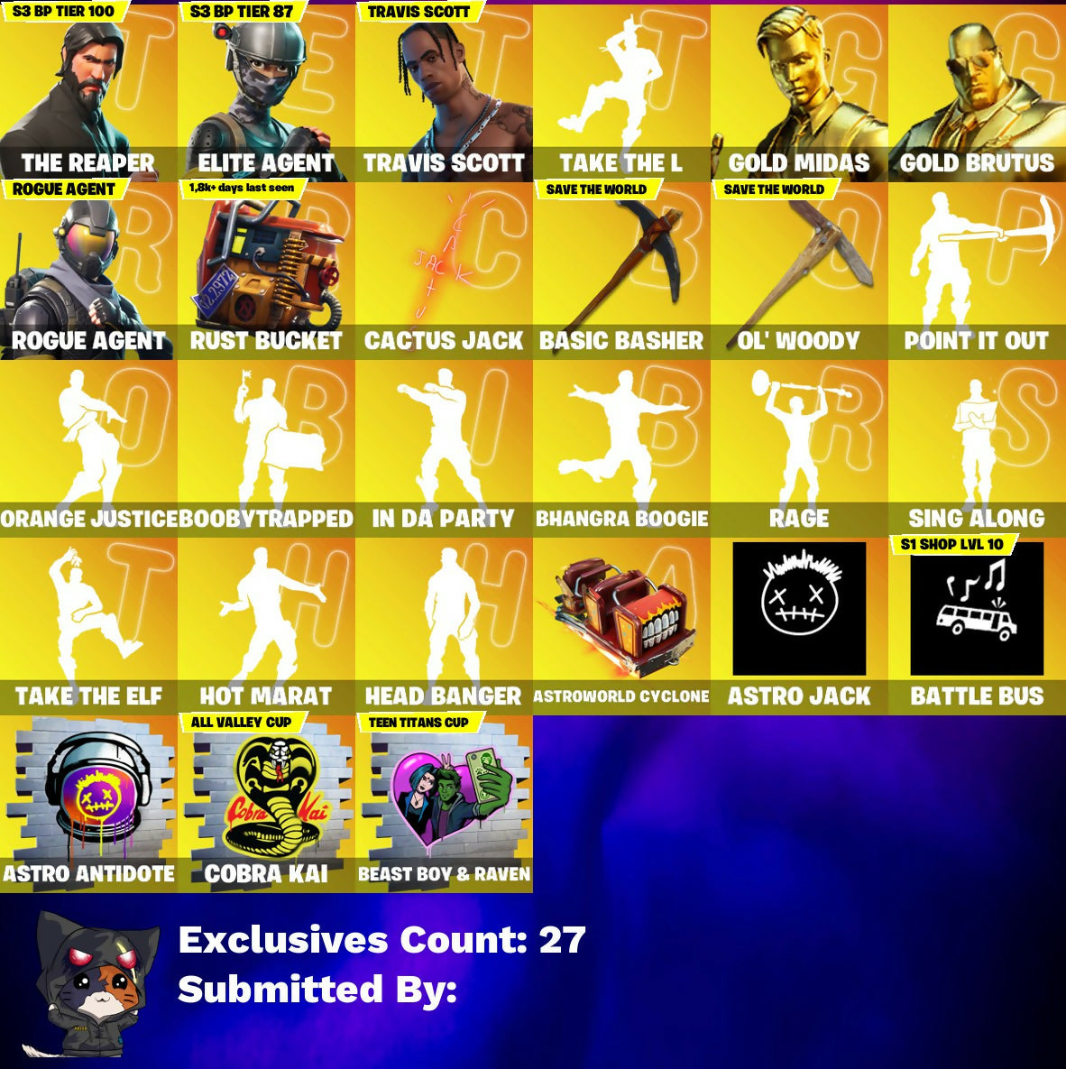 💥🌟 EXCLUSIVE OFFER 🌟💥 170 SKINS 💎 TRAVIS SCOTT 💎 THE REAPER 💎 ELITE AGENT 💎 GOLD MIDAS 💎 GOLD BRUTUS 💎 ROGUE AGENT 💎 THE ICE KING 💎 ZENITH 💎 LUXE 💎 TAKE THE L💎 DRIFT💎 FULL ACCESS 💎