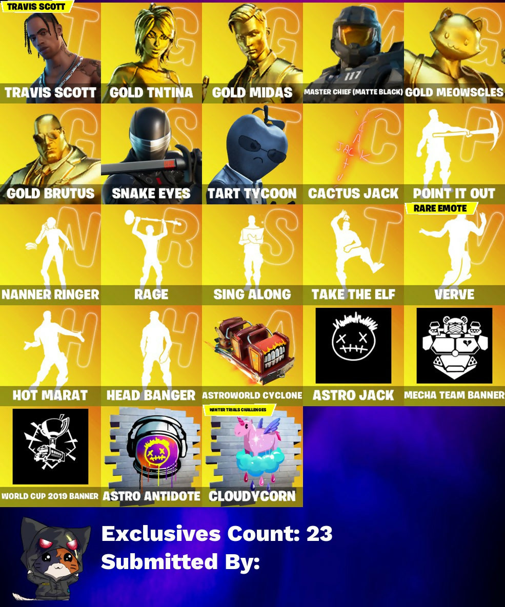 💥🌟 EXCLUSIVE OFFER 🌟💥 171 SKINS 💎 TRAVIS SCOTT 💎 ROX 💎 GOLD MIDAS 💎 MASTER CHIEF (MATTE BLACK) 💎 FADE 💎 GOLD BRUTUS 💎 SNAKE EYES 💎 TART TYCOON 💎 FULL ACCESS 💎