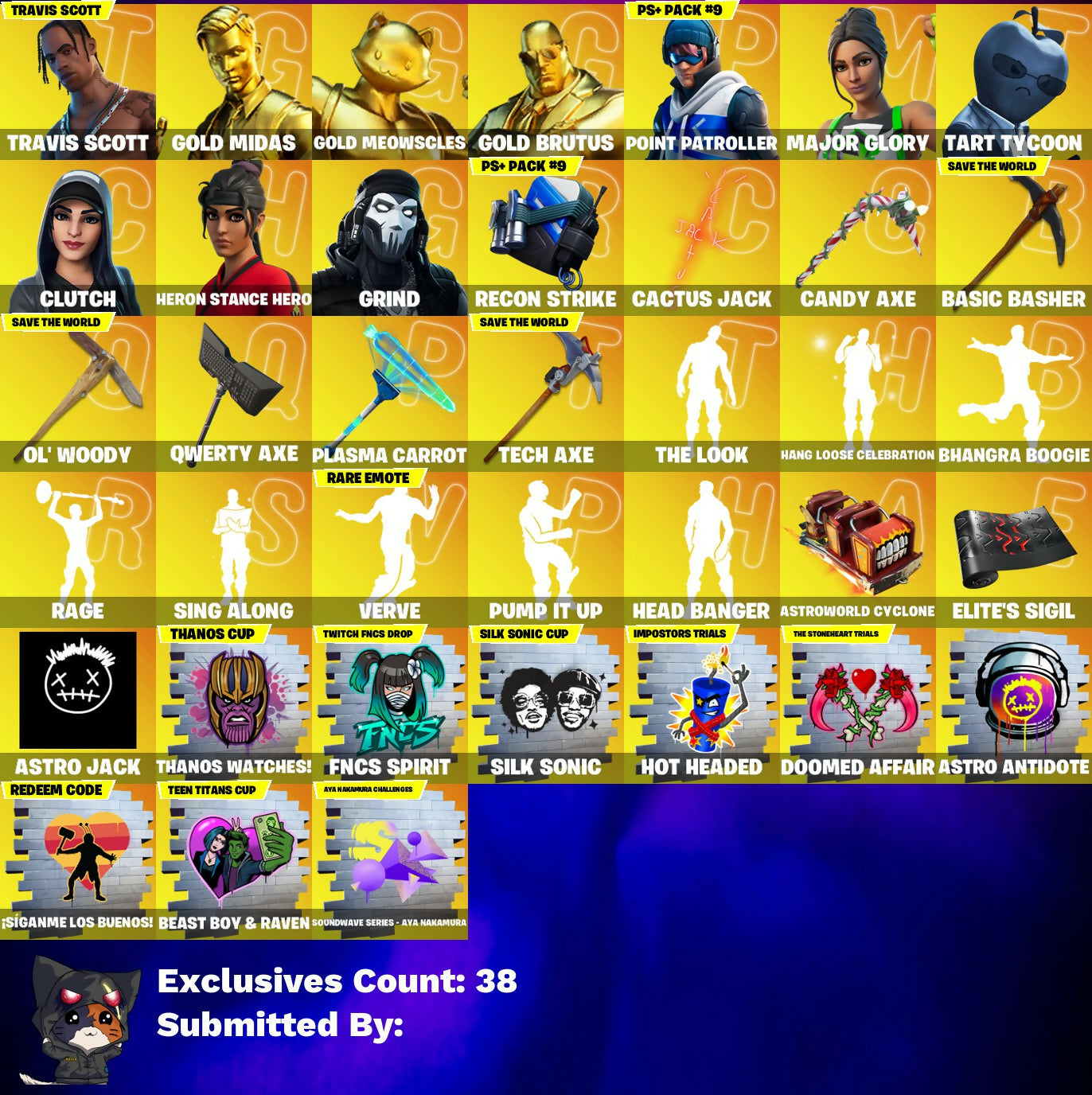 💥🌟 EXCLUSIVE OFFER 🌟💥 177 SKINS 💎 TRAVIS SCOTT 💎 GOLD MIDAS 💎 CANDY AXE 💎 GOLD BRUTUS 💎 POINT PATROLLER 💎 MAJOR GLORY 💎 TART TYCOON 💎 CLUTCH 💎 HERON STANCE HERO 💎 FULL ACCESS 💎