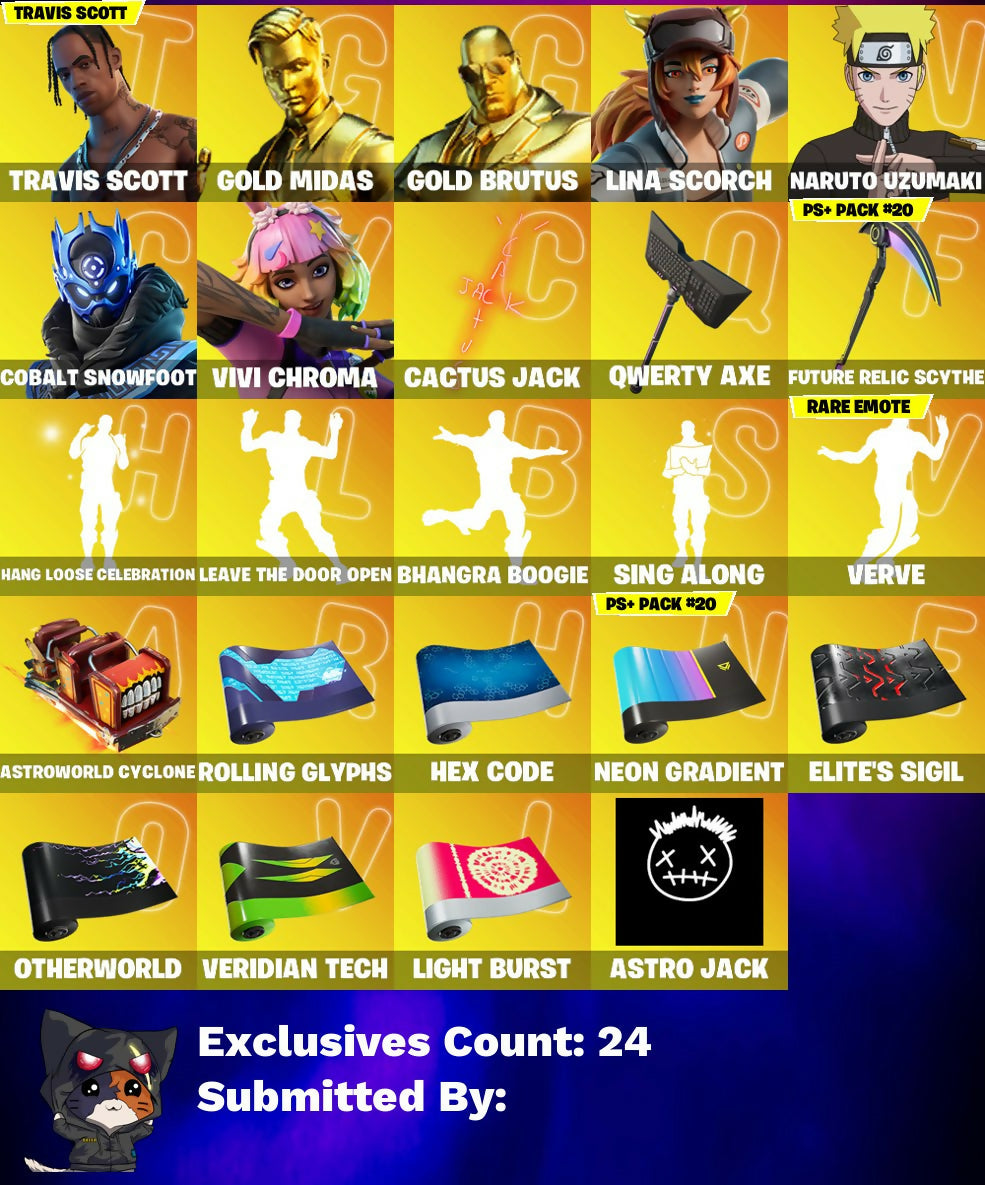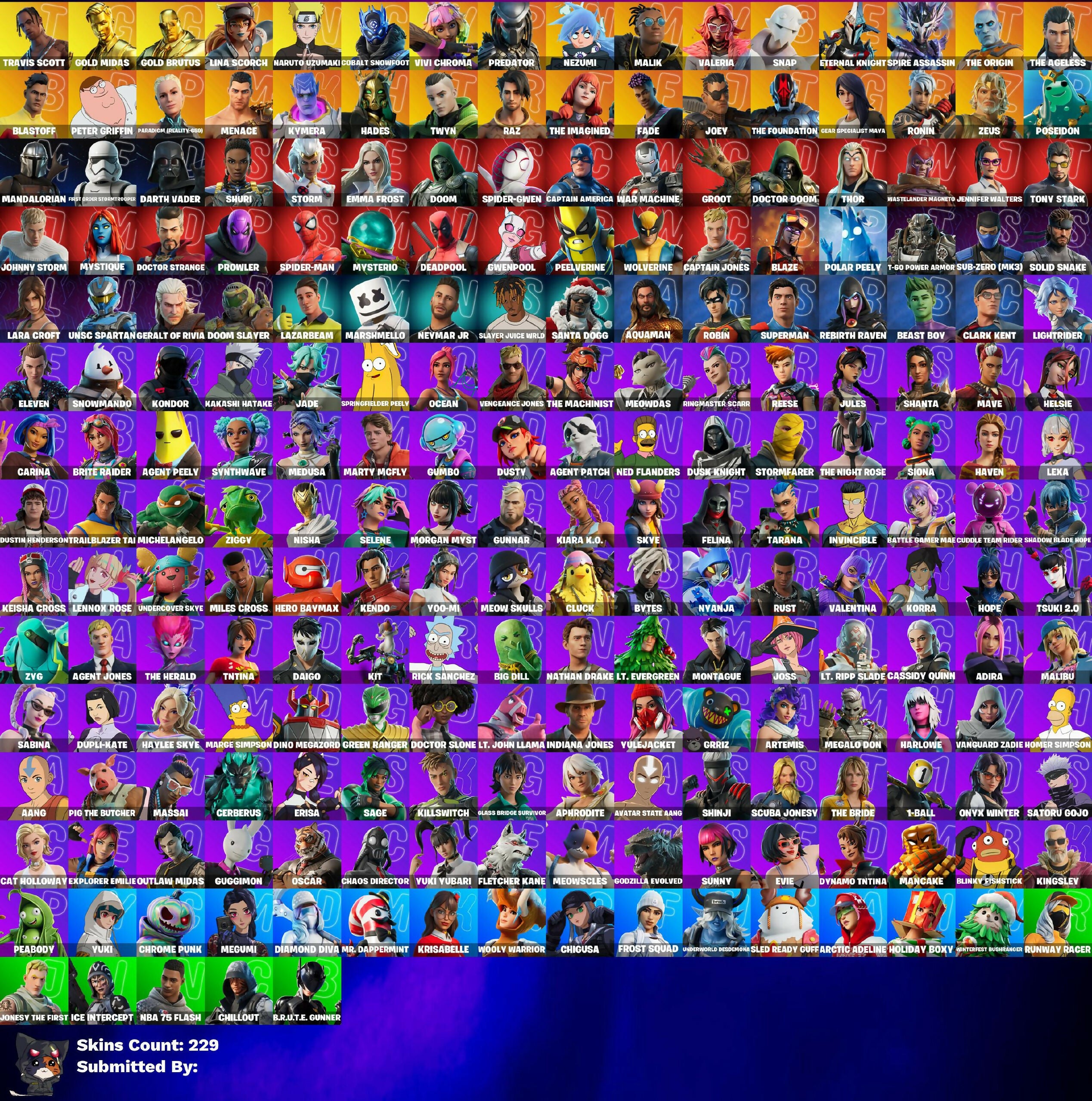 💥🌟 EXCLUSIVE OFFER 🌟💥 229 SKINS 💎 TRAVIS SCOTT 💎 GOLD MIDAS 💎 GOLD BRUTUS 💎 LINA SCORCH 💎 NARUTO UZUMAKI 💎 COBALT SNOWFOOT 💎 VIVI CHROMA 💎 PREDATOR 💎 NEZUMI💎 FULL ACCESS 💎
