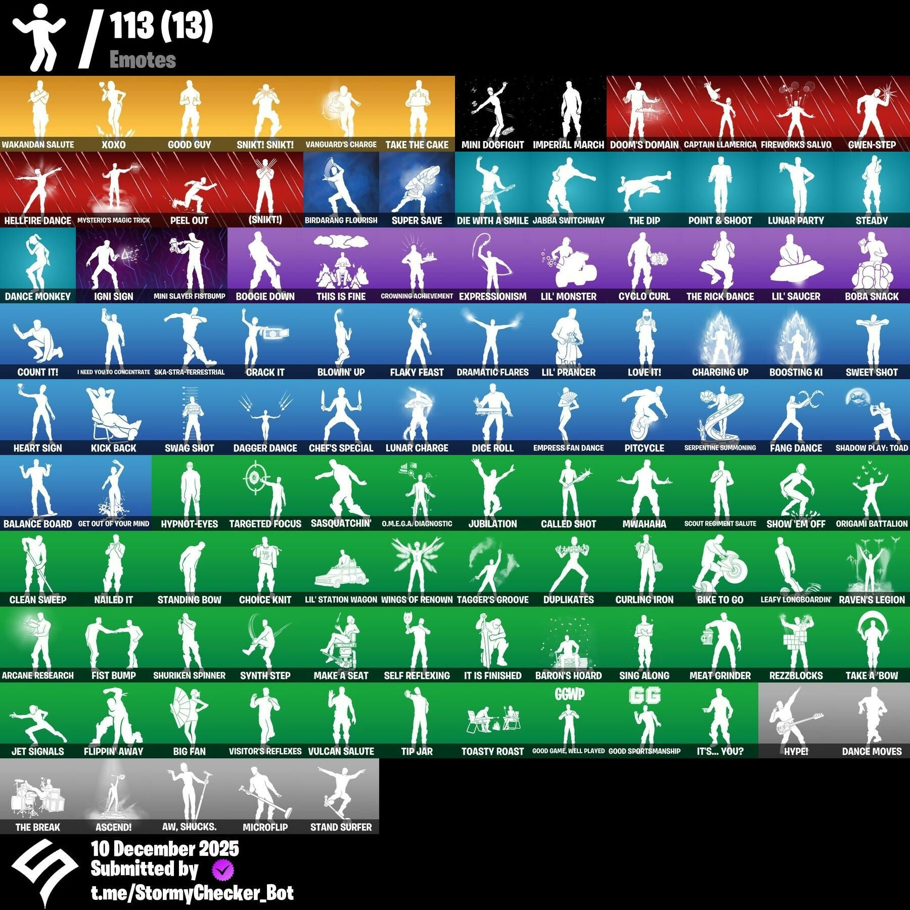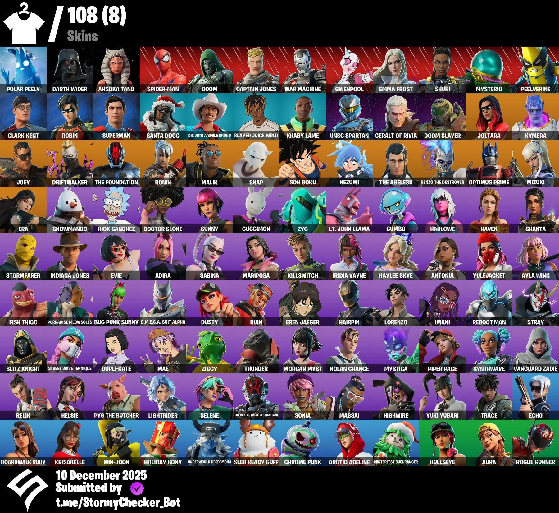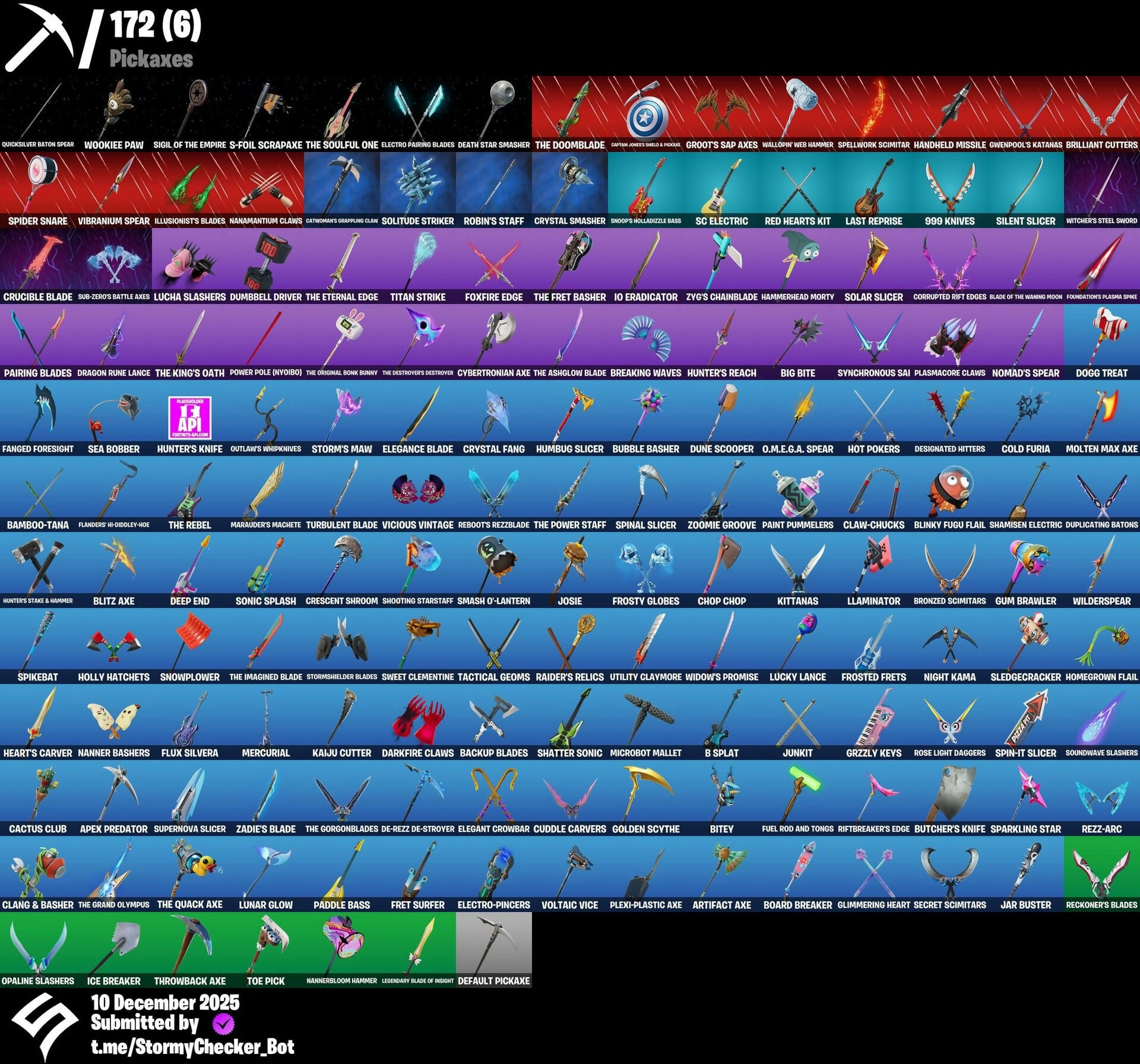 108 Skins | Mariposa | Santa Dogg | Doom | Nezumi | Killswitch | Default Pickaxe | Reckoner's Blades | Lucha Slashers | 750 VB