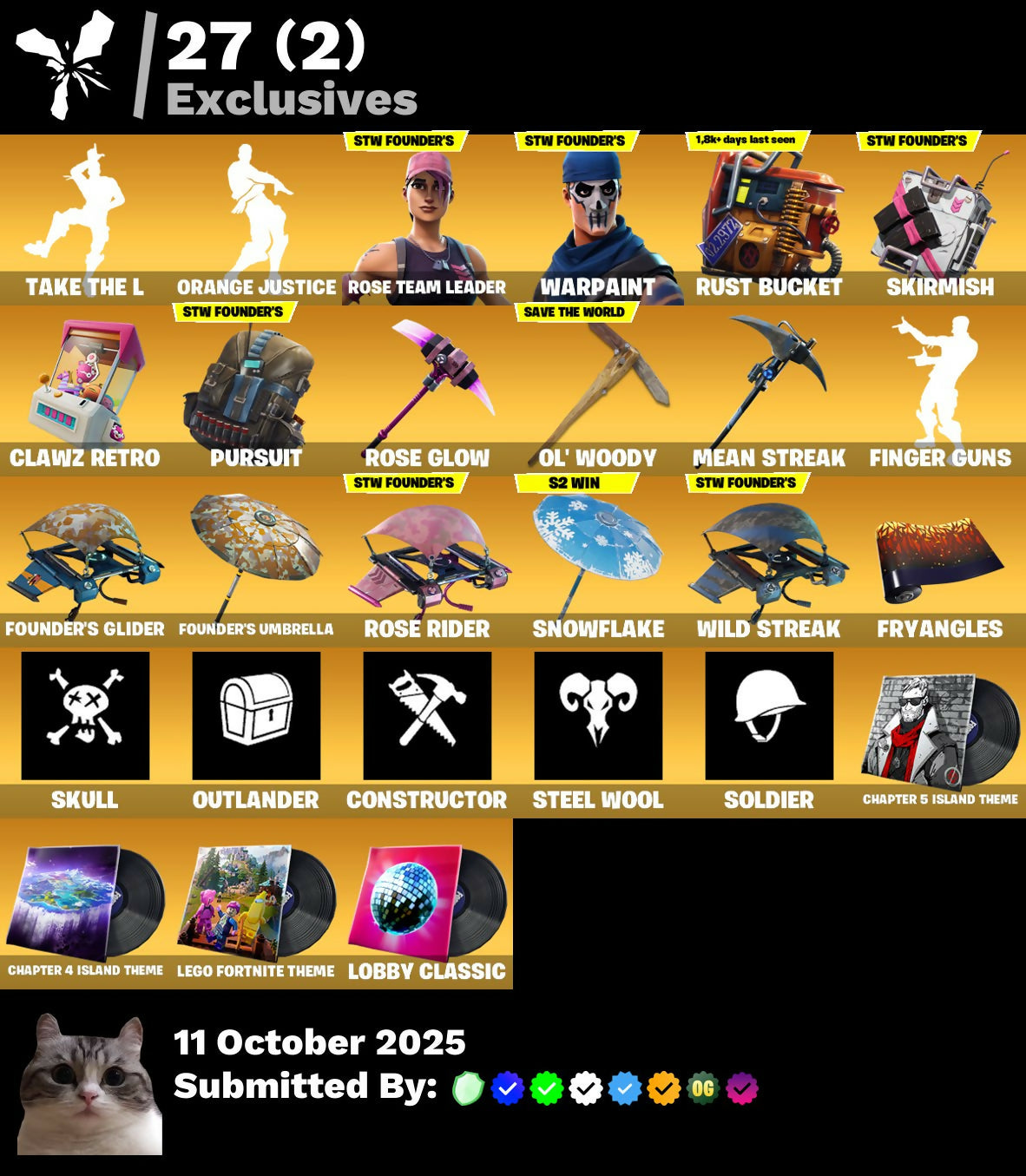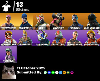 13 Skins โญ๏ธ OG STW - Take The L - Drift - Orange Justice - Calamity - Carbide - Dark Voyager - Moonwalker - Huntress - DJ Yonder - Rust Lord - Battlehawk