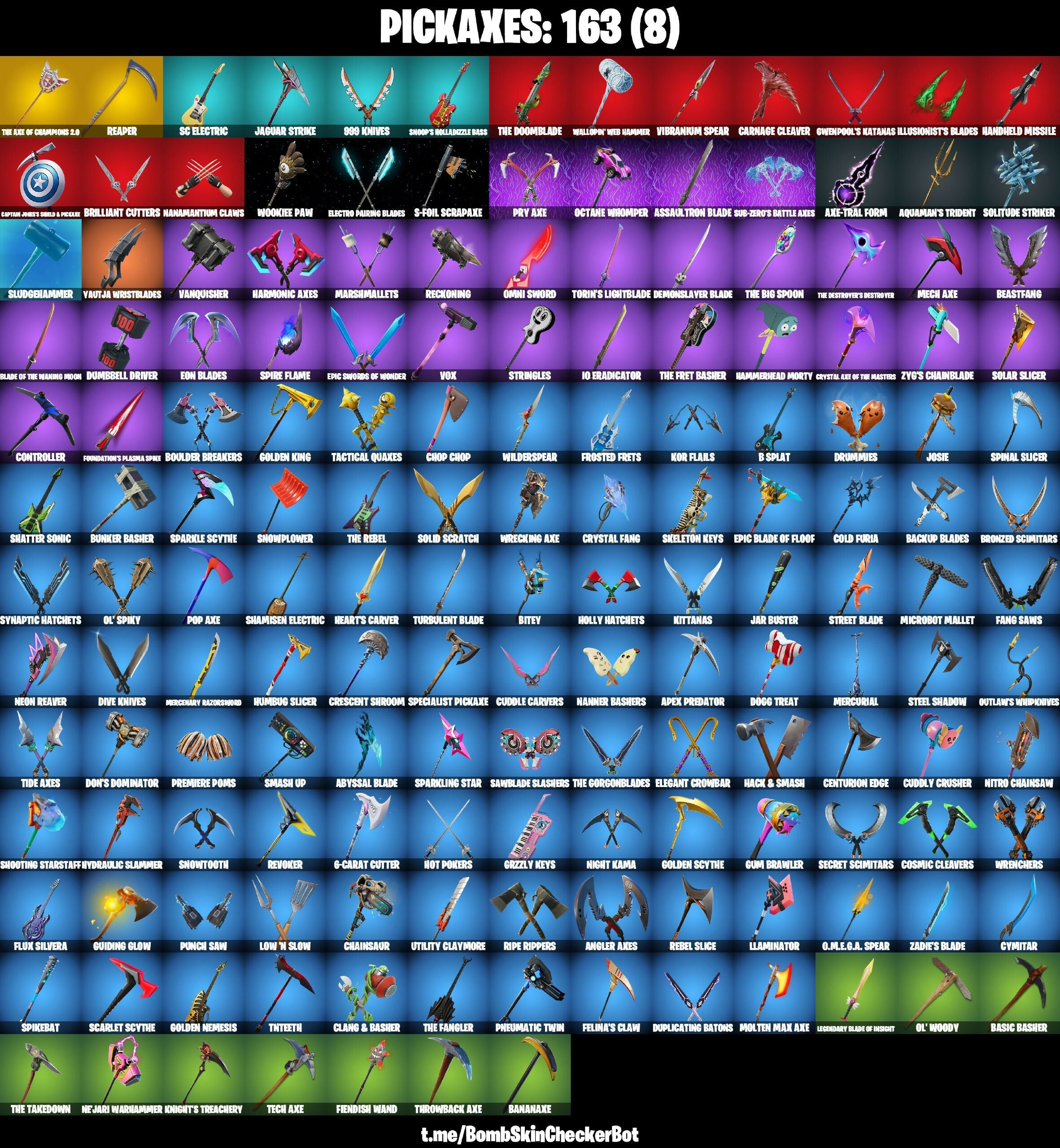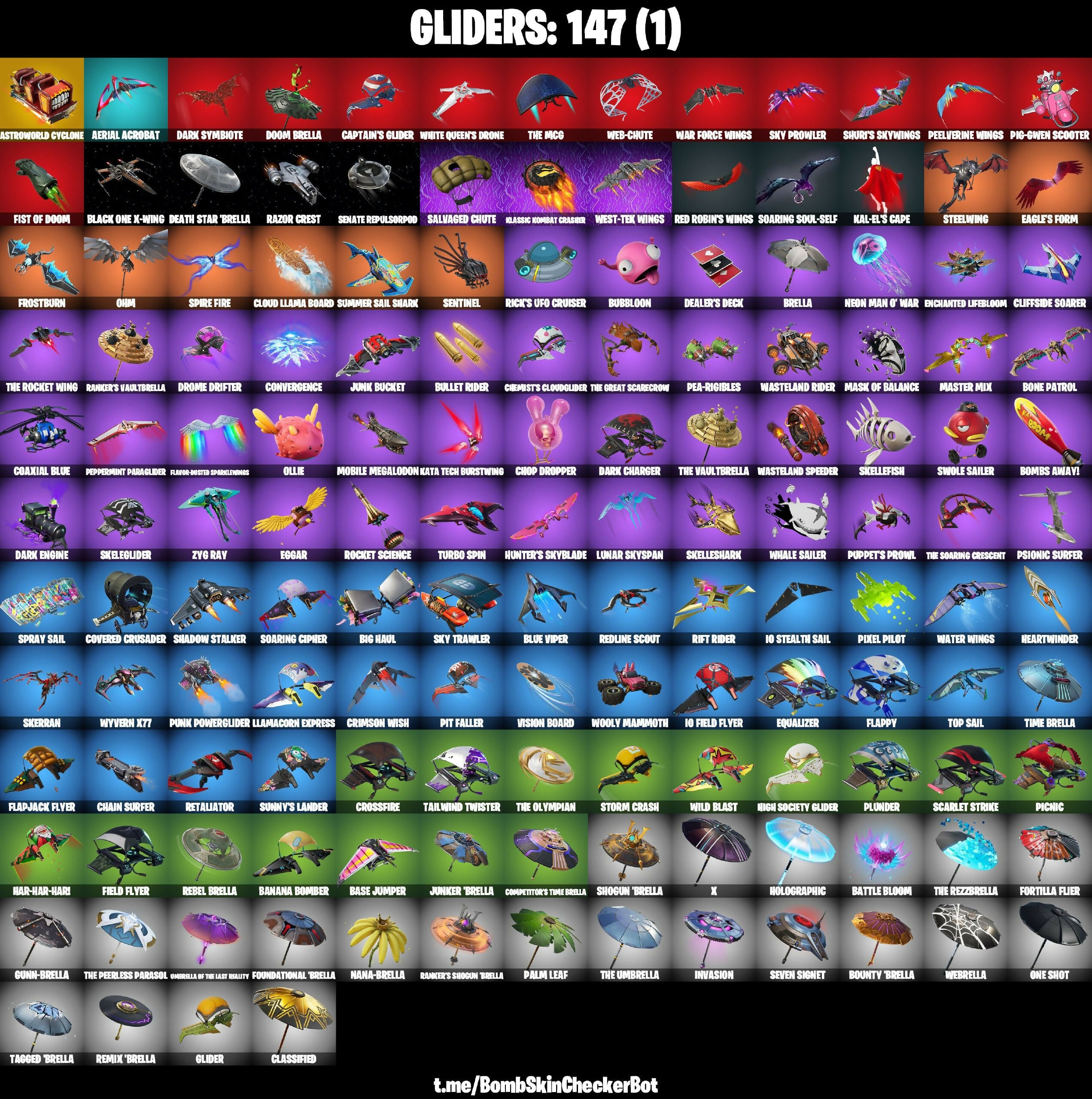 (Snikt!), 10 Field Flyer, 10 Stealth Sail, 6-Carat Cutter, 999 Knives, Absenz, Abyssal Blade, Aerial Acrobat, Agent Jones, Agent Peely, Air Shredder, Angler Axes, Apex Predator, Aquaman, Aquaman's Trident, Assaultron Blade, Astroworld Cyclone, Axe-Tral Form, Azarath Metron Zinthos!, B Splat, Backup Blades, Banana Bomber, Bananaxe, Baron's Hoard, Base Jumper, Basic Basher, Battle Bloom, Bb Belt, Bean Bag, Beastfang, Beep Beep, Big Haul, Bike To Go, Billy Bounce, Birds Of A Feather, Bitey, Black One X-Wing, Blade of the Waning Moon, Blizzard Bomber, Blowing Bubbles, Blue Viper, Bombs Away!, Bone Patrol, Boobytrapped, Boogeyman, Boogie Down, Boomin', Boots 'N' Cats, Boulder Breakers, Bouncer, Bounty 'Brella, Breakneck, Breakpoint, Brella, Brilliant Cutters, Brite Moves, Brite Raider, Bronzed Scimitars, Brutus (Fully Golden), Bubbloon, Bullet Rider, Bunker Basher, Bunker Jonesy, Calamity, Call Me, Captain Jones, Captain Jones's Shield & Pickaxe, Captain Llamerica, Captain's Glider, Carbon Commando, Cardistry, Carnage, Carnage Cleaver, Catalyst, Cauldron Chill, Centurion, Centurion Edge, Chain Surfer, Chainsaur, Charlotte, Chemist's Cloudglider, Choice Knit, Chop Chop, Chop Dropper, Clang & Basher, Clark Kent, Classic Kombat Crasher, Classified, Clean Sweep, Cliffside Soarer, Cloud Llama Board, Cloud Striker, Cluck, Cluck Strut, Coaxial Blue, Codsworth's Cleanup, Coin Flip, Cold Furia, Competitor's Time Brella, Controller, Convergence, Cosmic Cleavers, Covered Crusader, Crescent Shroom, Criminals, Crimson Wish, Crossfire, Crowning Achievement, Crystal Axe of The Masters, Crystal Fang, Cuddle Carvers, Cuddly Crusher, Cyclo Curl, Cymitar, Dabstand, Dali, Dara, Dark Charger, Dark Engine, Dark Symbiote, Deadpool, Dealer's Deck, Death Star 'Brella, Deep End, Demi, Demonslayer Blade, Diamond Diva, Distracted, Dive Knives, Dizzie, Dj Yonder, Doctor Slone, Dogg Treat, Don's Dominator, Doom, Doom Brella, Doom's Domain, Doze Dab, Drome Drifter, Droop, Drummies, Dumbbell Driver, Duplicating Batons, Dusk, Eagle's Form, Eggar, Electro Pairing Blades, Elegant Crowbar, Emma Frost, Enchanted Lifebloom, Eon Blades, Epic Blade of Floof, Epic Swords Of Wonder, Equalizer, Eternal Voyager, Evasive Maneuvers, Ex, Fabio Sparklemane, Fable, Fade, Fang Saws, Featherweight, Felina, Felina’s Claw, Field Flyer, Fiendish Wand, Fire Show, Fireworks Salvo, Fist Bump, Fist of Doom, Fixer, Flapjack Flyer, Flappy, Flavor-Dusted Sparklewings, Flippin' Away, Flux Silvera, Foil Flex, Fortilla Flier, Foundation's Plasma Spike, Foundational 'Brella, Frostburn, Frosted Frets, Gear Specialist Maya, Giddy-Up, Glider, Glow, Golden King, Golden Nemesis, Golden Scythe, Golf Clap, Good Guy, Grizzly Keys, Gugimon, Guiding Glow, Gum Brawler, Gumbo, Gunn-Brella, Gunnar, Gwen-Step, Gwenpool, Gwenpool's Katanas, Hack & Smash, Hammerhead Morty, Hand-Forged, Handheld Missile, Hang Loose Celebration, Har-Har-Har!, Harlo We, Harmonic Axes, Harry Kane, Haven, Head Banger, Heart Sign, Heart's Carver, Heartburst, Heartwinder, Hellfire Dance, Hello Friend, High Five, High Society Glider, Holiday Boxy, Holly Hatchets, Holographic, Hot Pokers, Humbug Slicer, Hunter's Skyblade, Hydraulic Slammer, IO Eradicator, Illusionist's Blades, Invasion, Iris, It Is Finished, It's Go Time!, It's... You?, J.B. Chimpanski, Jaguar Strike, Jar Buster, Jaywalking, Jet Signals, Joey, Josie, Journey Vs Hazard, Jubilation, Jules, Jump Jets, Junk Bucket, Junker 'Brella, Kal-El's Cape, Karateka Jones, Kata Tech Burstwing, Kick Back, Kittanas, Knight’s Treachery, Kondor, Kor, Kor Flails, Krisabelle, Kymera, Laid Back Shuffle, Lara Croft, Legendary Blade Of Insight, Lil' Monster, Lil' Prancer, Lil' Rover, Lil' Saucer, Llamacorn Express, Llaminator, Lock It Up, Love It!, Low 'N Slow, Lt. John Llama, Lunar Charge, Lunar Skyspan, Make A Seat, Mancake, Mandalorian, Marshmallets, Mashed Potato, Mask of Balance, Master Mix, Mave, Mech Axe, Megalo Don, Meowscles, Mercenary Razorsword, Mercurial, Microbot Mallet, Midas (Fully Golden), Mini Dogfight, Mobile Megalodon, Molten Max Axe, Monarch, Mwahaha, Mysterio, Mysterio's Magic Trick, Nailed It, Nana-Brella, Nanamatnium Claws, Nanner Bashers, Neon Man O' War, Neon Reaver, Neymar Jr, Ne’Jari Warhammer, Night Kama, Nitro Chainsaw, O.M.E.G.A. Spear, Ocean, Octane Whomper, Ohm, Ol' Spiky, Ol' Woody, Ollie, Omni Sword, One Shot, Out With The Old, Outlaw's Whipknives, Palm Leaf, Pandemonium, Paws & Claws, Pea Part Harmony, Pea-Rigibles, Peabody, Peace Out, Peel Out, Peelverine Wings, Peppermint Paraglider, Pfeilvrine, Picnic, Pig-Gwen Scooter, Pit Faller, Pixel Pilot, Plunder, Pneumatic Twin, Point Patroller, Polar Peely, Pop Axe, Predator, Premiere Poms, Prodigy, Prowler, Pry Axe, Psionic Surfer, Punch Saw, Punk Powerglider, Puppet's Prowl, Quackling, Rage, Rage Quit, Ranker's Shogun 'Brella, Ranker's Vaultbrella, Raven's Legion, Raz, Razor Crest, Ready When You Are, Reaper, Rebel Brella, Rebel Slice, Rebirth Raven, Reckoning, Red Card, Red Robin's Wings, Red Strike, Redline Scout, Reese, Regal Wave, Remedy Vs Toxin, Remix 'Brella, Respect The Peace, Retaliator, Revoker, Rick Sanchez, Rick's UFO Cruiser, Rift Rider, Ringmaster Scarr, Ripe Rippers, Rippley Vs Sludge, Rocket Science, Rollie, Ronin, Rox, Ruby, Running Man, Runway Racer, Rust, S-Foil Scrapaaxe, SC Electric, Sad Trombone, Salvaged Chute, Santa Dogg, Savage, Sawblade Slashers, Scarlet Defender, Scarlet Scythe, Scarlet Strike, Scuba Jonesy, Secret Scimitars, Seeker, Senate Repulsorpod, Sentinel, Seven Signet, Shadow Stalker, Shake & Split, Shamisen Electric, Shanta, Shatter Sonic, Shogun 'Brella, Shooting Starstaff, Show 'Em Off, Shuri, Shuri's Skywings, Side Hustle, Side Stride, Sign Spinner, Silas-Stra-Terrestrial, Sing Along, Singularity, Skeleglider, Skeleton Keys, Skellefish, Skelleshark, Skerran, Skull Trooper, Sky Prowler, Sky Trawler, Skye, Slayer Juice Wrld, Sled Ready Guff, Slitherin', Sludgehammer, Smash Up, Snikt! Snikt!, Snoop's Holladazzle Bass, Snowplower, Sno