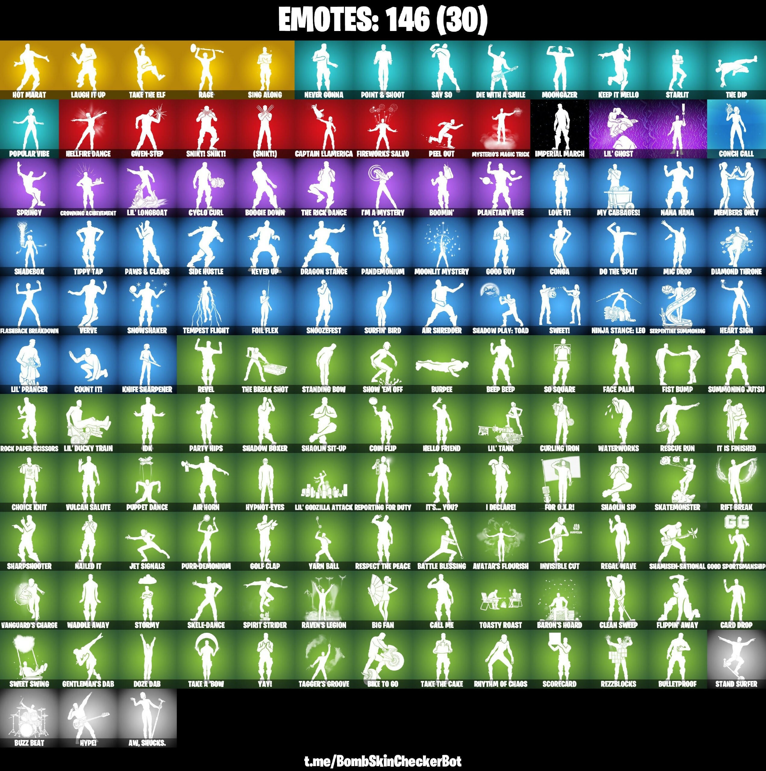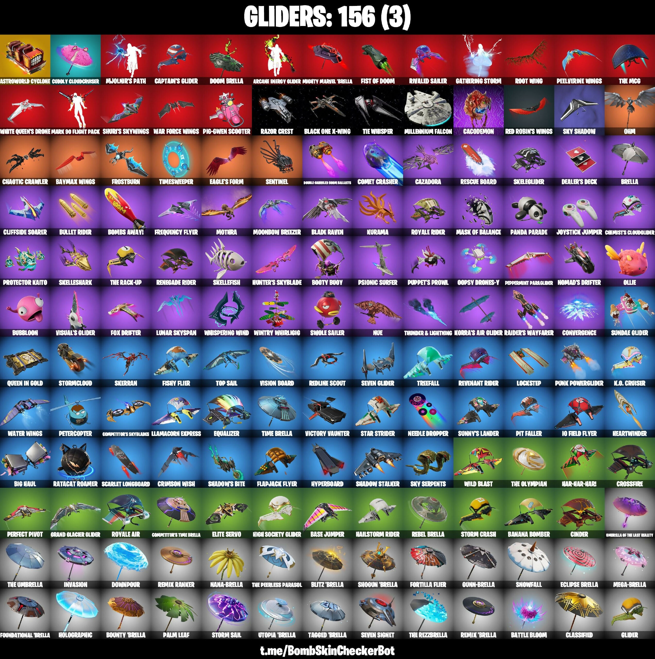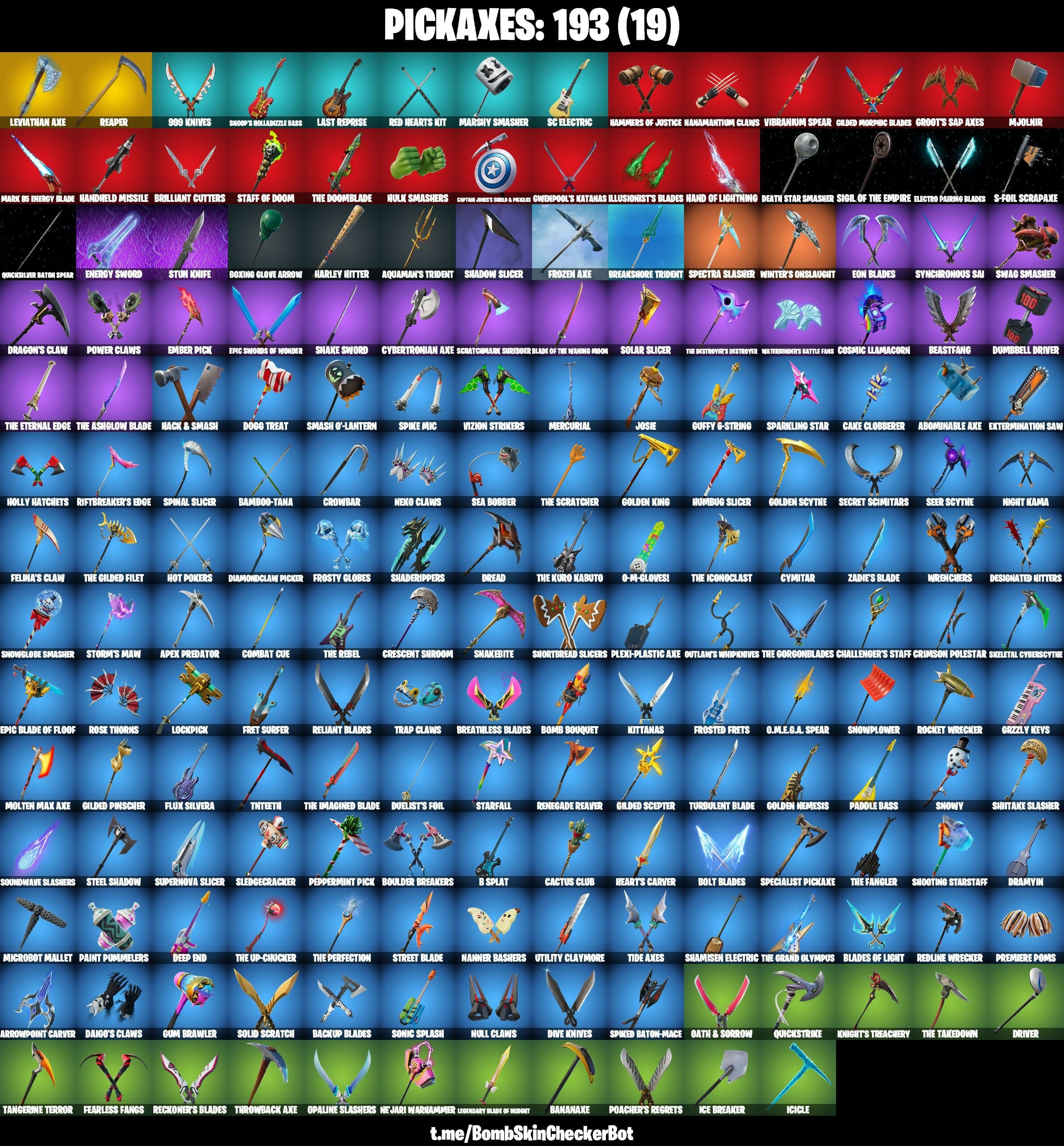 (Snikt!), 1-Ball, 10 Field Flyer, 999 Knives, Abominable Axe, Aerial Assault Bomber, Agent Patch, Agent Peely, Air Horn, Air Shredder, Apex Predator, Aphrodite, Aquaman, Aquaman's Trident, Arcane Energy Glider, Arctic Adeline, Arrowpoint Carver, Artemis, Astro Jack, Astroworld Cyclone, Augury, Avatar's Flourish, Aw, Shucks., B Splat, Backup Blades, Bamboo-Tana, Banana Bomber, Bananaxe, Baron's Hoard, Base Jumper, Battle Blessing, Battle Bloom, Battle Gamer Mae, Baymax Wings, Beastfang, Beep Beep, Bernie, Big Fan, Big Haul, Bike To Go, Birdie, Black One X-Wing, Blackheart, Blacklight, Blade Of The Waning Moon, Blade Raven, Blades Of Light, Blitz 'Brella, Blitz Knight, Blizzabelle, Bolt Blades, Bomb Bouquet, Bombs Away!, Boogie Down, Boomin', Booty Buoy, Boulder Breakers, Bounty 'Brella, Boxing Glove Arrow, Breachshore Trident, Breathless Blades, Brella, Brilliant Cutters, Brite Bomber, Brutus (Fully Golden), Bubbloon, Bullet Rider, Bulletproof, Burpee, Buzz Beat, Cacodemon, Cactus Club, Cake Clobberer, Call Me, Captain America's Shield & Pickaxe, Captain Jones, Captain Llamerica, Captain's Glider, Card Drop, Catrina, Cazadora, Cerberus, Challenger's Staff, Chaos Director, Chaotic Crawler, Chemist's Cloudglider, Chill Challenger, Choice Knit, Chrome Punk, Cinder, Classified, Clean Sweep, Cliffside Soarer, Coin Flip, Color Crush, Combat Cue, Comet Crasher, Competitor's Skyblades, Competitor's Time Brella, Conch Call, Conga, Convergence, Cosmic Llamacorn, Count It!, Crescent Shroom, Crimson Polestar, Crimson Wish, Crossfire, Crowbar, Crowning Achievement, Cryptic, Crystal, Cuddly Cloudcruiser, Curling Iron, Cybertronian Axe, Cyclo Curl, Cymitar, Daigo, Daigo's Claws, Danica, Dark Bomber, Dark Doggo, Deadpool, Dealer's Deck, Death Star Smasher, Deep End, Designated Hitters, Diamond Throne, Diamondclaw Picker, Die With A Smile, Die With A Smile Bruno, Dive Knives, Do The 'Split, Doctor Doom, Dogg Treat, Doom, Doom Brella, Downpour, Doze Dab, Dragon Stance, Dragon's Claw, Dramyin, Dread, Driver, Duelist's Foil, Dumbbell Driver, Dynamo Tintina, Eagle's Form, Eclipse Brella, Electro Pairing Blades, Elite Servo, Ember, Ember Pick, Emma Frost, Energy Sword, Eon Blades, Epic Blade Of Floof, Epic Swords Of Wonder, Equalizer, Eternal Knight, Explorer Emile, Extermination Saw, Face Palm, Fade, Fearless Fangs, Felina, Felina's Claw, Fireworks Salvo, Fishy Flier, Fist Bump, Fist Of Doom, Flapjack Flyer, Flashback Breakdown, Flippin' Away, Flux Silvera, Foil Flex, For O.X.R!, Fortilla Flier, Foundational 'Brella, Fox Drifter, Frequency Flyer, Fret Surfer, Frostburn, Frosted Frets, Frosty Globes, Frozen Axe, Galaxia, Gathering Storm, Gear Specialist Maya, Gentleman's Dab, Gilded Morphic Blades, Gilded Pinscher, Gilded Scepter, Glider, Godzilla Evolved, Golden King, Golden Nemesis, Golden Scythe, Golf Clap, Good Guy, Good Sportsmanship, Grand Glacier Glider, Green Arrow, Grizzly Keys, Groot, Groot's Sap Axes, Guff Gringle, Guffy G-string, Gum Brawler, Gunn-Brella, Gwen-Step, Gwenpool, Gwenpool's Katanas, Hack & Smash, Hailstorm Rider, Hammers Of Justice, Hand Of Lightning, Handheld Missile, Har-Har-Har!, Harley Hitter, Heart Sign, Heart's Carver, Heartwinder, Hellfire Dance, Hello Friend, Hero Baymax, High Society Glider, Holiday Boxy, Holly Hatchets, Holographic, Hop And A Wink, Hope, Hot Marat, Hot Pokers, Hulk Smashers, Humbug Slicer, Hunter's Skyblade, Hybrid, Hype!, Hyperboard, Hypnot-Eyes, I Declare!, I'm A Mystery, IDK, Ice Breaker, Icicle, Illusionist's Blades, Imperial March, Invasion, Invisible Cut, It Is Finished, It's... You?, Jackie, Jade, Jellie, Jennifer Walters, Jet Signals, Josie, Joystick Jumper, Jules, K.O. Cruiser, Keep It Mello, Kendo, Keyed Up, Kit, Kittanas, Knife Sharpener, Knight's Treachery, Kondor, Korra, Krisabelle, Kurama, Last Reprise, Laugh It Up, Legendary Blade Of Insight, Leviathan Axe, Lexa, Lil Split, Lil' Ducky Train, Lil' Ghost, Lil' Godzilla Attack, Lil' Longboat, Lil' Prancer, Lil' Tank, Llamacorn Express, Lockpick, Lockstep, Love It!, Lt. Evergreen, Lunar Skyspan, Mancake, Mandalorian, Mark 85 Energy Blade, Marshy Smasher, Mask Of Balance, Master Key, Mave, Medusa, Mega-Brella, Members Only, Meowdas, Meowscles (Fully Golden), Mercurial, Mic Drop, Microbot Mallet, Midas (Fully Golden), Midas' Shadow, Mighty Marvel Brella, Millennium Falcon, Mjolnir, Mjolnir's Path, Molten Max Axe, Moniker, Montague, Moonbow Brezzer, Moongazer, Moonlit Mystery, Morra's Air Glider, Mothra, Mr. Dappermint, My Cabbages!, Mysterio, Mysterio's Magic Trick, Mystique, Nailed It, Nana Nana, Nana-Brella, Nanner Bashers, Nanomantium Claws, Ne'Jari Warhammer, Needle Dropper, Neko Claws, Never Gonna, Night Kama, Ninja Stance: Leo, Nisia, Nomad's Drifter, Nue, Null Claws, Nyanja, O-M-gloves!, O.M.E.G.A. Spear, Oath & Sorrow, Ocean, Ohm, Ollie, Omegarok, Oopsy Drones-Y, Opaline Slashers, Oscar, Outlaw's Whipknives, Paddle Bass, Paint Pummelers, Palm Leaf, Panda Parade, Pandemonium, Par Patroller, Party Hips, Paws & Claws, Peel Out, Peelverine, Peelverine Wings, Peely, Peppermint Paraglider, Peppermint Pick, Per Aspera Ad Astra, Perfect Pivot, Peter Griffin, Petercopter, Pig-Gwen Scooter, Pink Ranger, Pit Faller, Planetary Vibe, Plexi-plastic Axe, Poacher's Regrets, Point & Shoot, Polar Peely, Popular Vibe, Poseidon, Power Claws, Predator, Premiere Poms, Protector Kaito, Psionic Surfer, Punk Powerglider, Puppet Dance, Puppet's Prowl, Purr-Demonium, Queen In Gold, Quicksilver Baton Spear, Quickstrike, Rage, Raider's Wayfarer, Ratacat Roamer, Raven's Legion, Razor Crest, Reaper, Rebel Brella, Reckoner's Blades, Red Hearts Kit, Red Jade, Red Robin's Wings, Redcap, Redline Racer, Redline Scout, Redline Wrecker, Reese, Regal Wave, Reliant Blades, Remix 'Brella, Remix Ranker, Renegade Lynx, Renegade Reaver, Renegade Rebel, Renegade Rider, Reporting For Duty, Rescue Board, Rescue Run, Respect The Peace, Revel, Revenant Rider, Rezzblocks, Rhythm Of Chaos, Rift Break, Riftbreaker's Edge, Riftreaver Drift, Riv